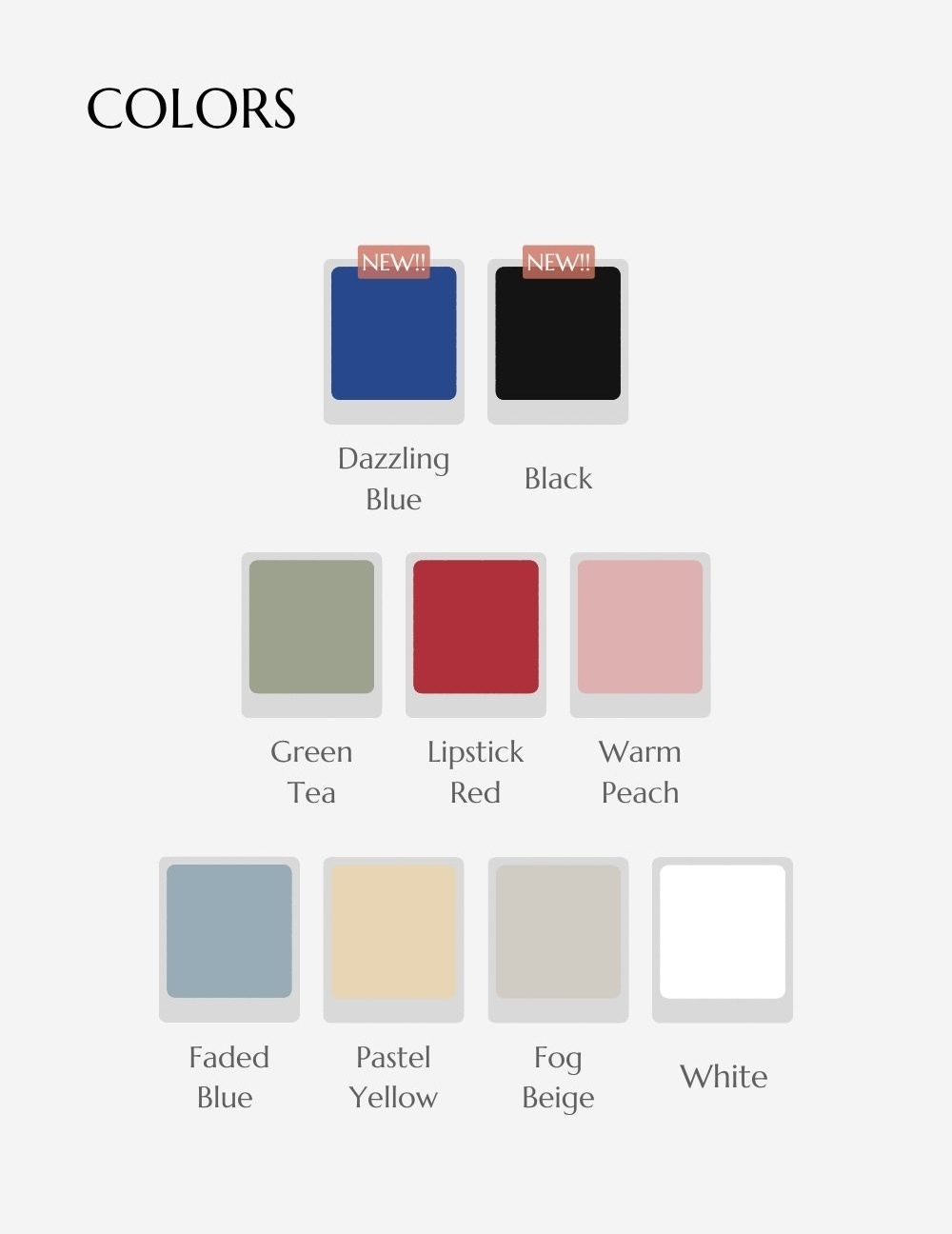 白 > 黑 > 鈷藍 > 杏黃 = 綠茶 > 夏日紅 > 淺牛仔藍 > 米灰 > 蜜桃粉