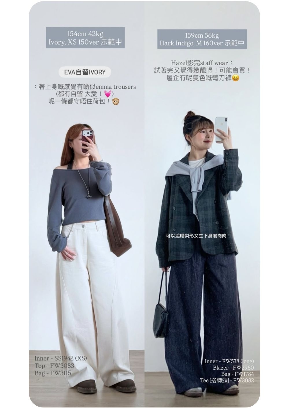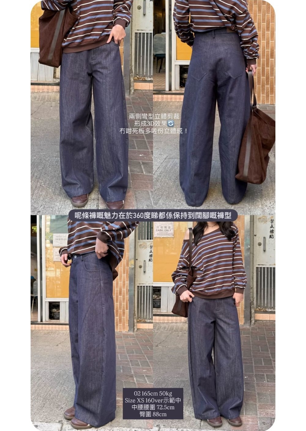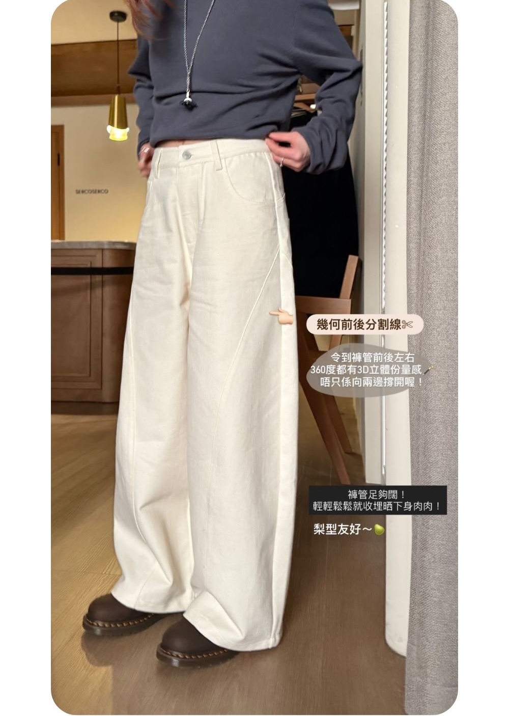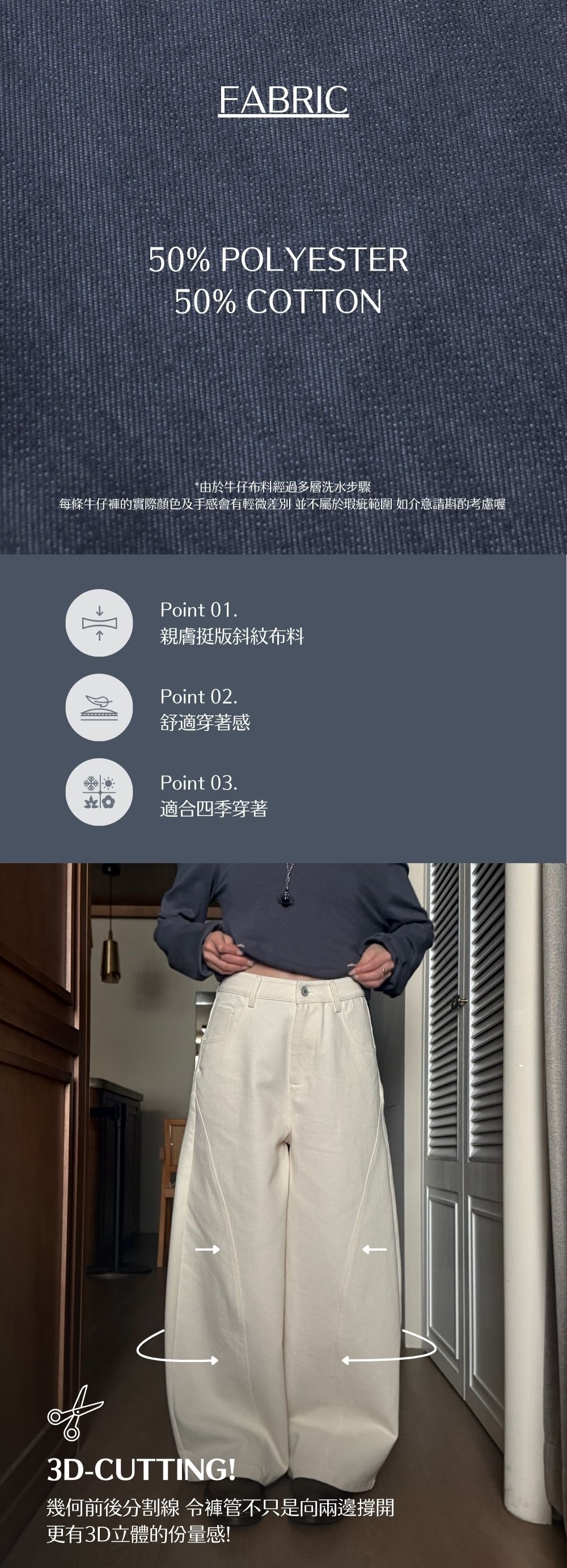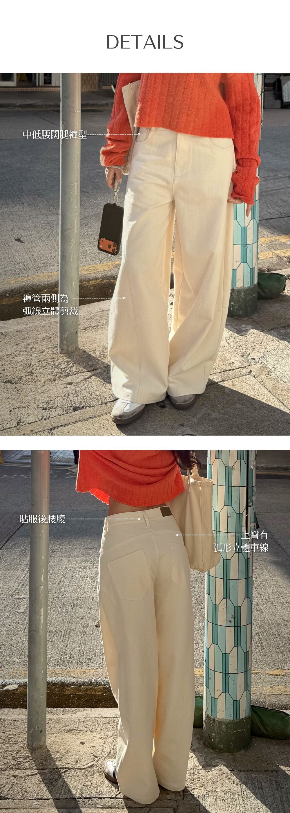中低腰闊腿褲型 / 褲管兩側為弧線立體剪裁 /