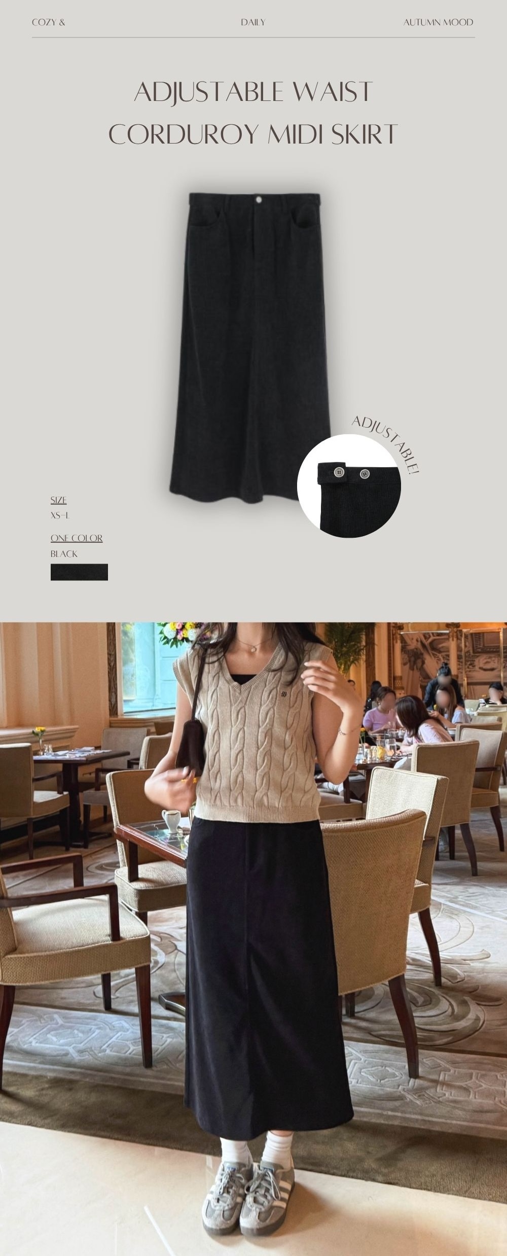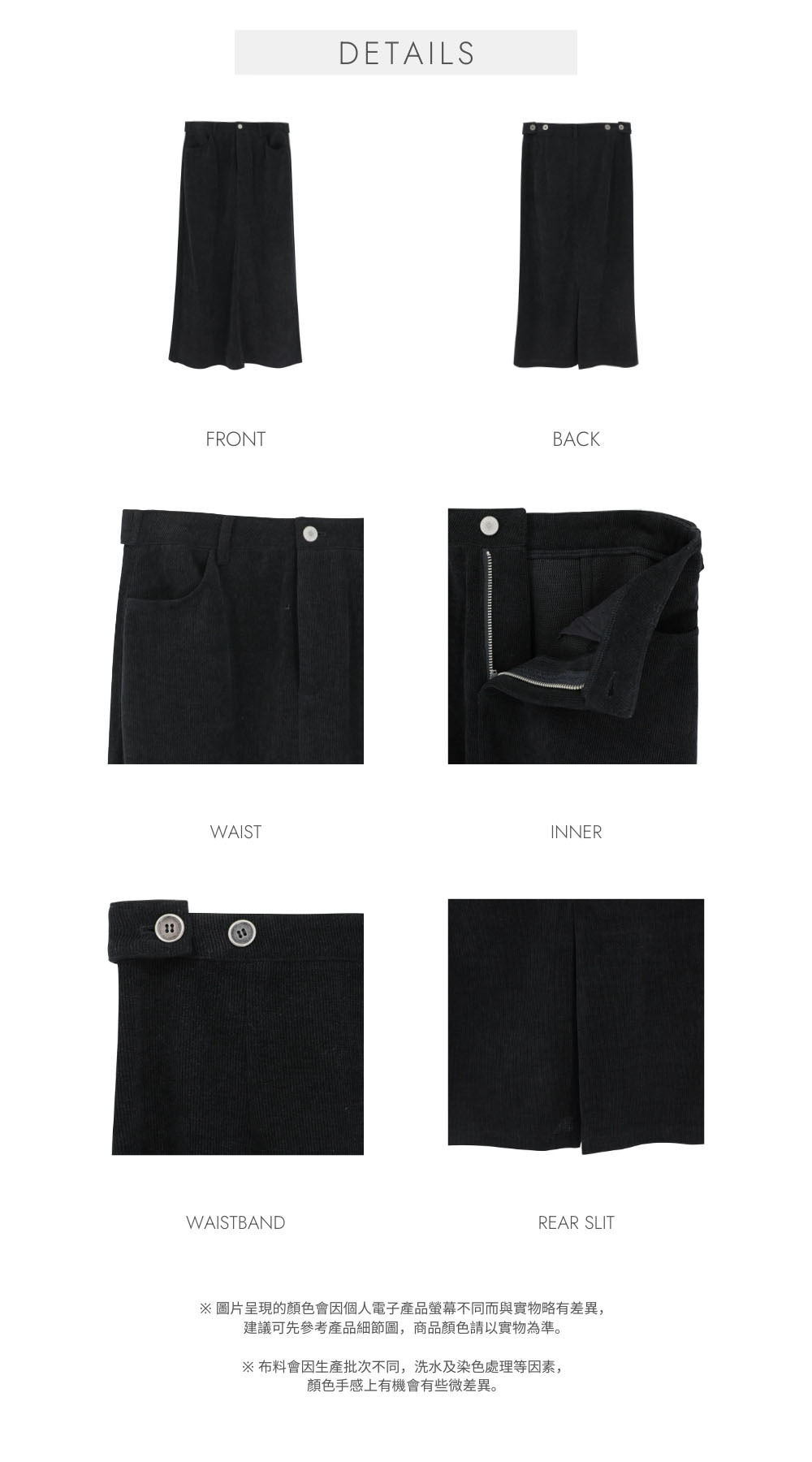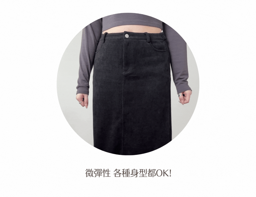 薄款 / 彈性燈芯絨布料 / 柔軟質地 / 後開衩設計 / 後腰有兩段式鈕扣
