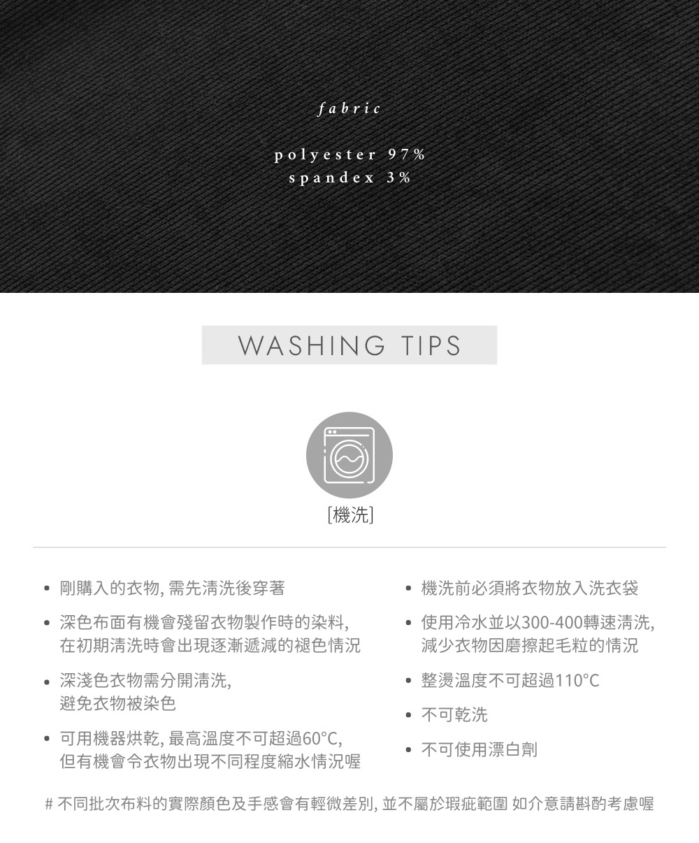 ※ 深色布料有機會殘留染制時的染料,會於初期清洗出現褪色情況並逐漸遞減喔
