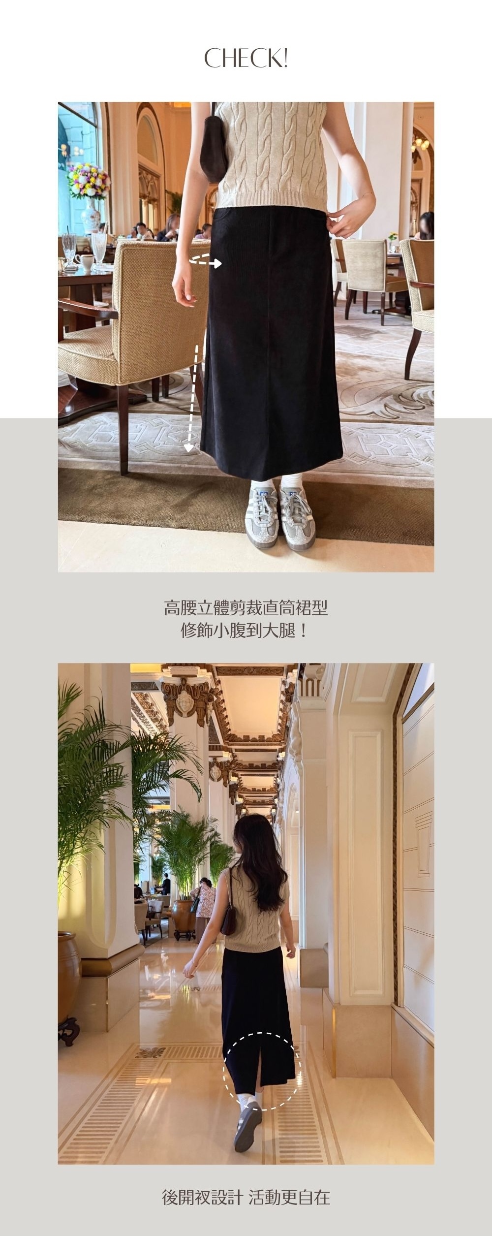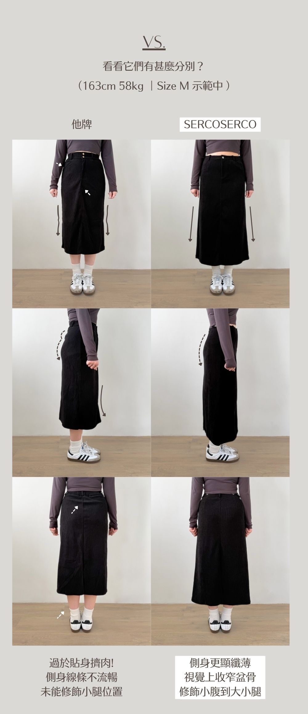 微修腰H字裙型 / 視覺上收窄盆骨 / 不顯臀型 / 貼服上臀圍 / 顯修長