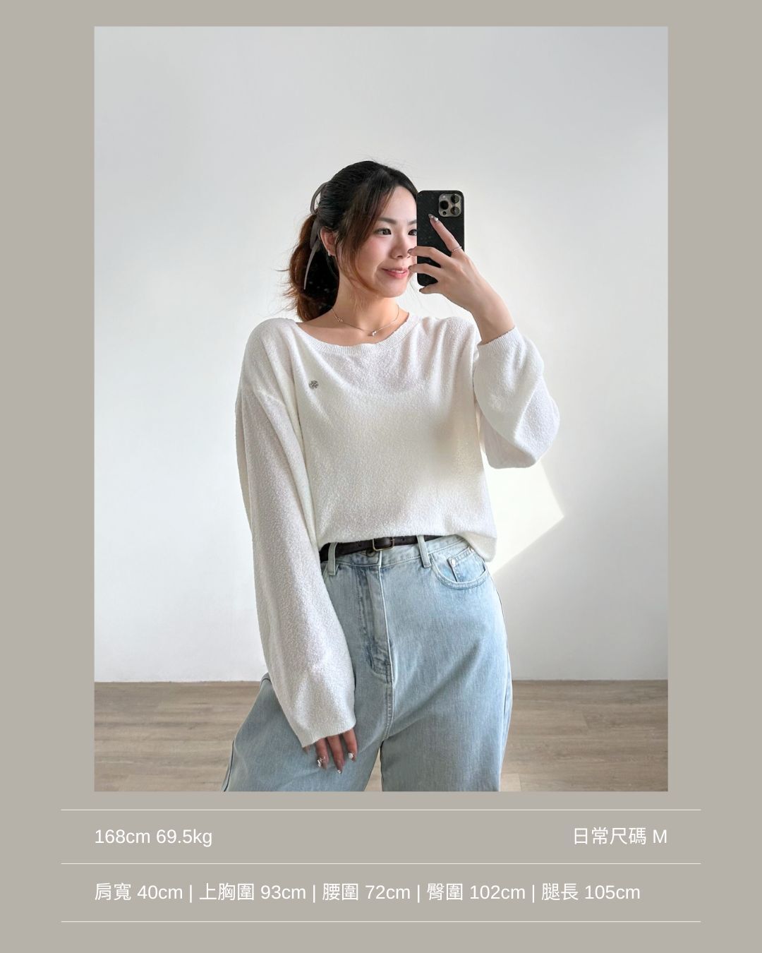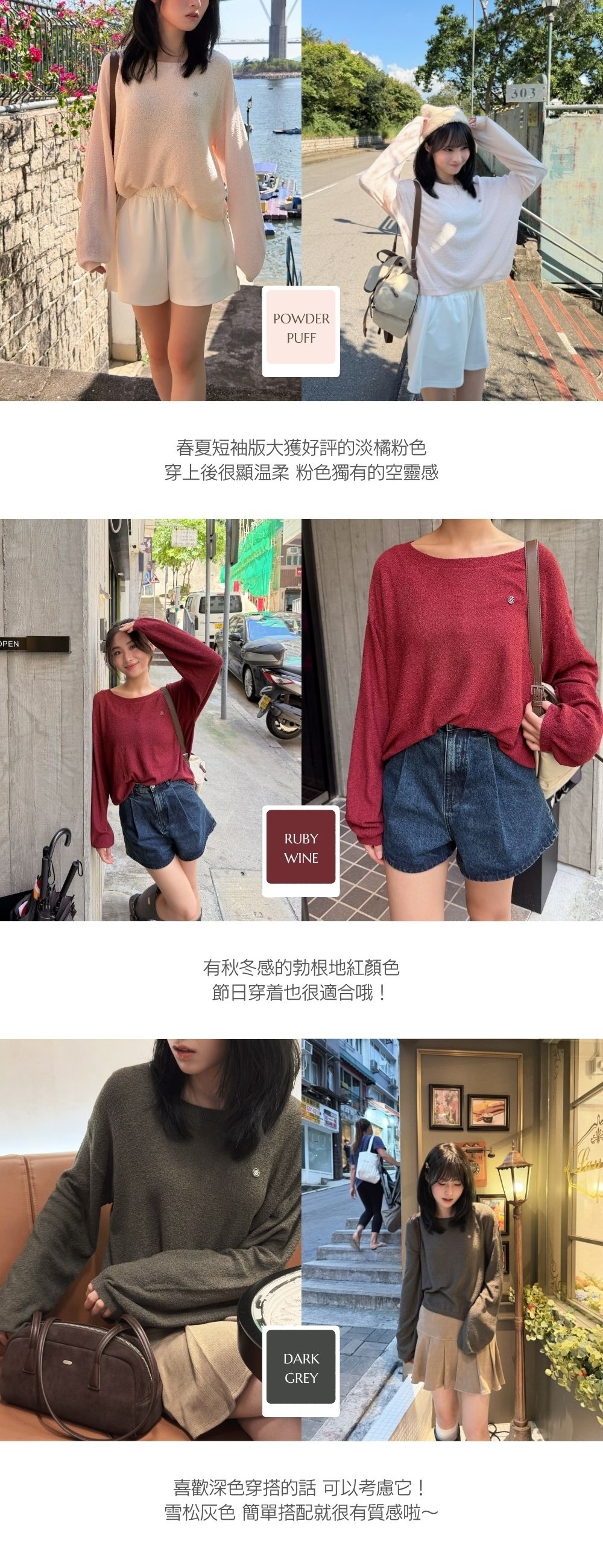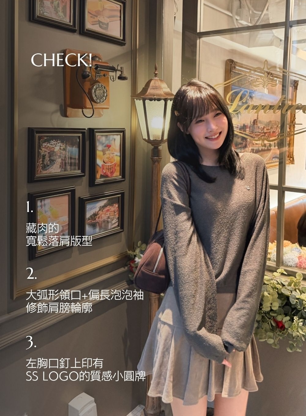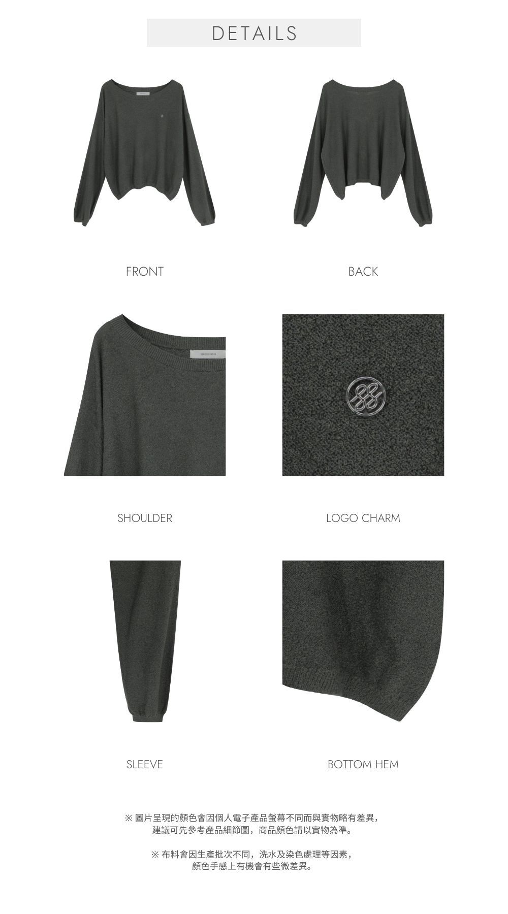 寬鬆落肩版型 / 大弧形領口設計 / 突顯肩膀輪廓 / 偏長泡泡袖型 / 品牌logo質感小圓牌