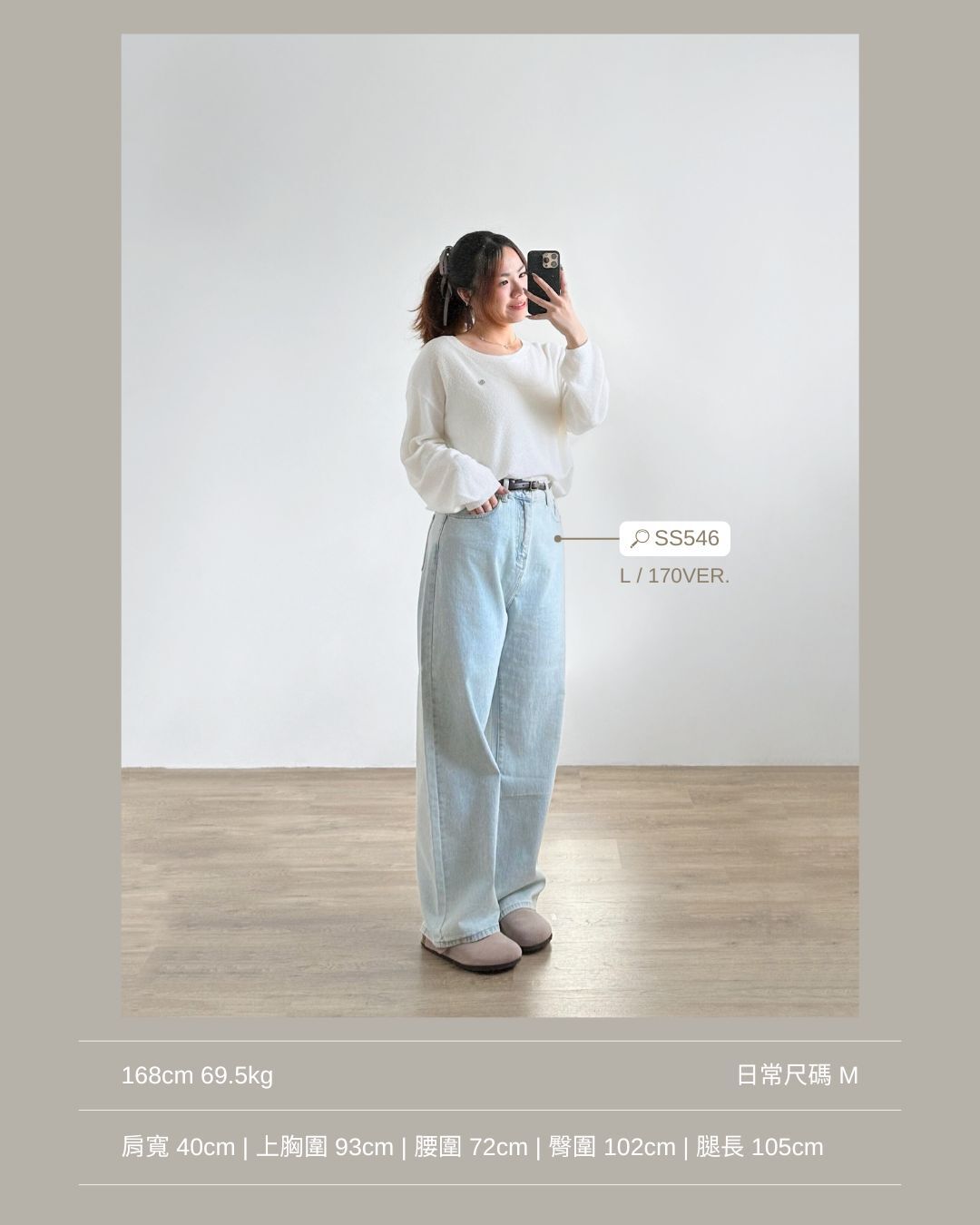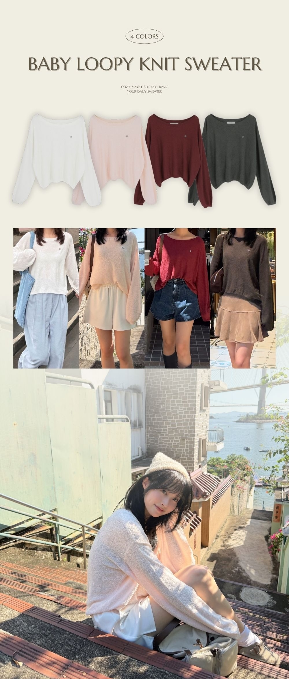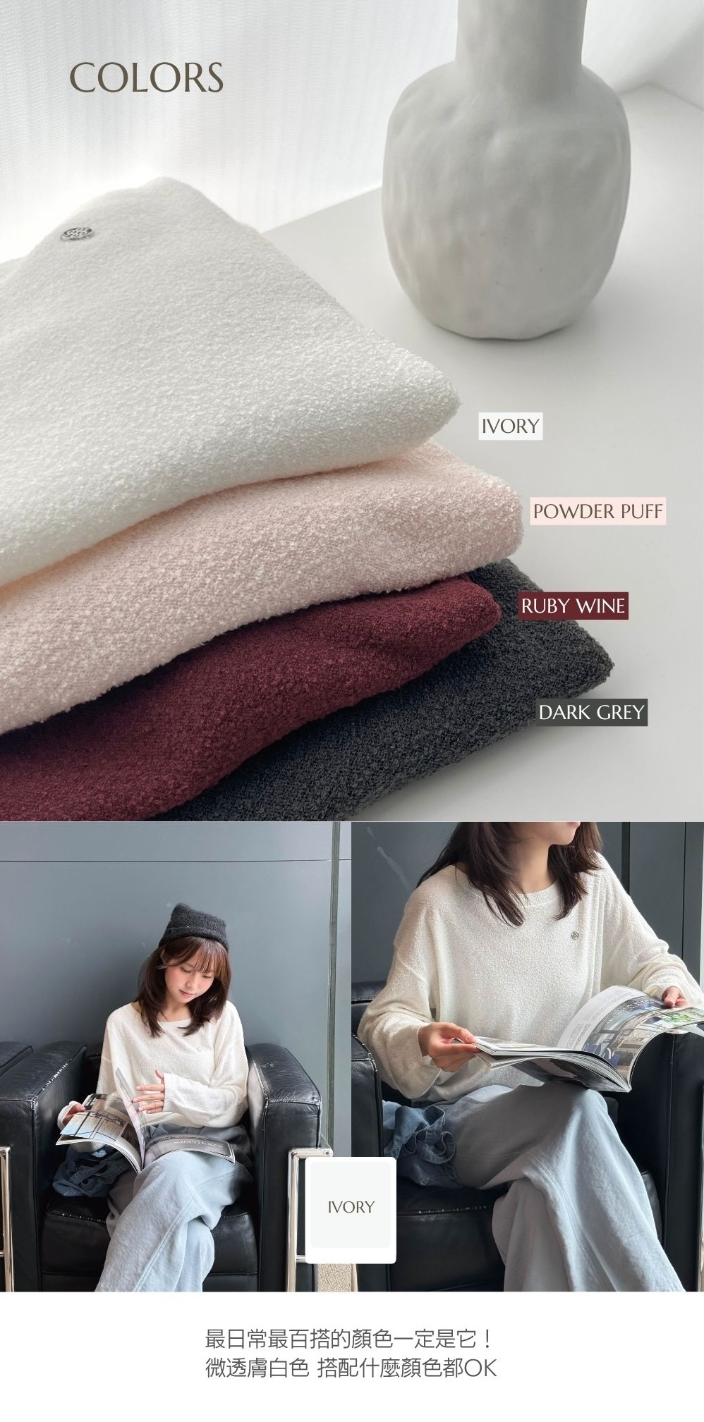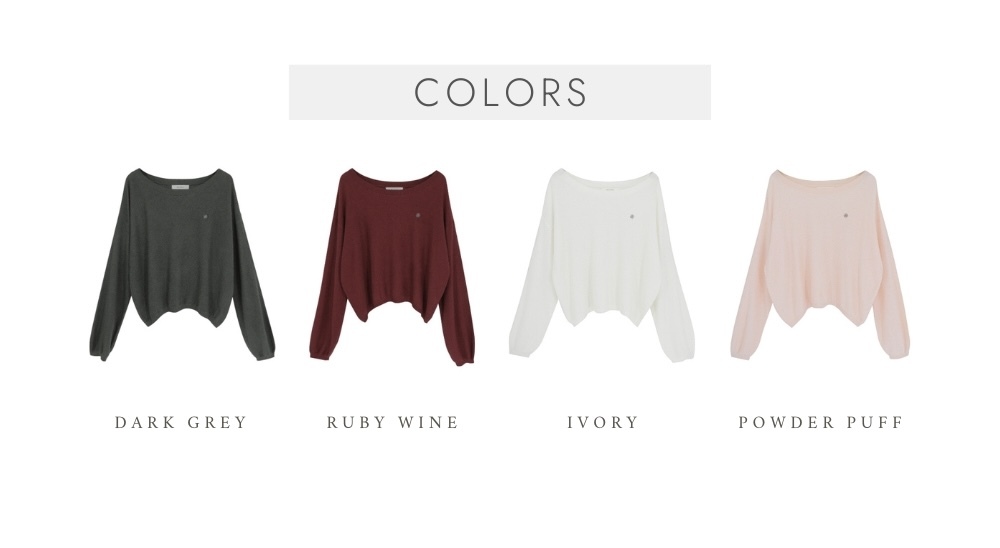 寬鬆落肩版型 / 大弧形領口設計 / 突顯肩膀輪廓 / 偏長泡泡袖型 / 品牌logo質感小圓牌