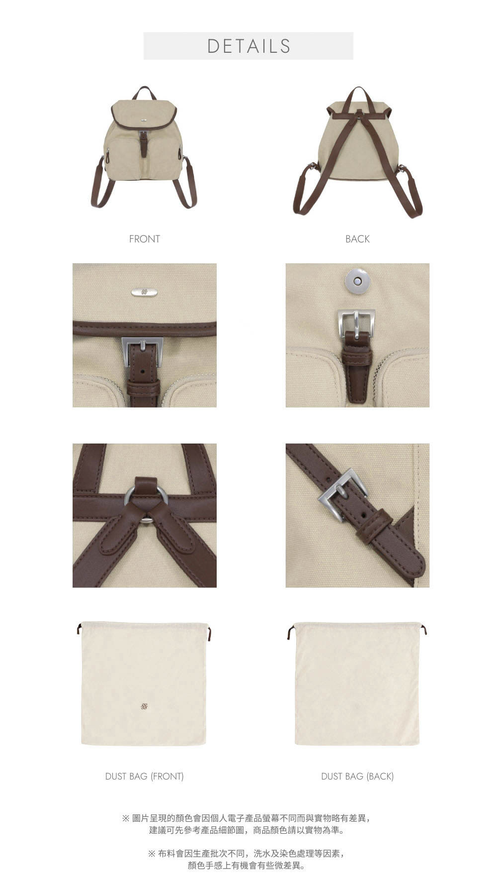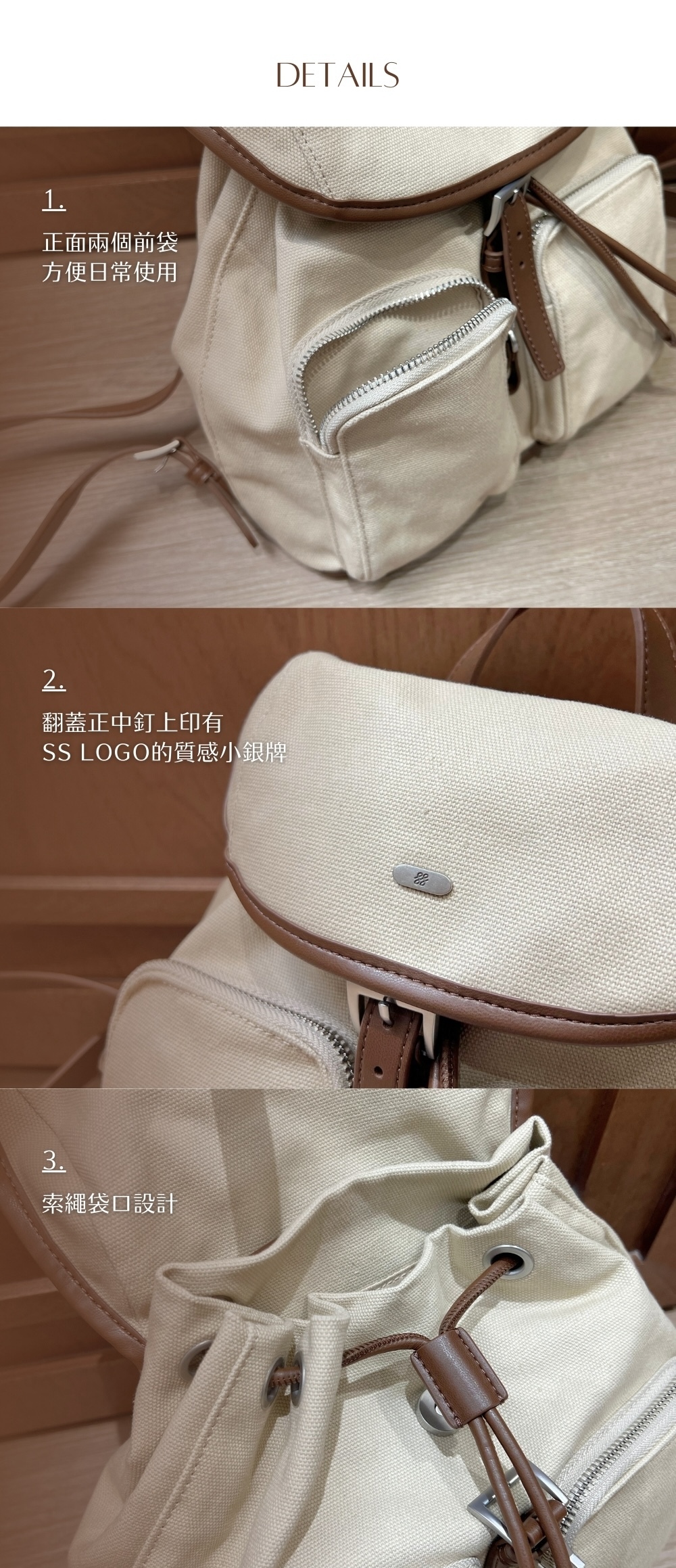正面扣環翻蓋 / 主袋索繩開合 / 口袋拉鍊開合 /