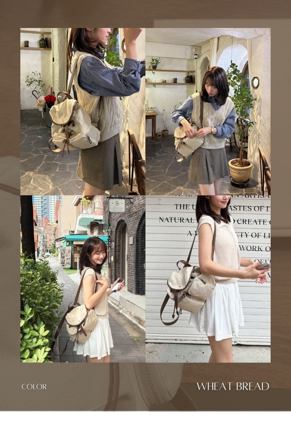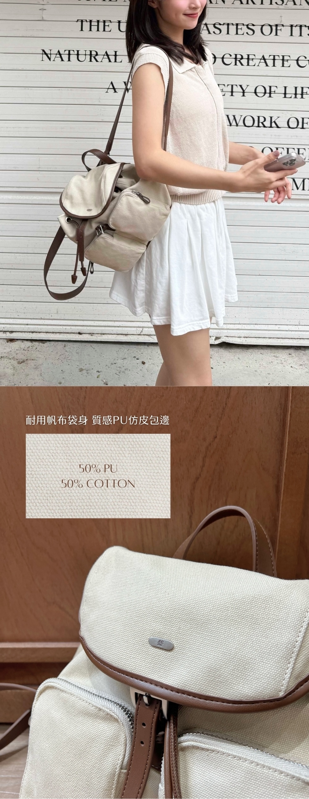 袋身為canvas布料 / 質感PU仿皮包邊 / 內有拉鍊夾層 / 可調節肩帶 / 重量0.6kg