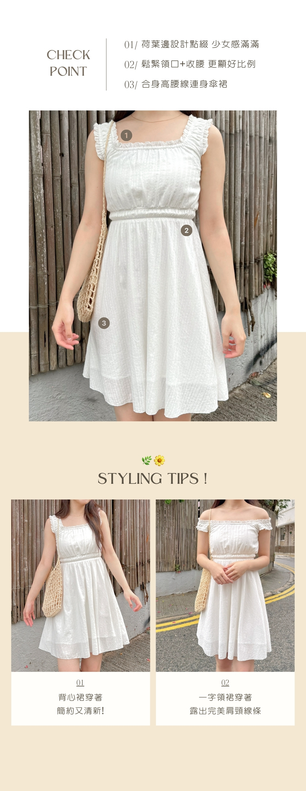 ⋄ 領口及肩帶兩邊為彈性荷葉邊設計