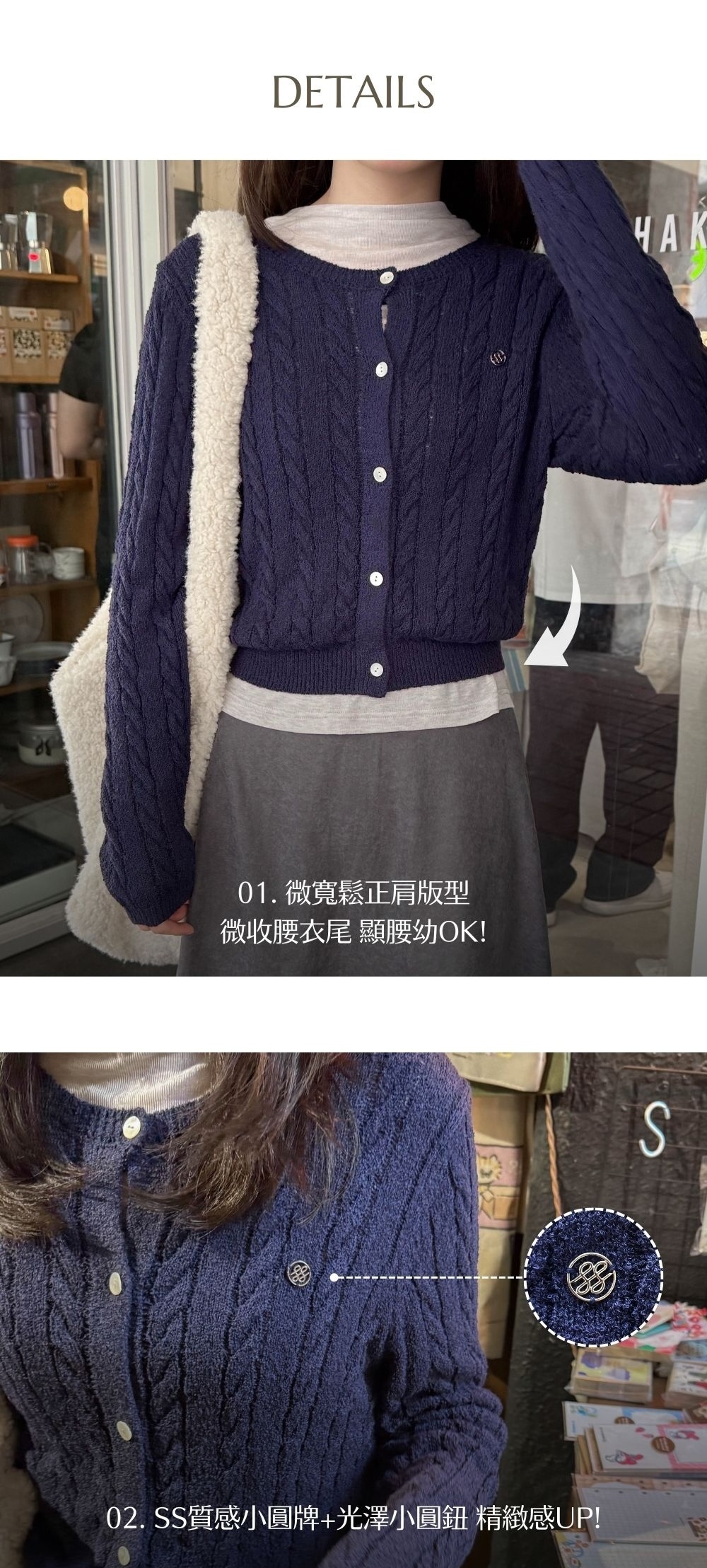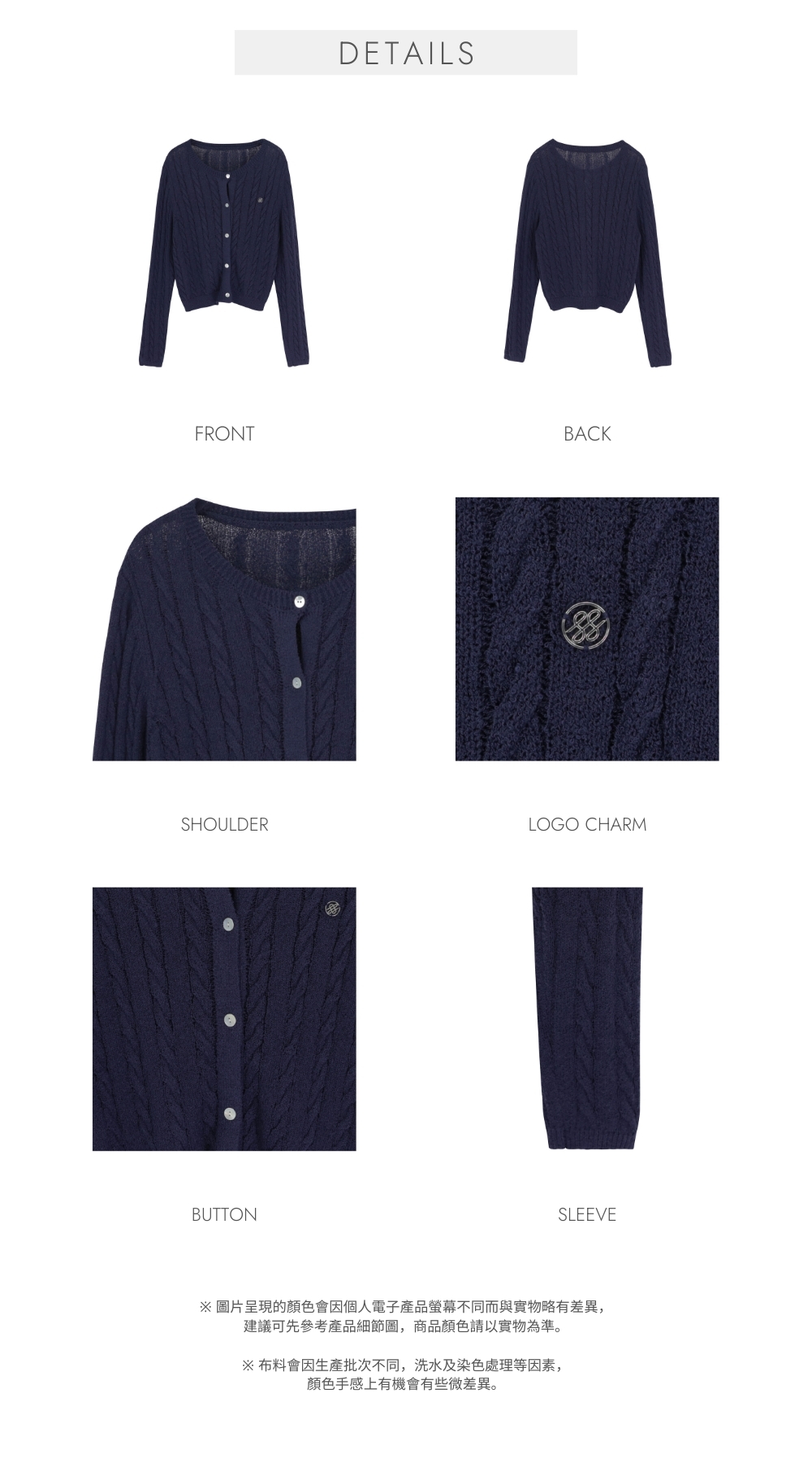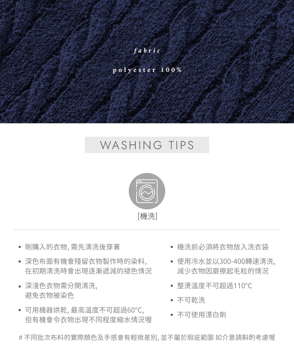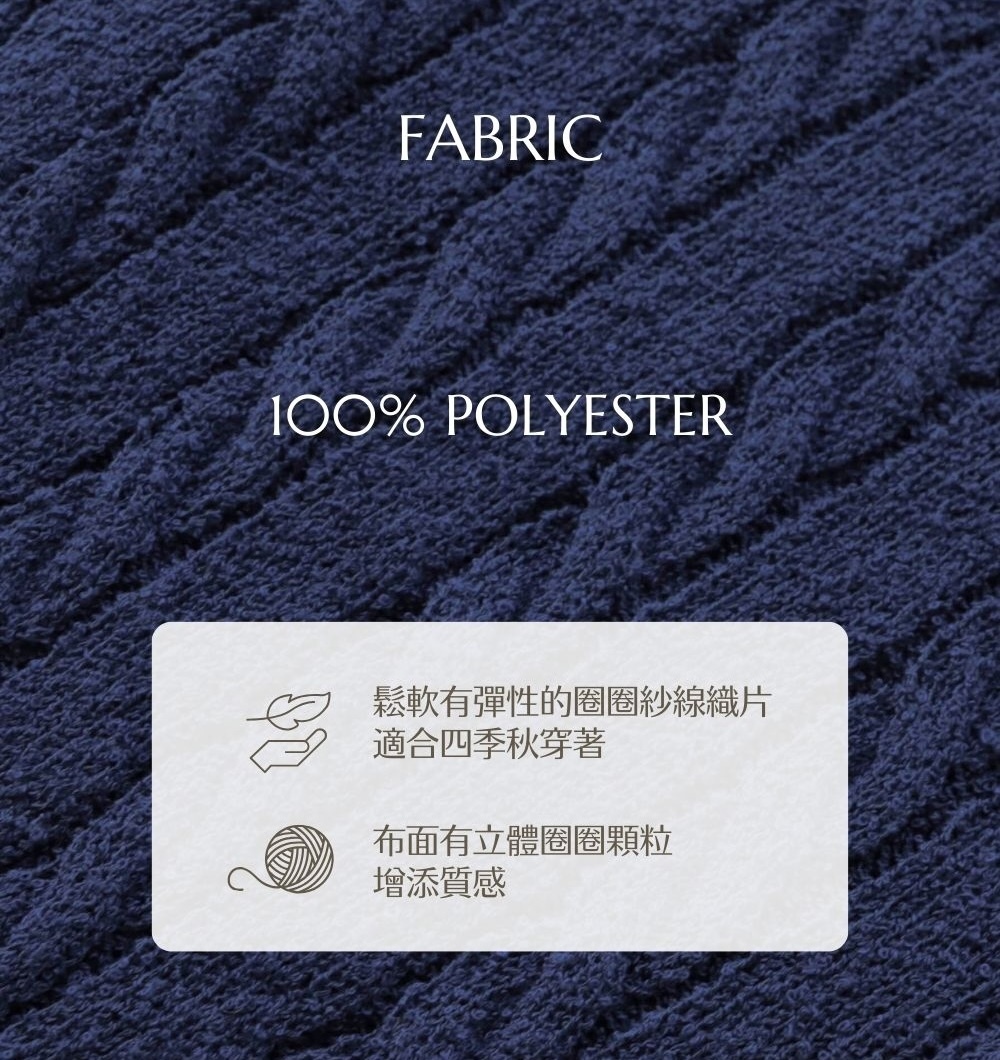 輕盈鬆軟高彈性織片 / 圈圈顆粒感布面 / 立體麻花織紋 / 春秋冬可穿 / 品牌logo質感小圓牌 / 光澤小圓鈕