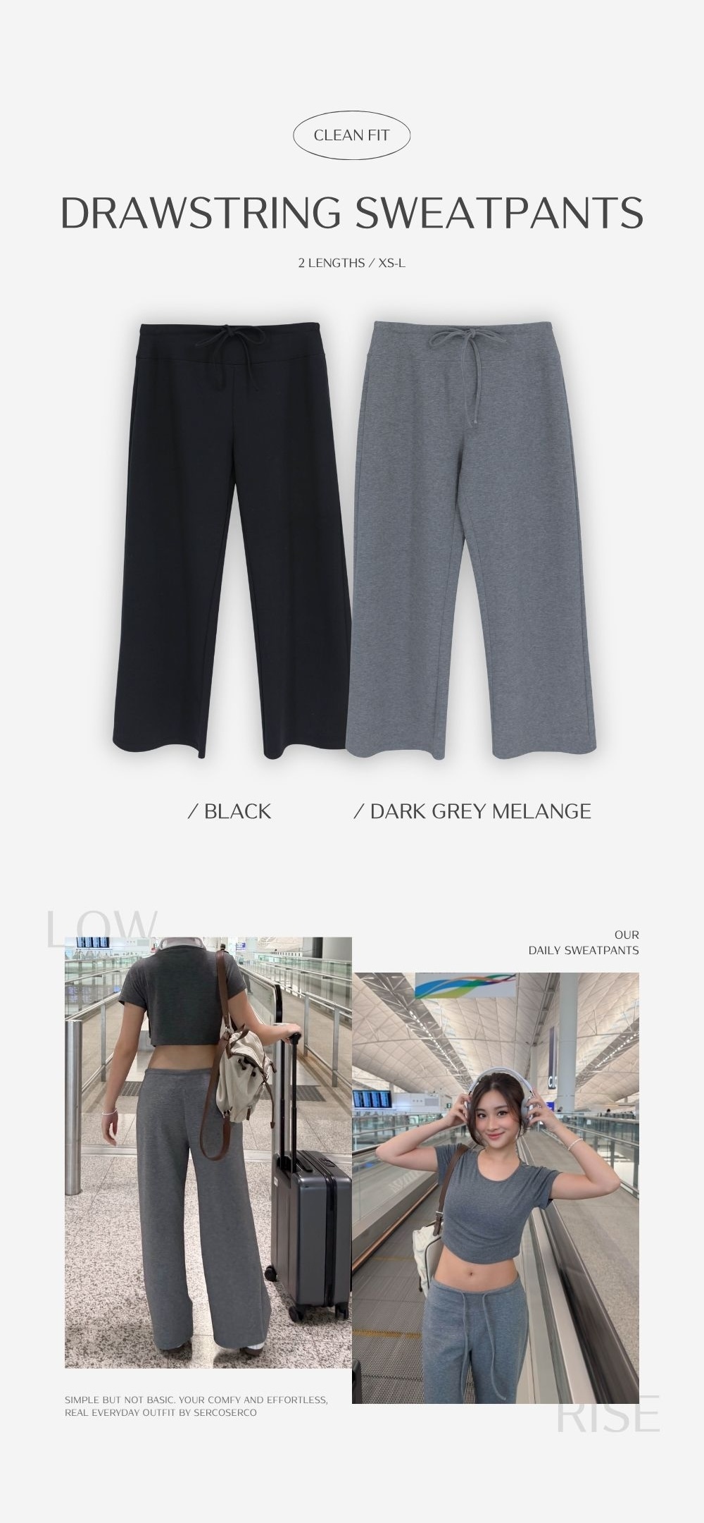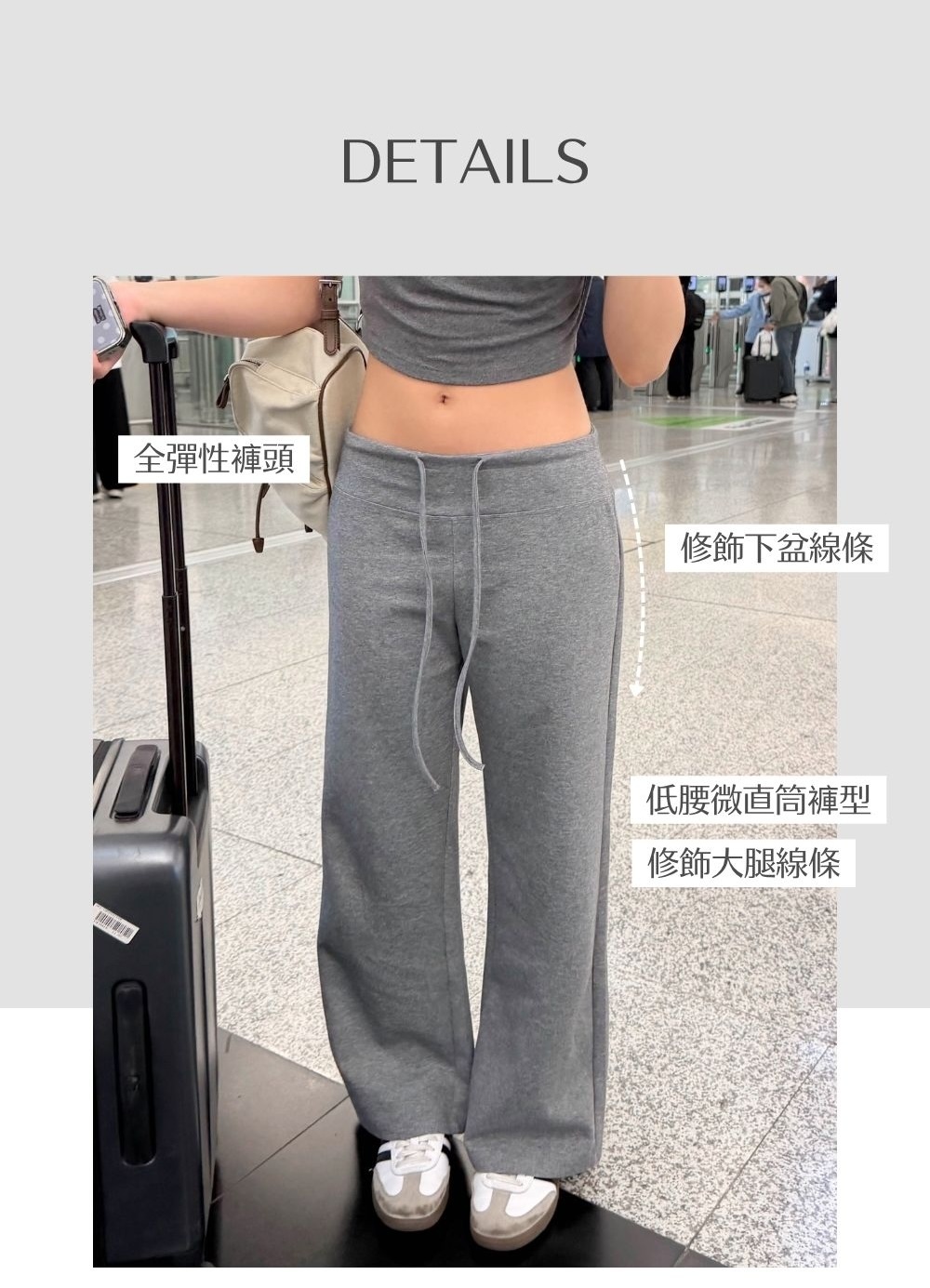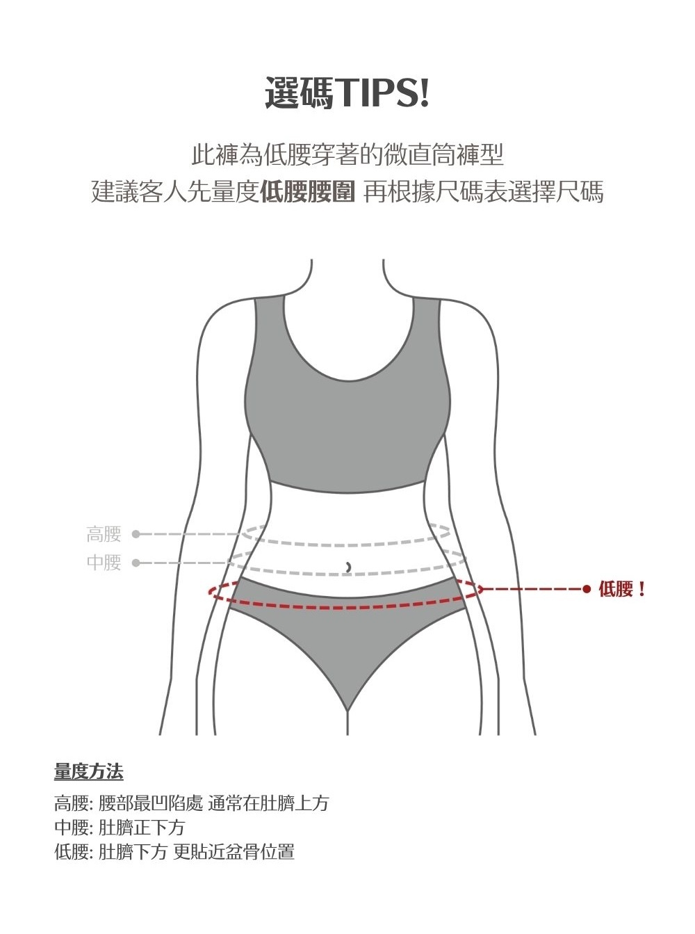 低腰穿著 / 微直筒褲型 / 收窄下盆線條 / 貼合腹部及上臀曲線 /