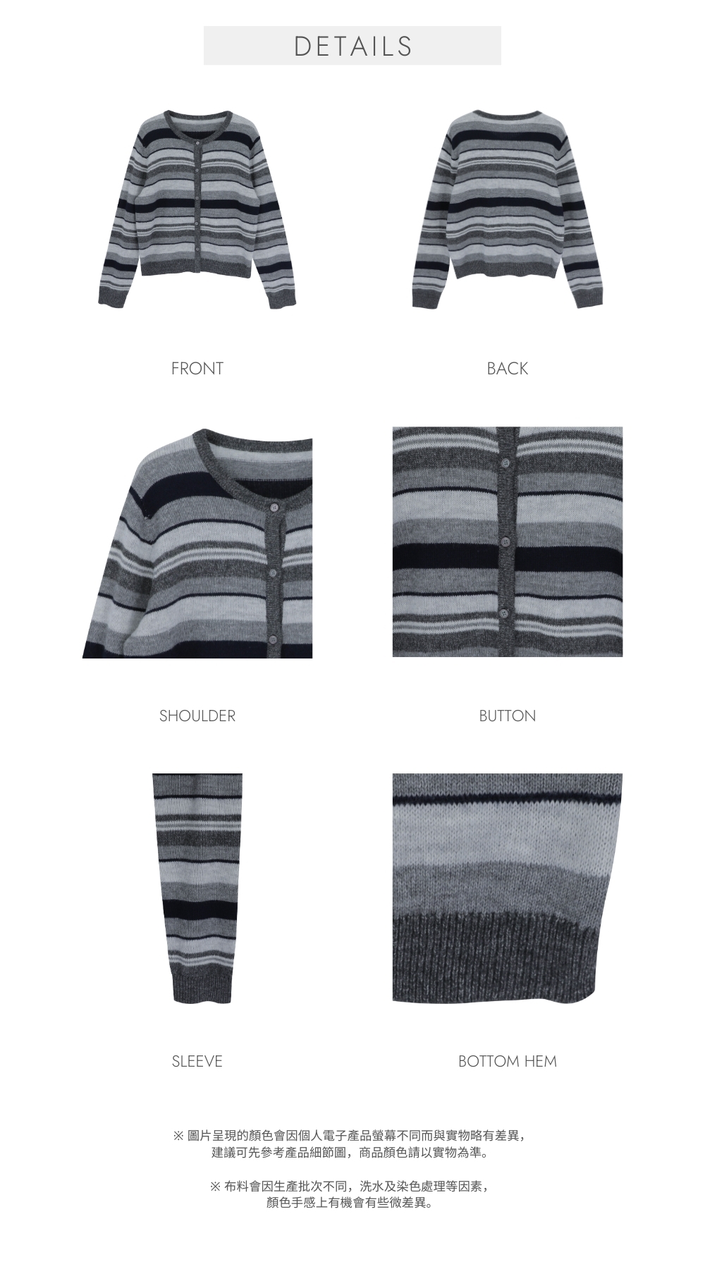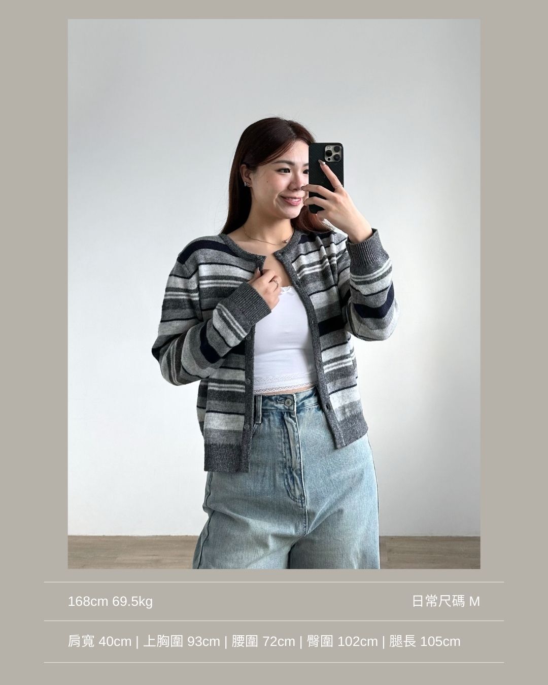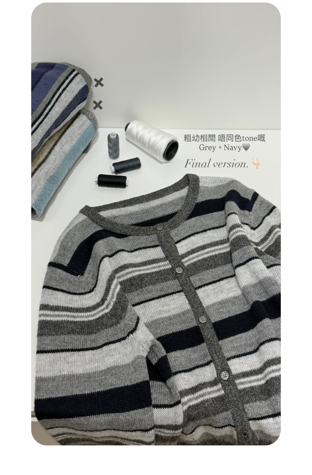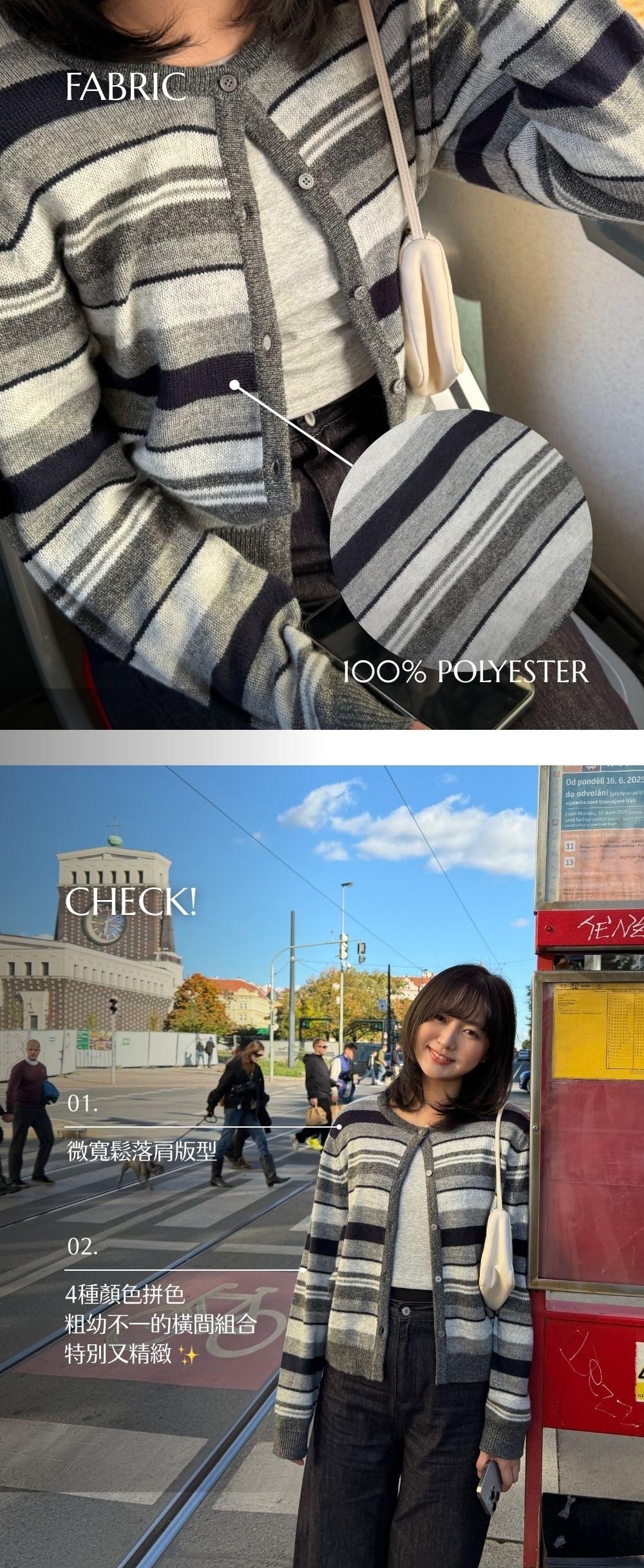 中等厚度 / 挺版針織質地 / 微寬鬆落肩版型 / 4種顏色拼色 / 粗幼不一的橫間組合 / 可當外套可單穿 / 適合春秋冬