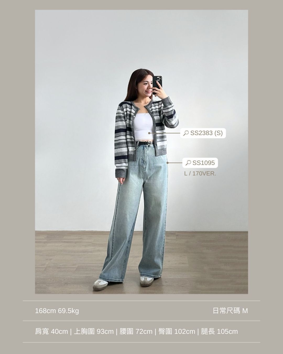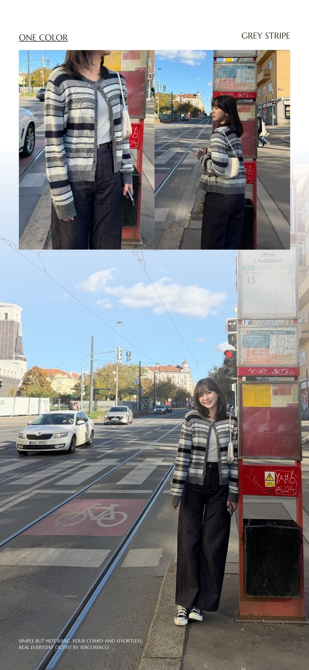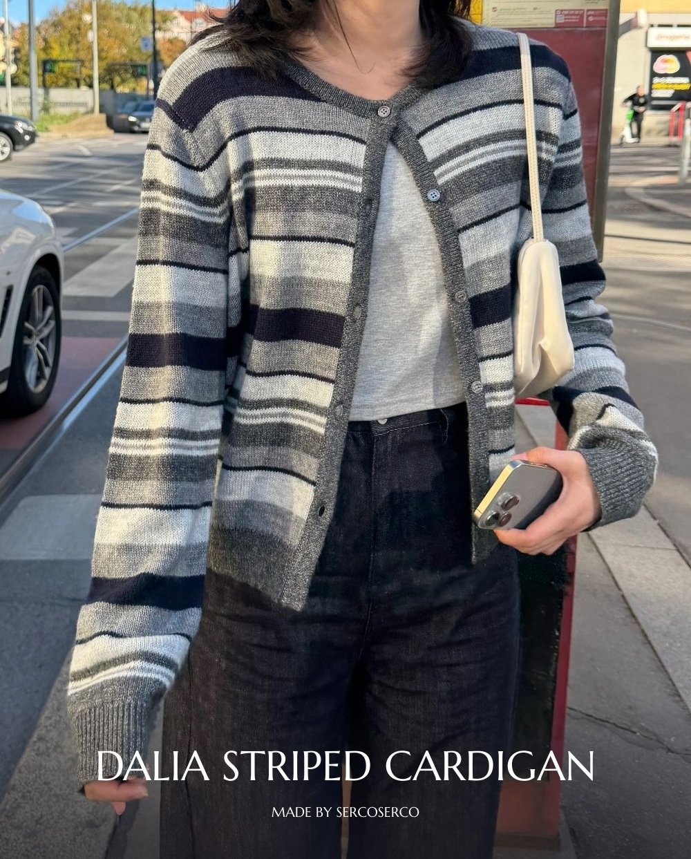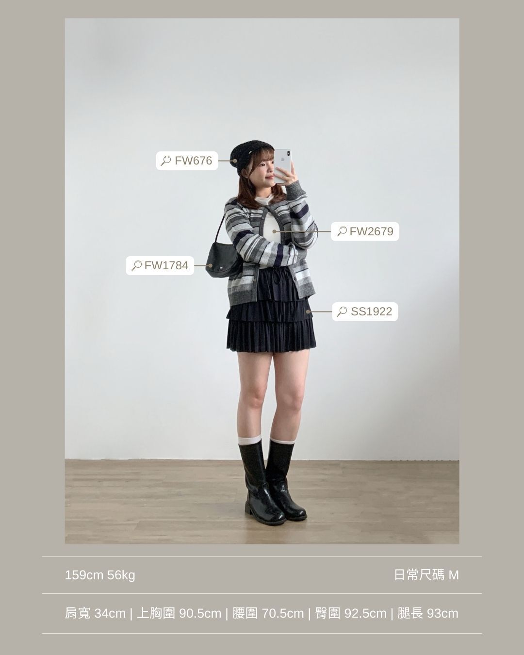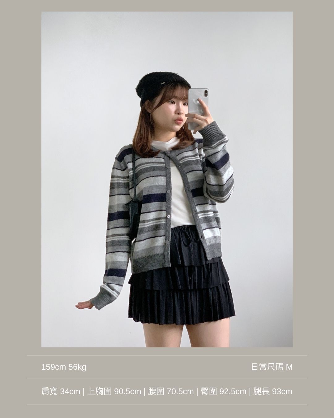 中等厚度 / 挺版針織質地 / 微寬鬆落肩版型 / 4種顏色拼色 / 粗幼不一的橫間組合 / 可當外套可單穿 / 適合春秋冬