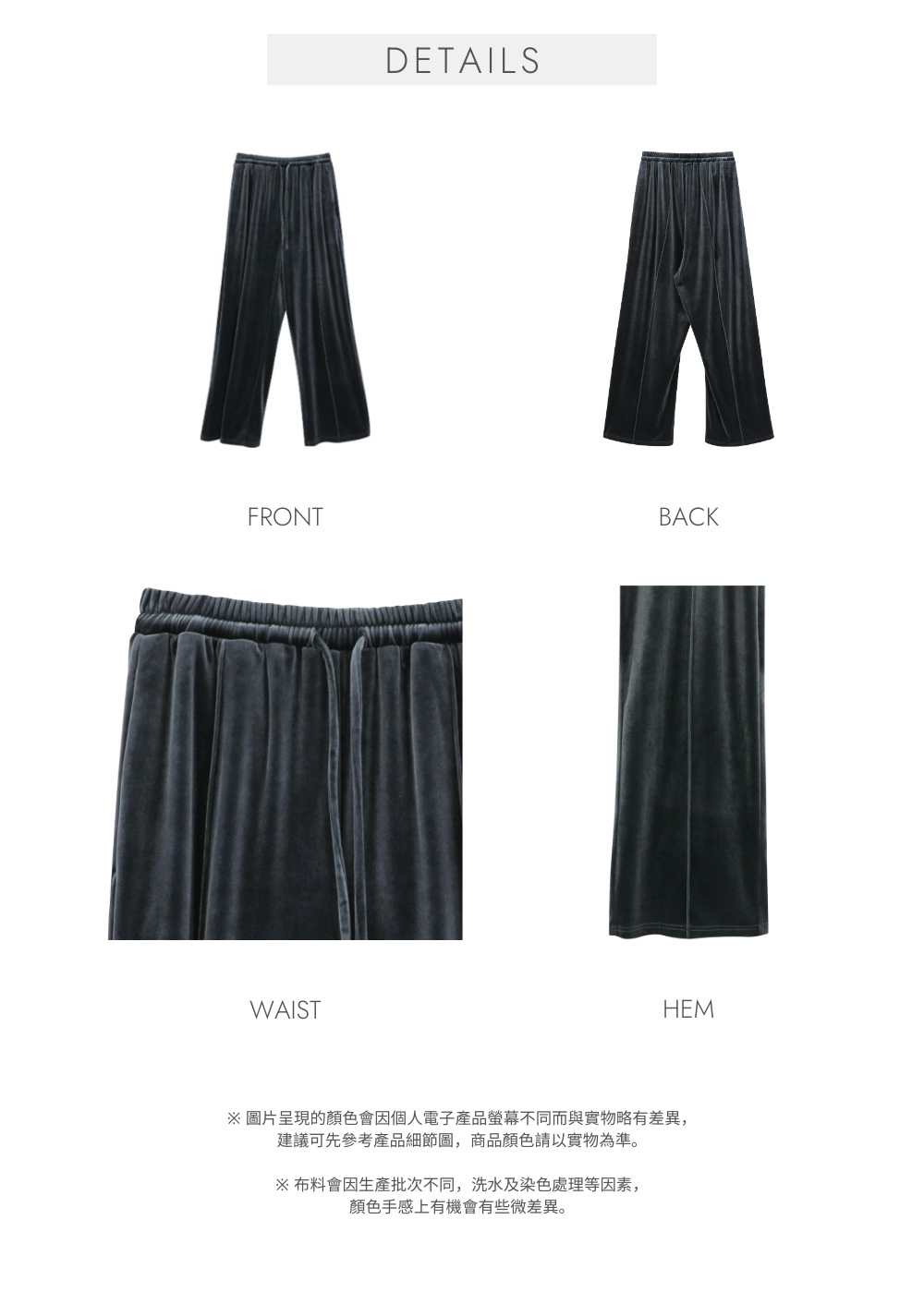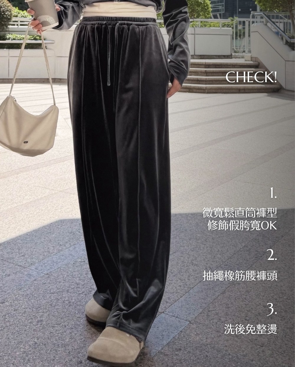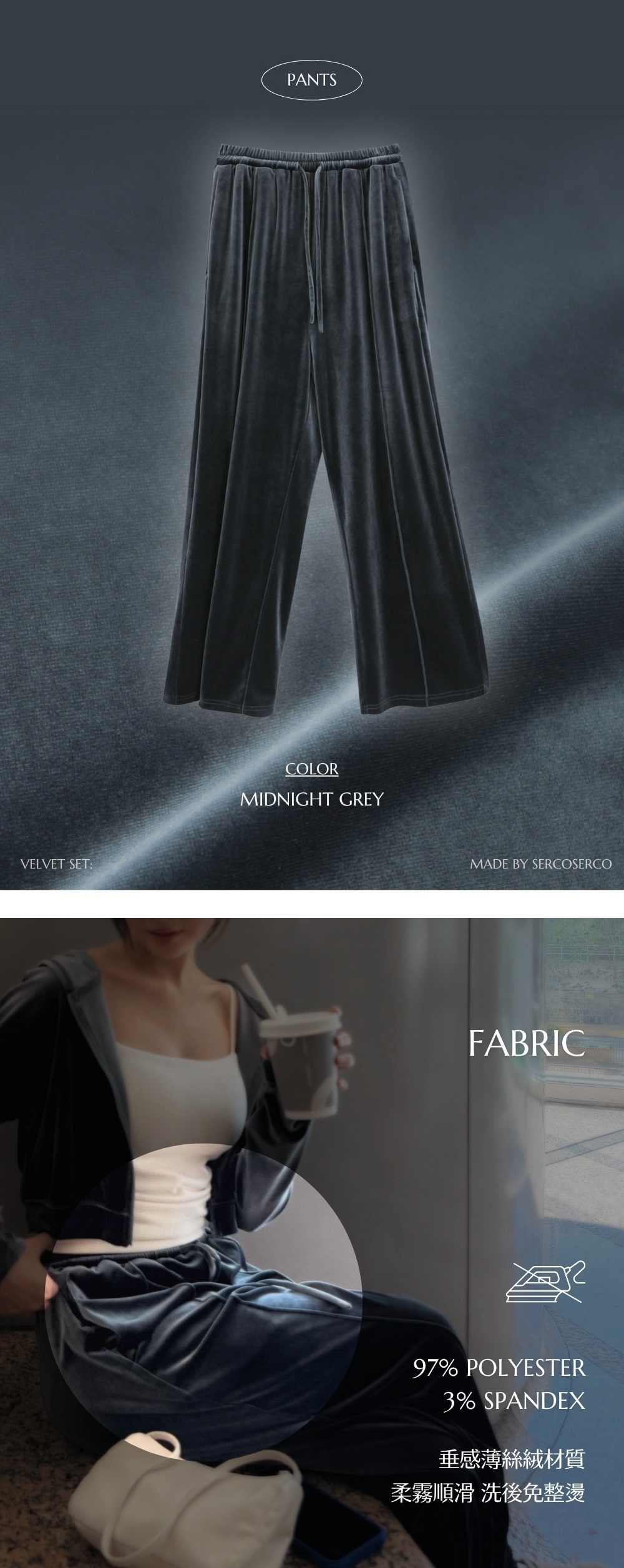薄款 / 垂感薄絲絨材質 / 洗後免整燙 / 秋冬春可穿 / 抽繩橡筋腰褲頭