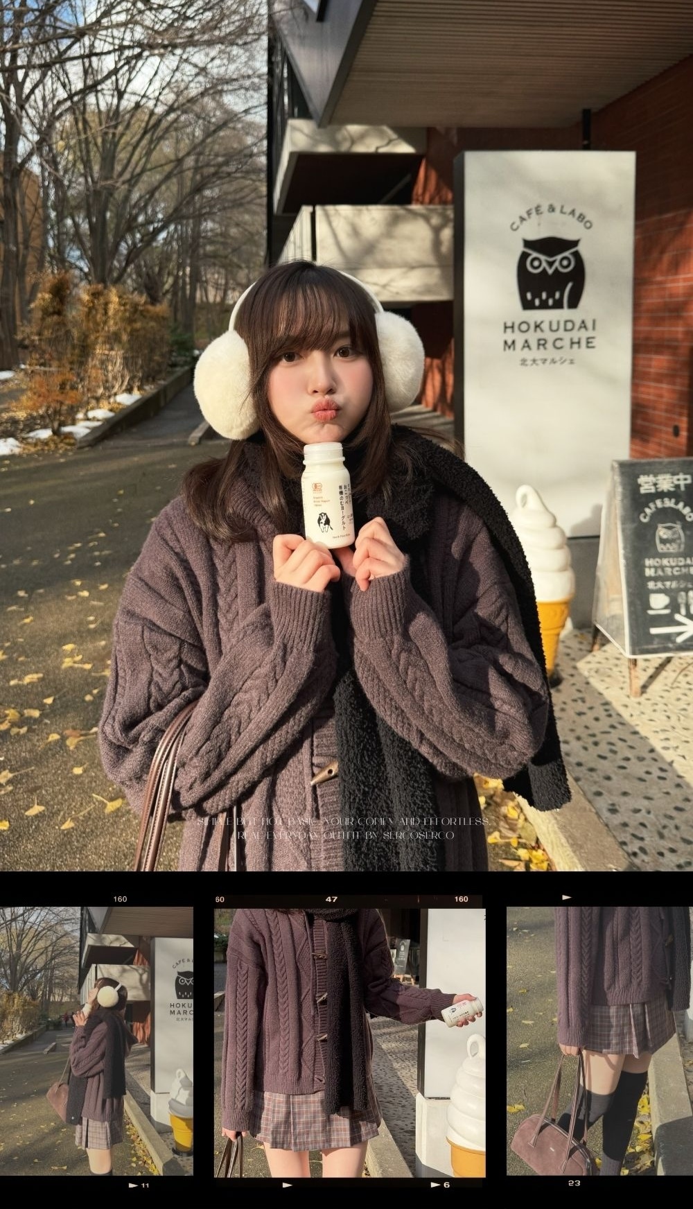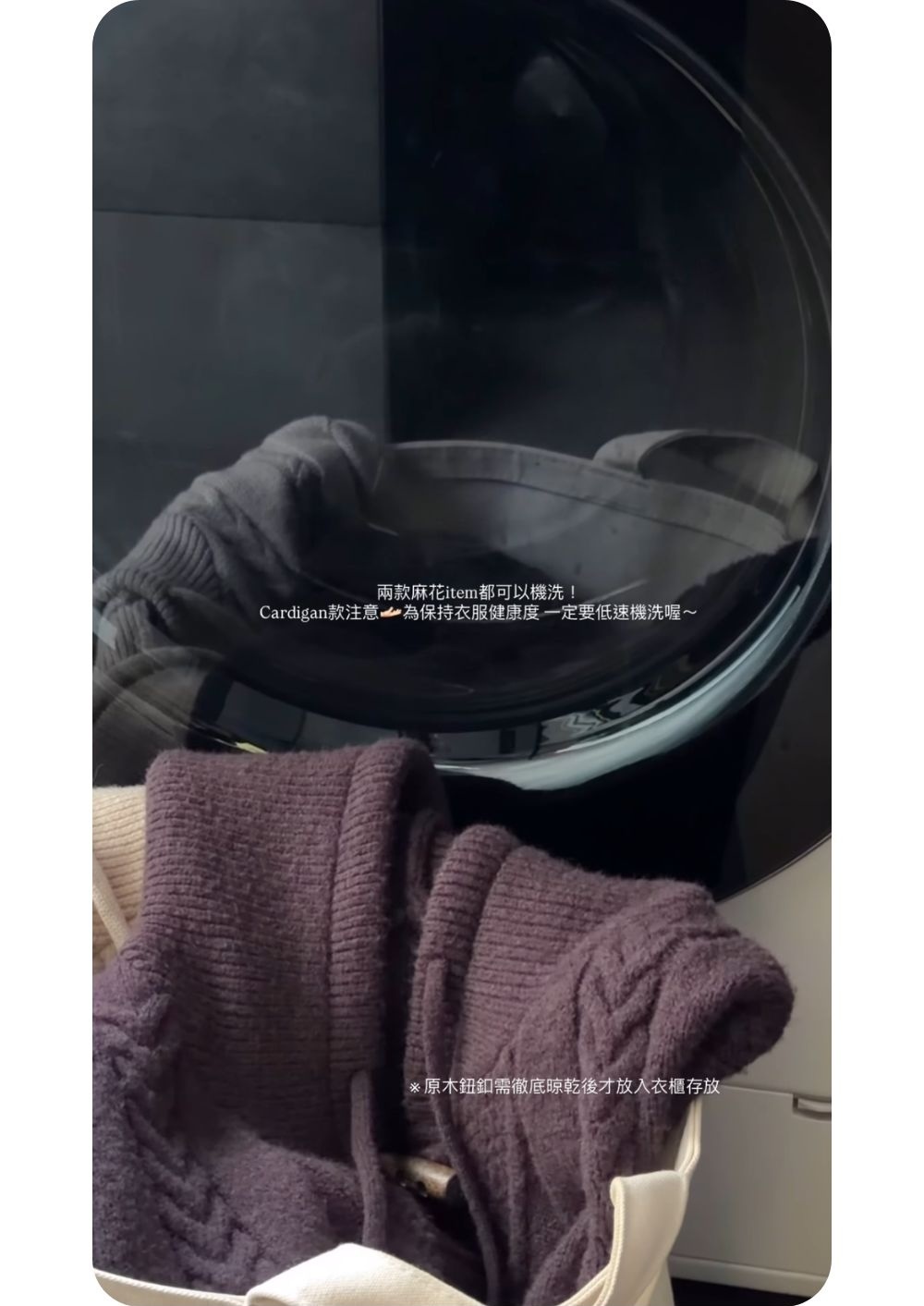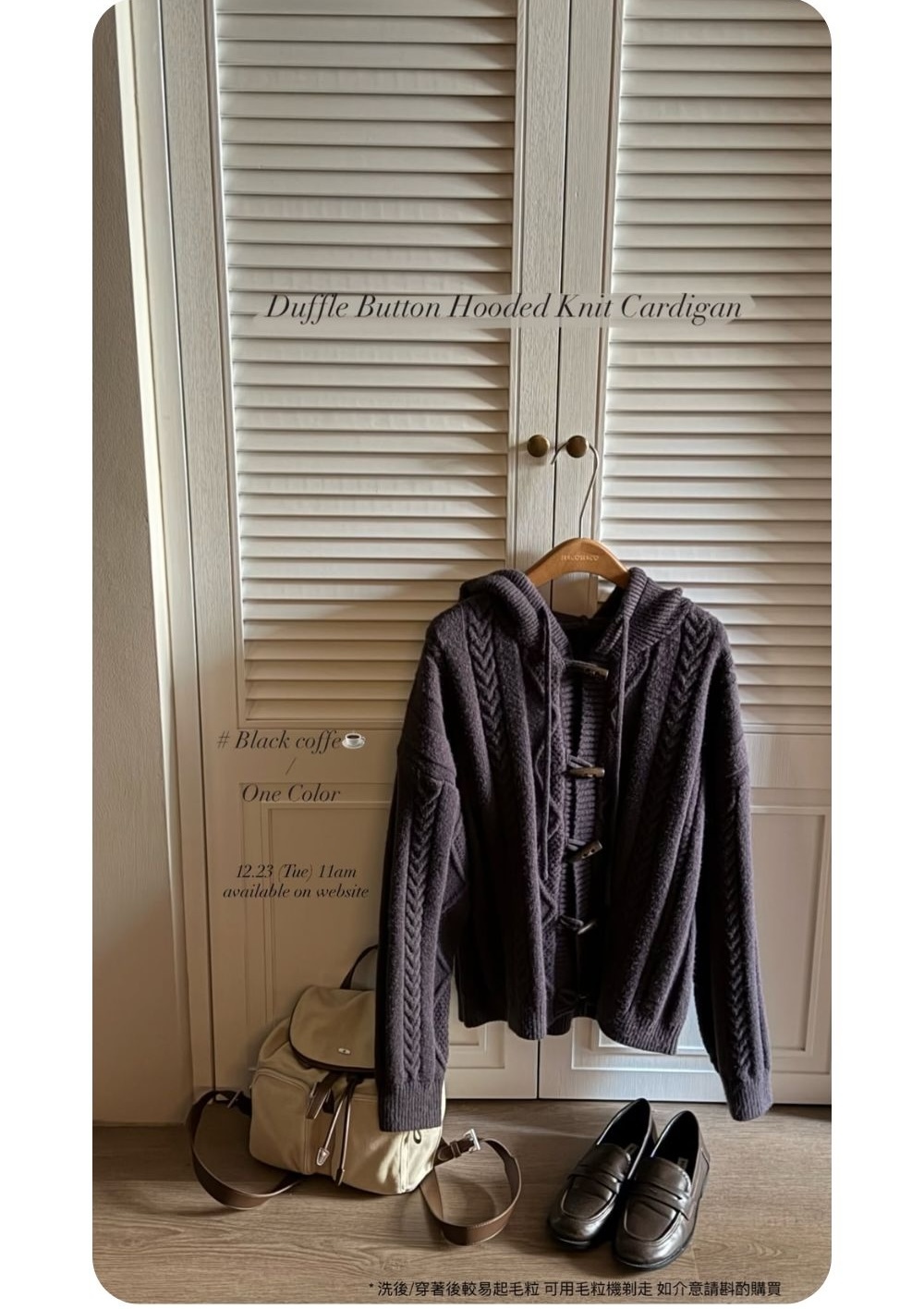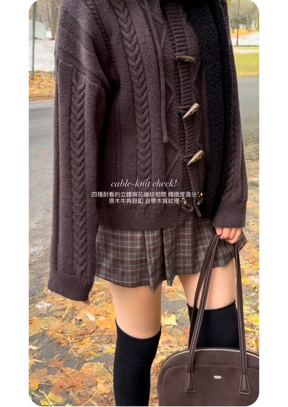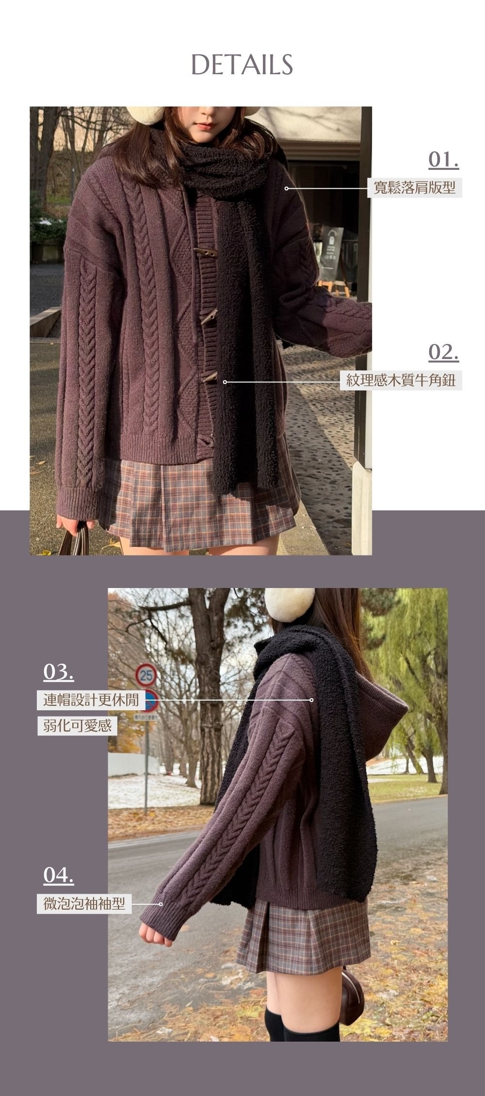 鬆軟親膚材質 / 高針織密度 / 四種立體麻花織紋相間 / 紋理感木質牛角鈕