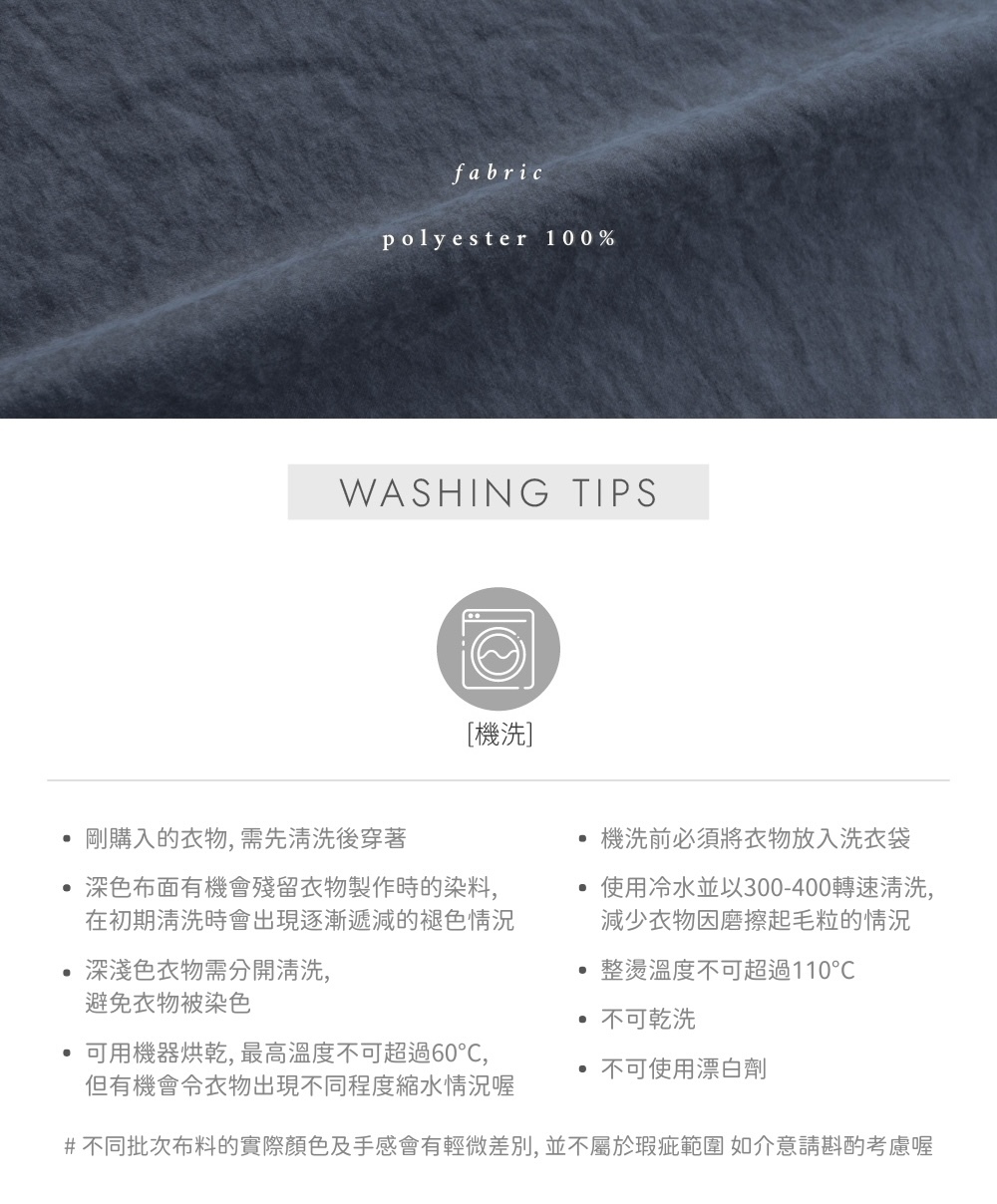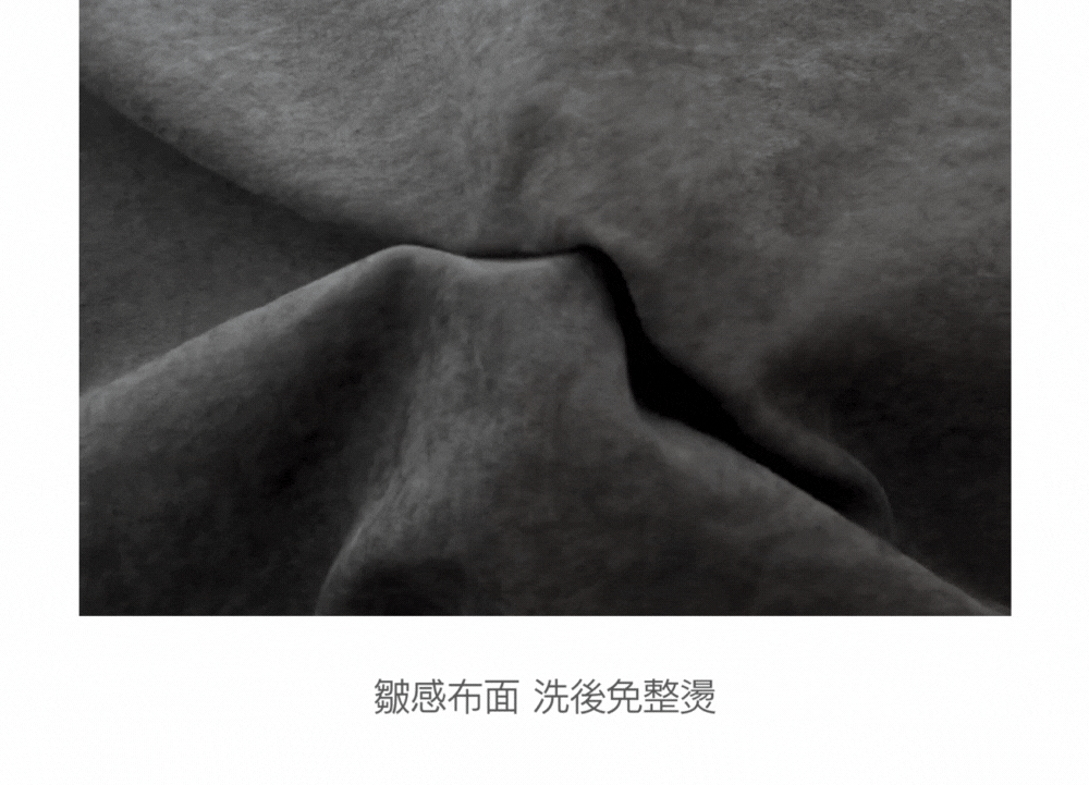 薄款 / 輕盈磨毛霧光感布料 / 手感柔滑 / 皺感布面 免整燙 /