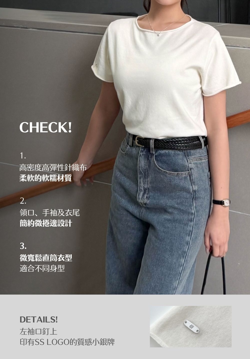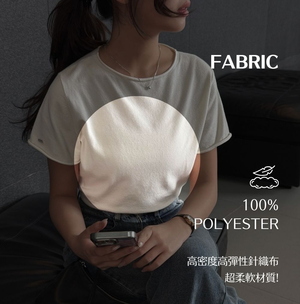 中等厚度 / 高密度高彈性針織布 / 品牌logo質感銀牌 / 領口、手袖及衣尾為捲邊設計 /