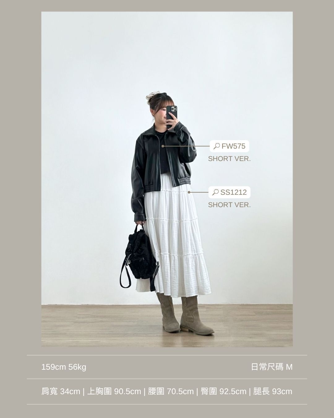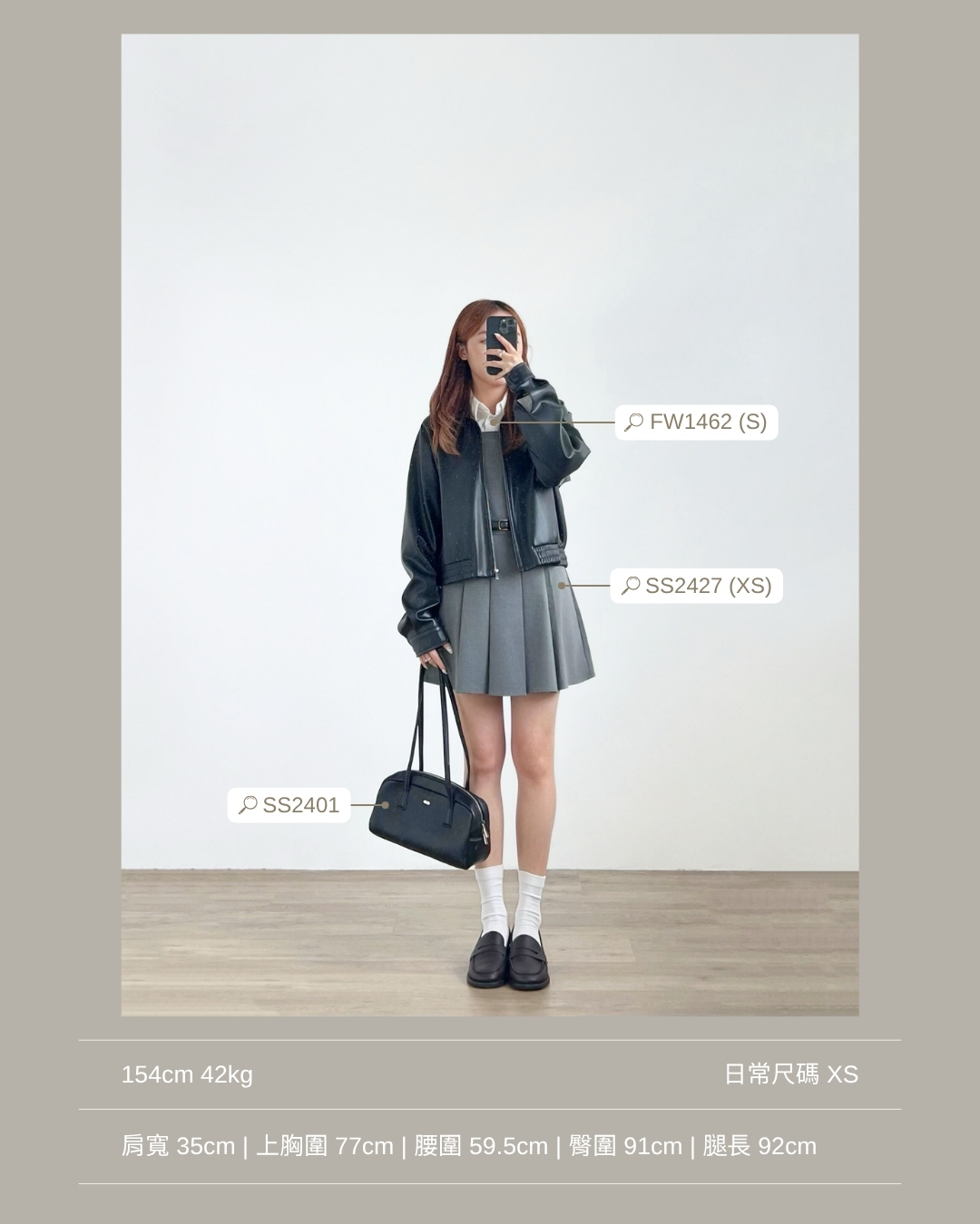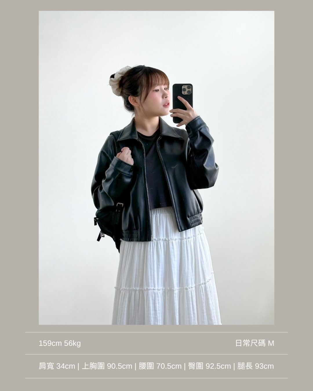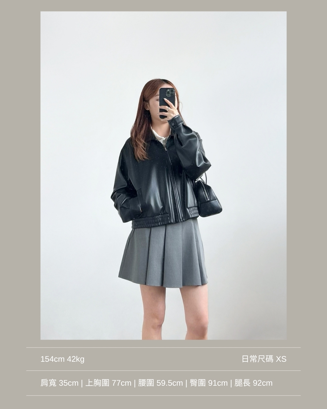 中等厚度 / 柔滑紋理感PU皮料 / 不挑身型 / 兩側有插袋 / 秋冬春可穿