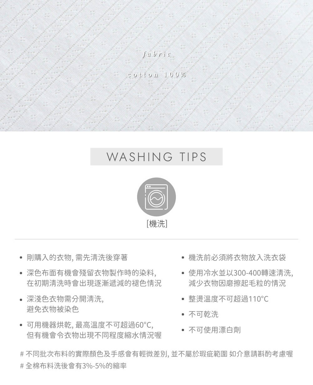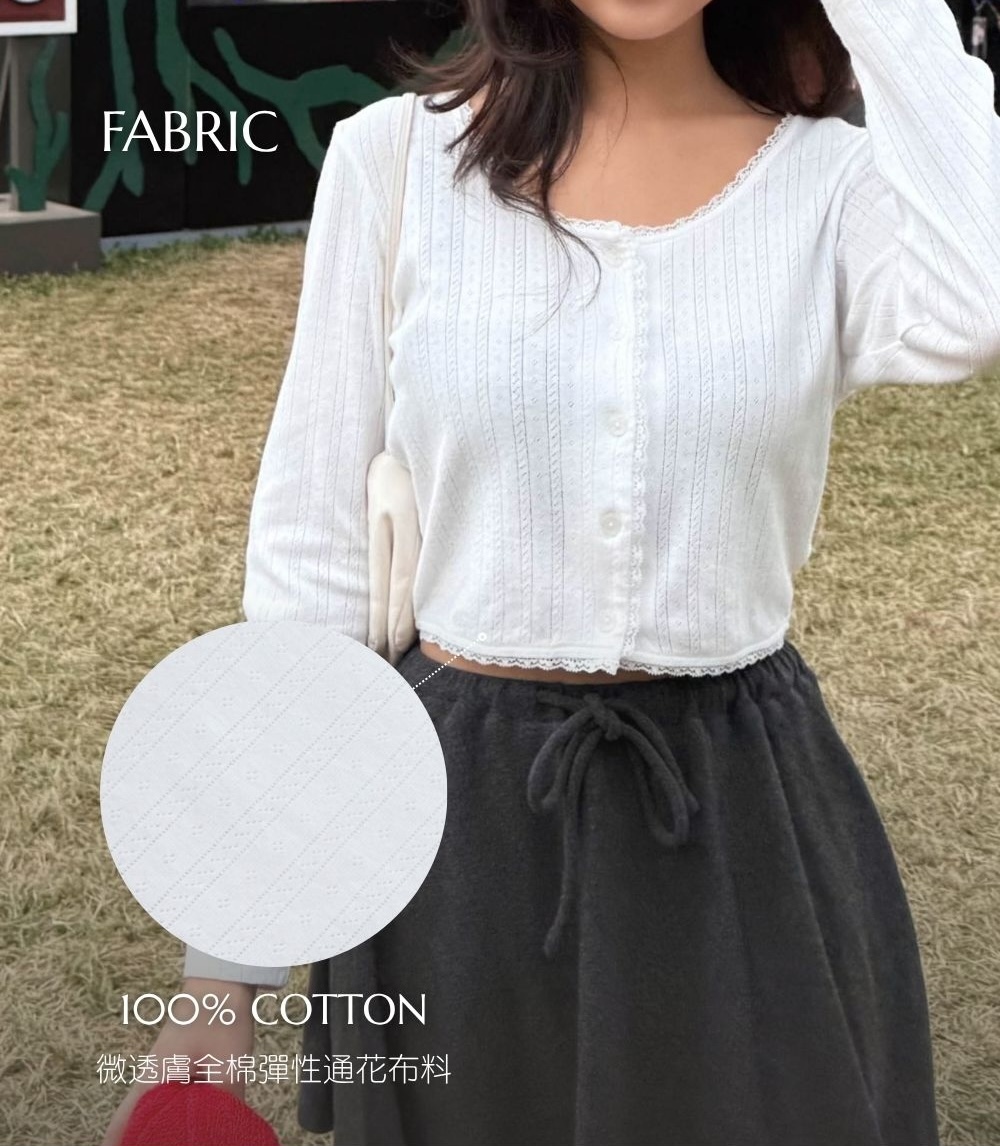 薄款 / 彈性通花布料 / 100%全棉 / 微透膚 / 可單穿可當外套 / 春夏秋可穿