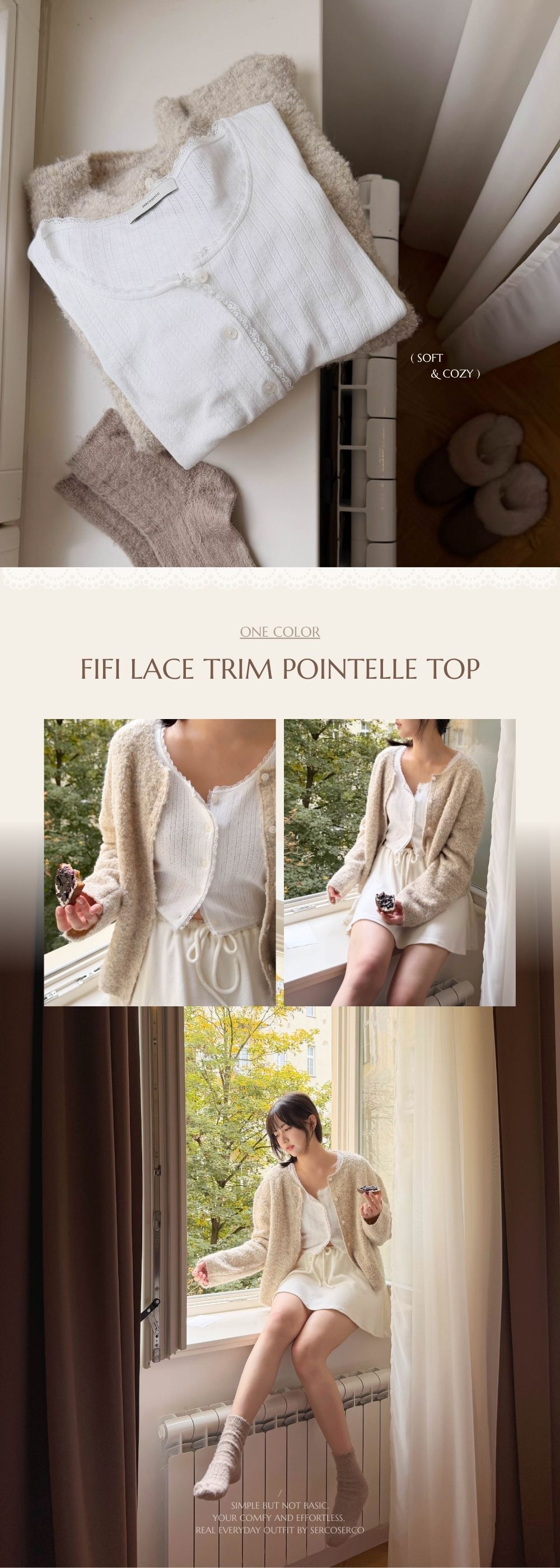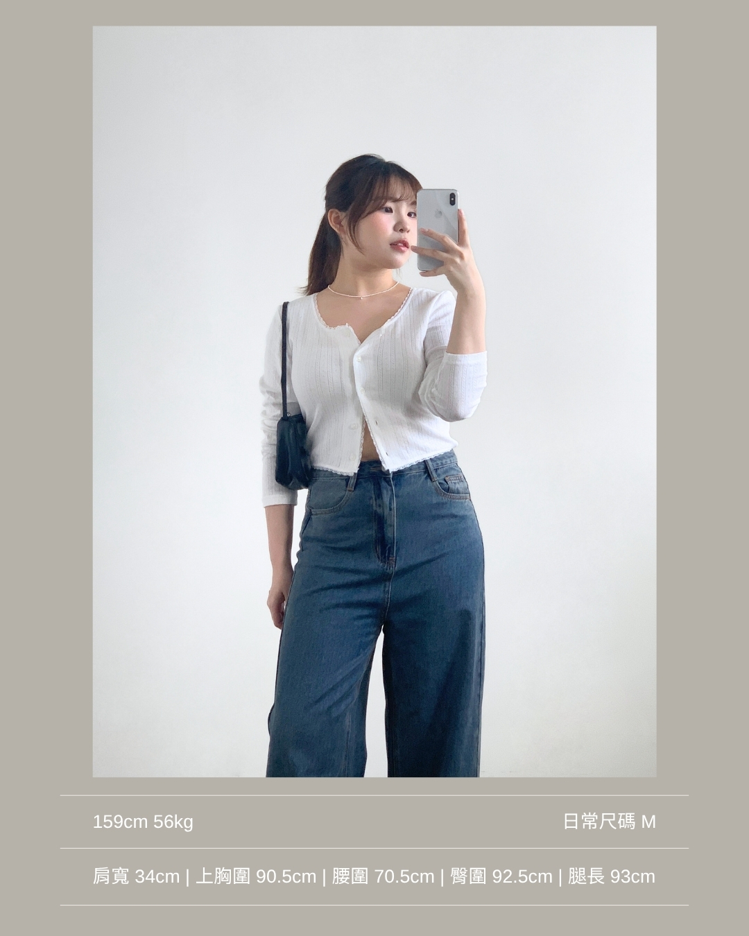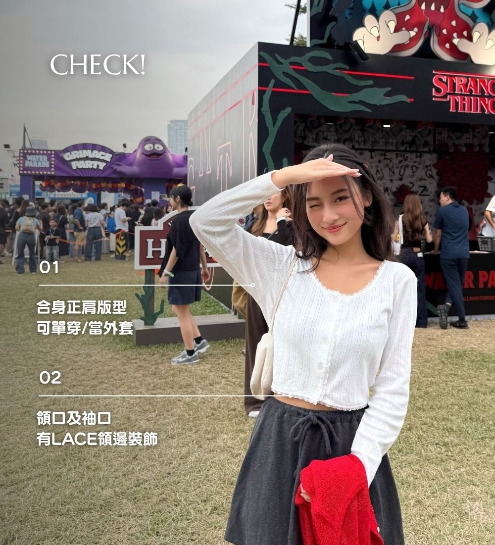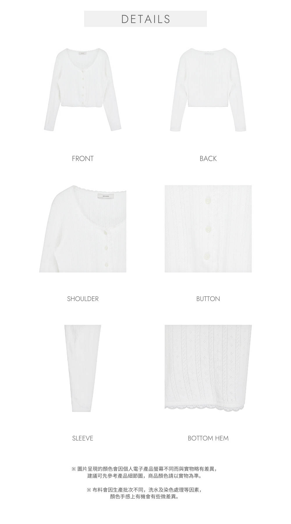 合身正肩版型 / 短版衣長 / 精緻小巧通花圖案 / lace領邊裝飾 / 顯直角肩 / 同色系光澤小圓鈕