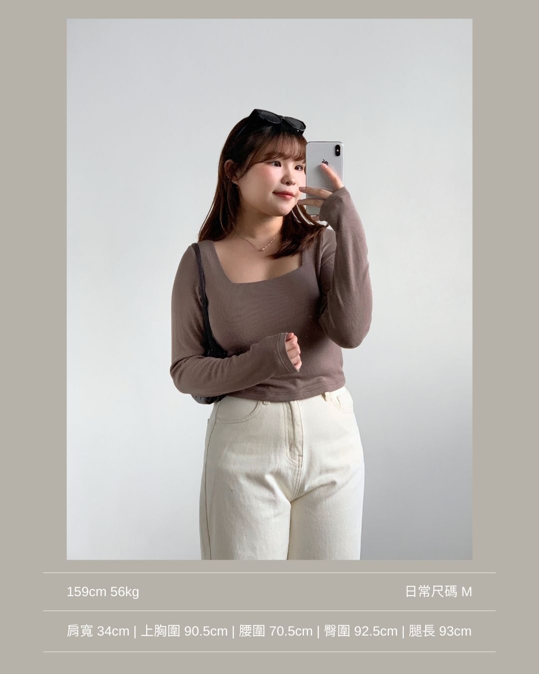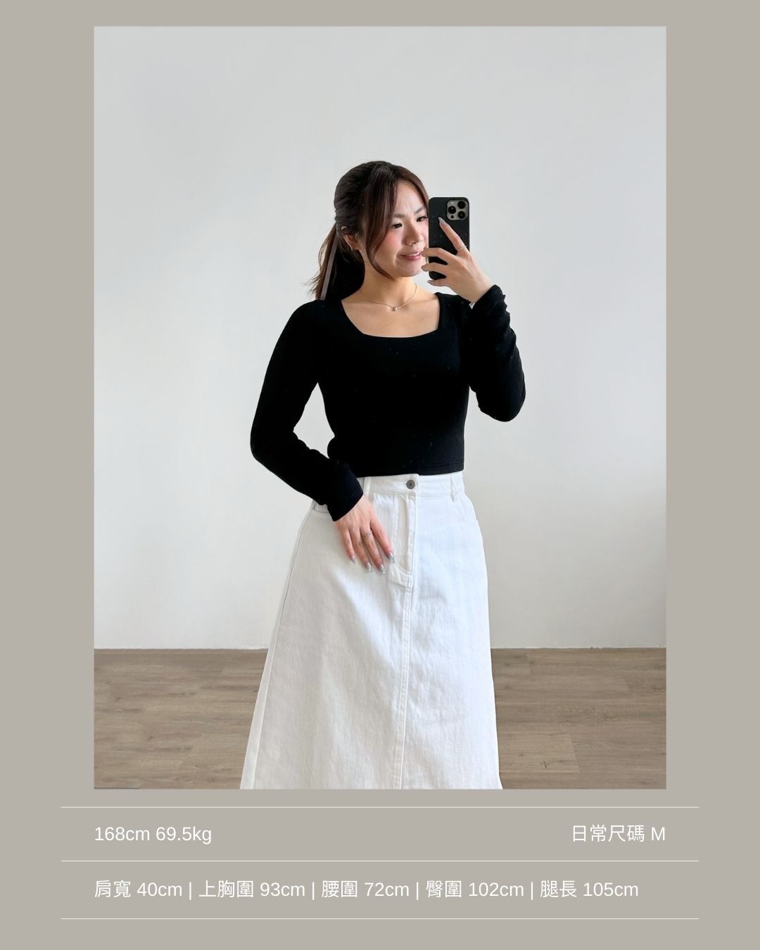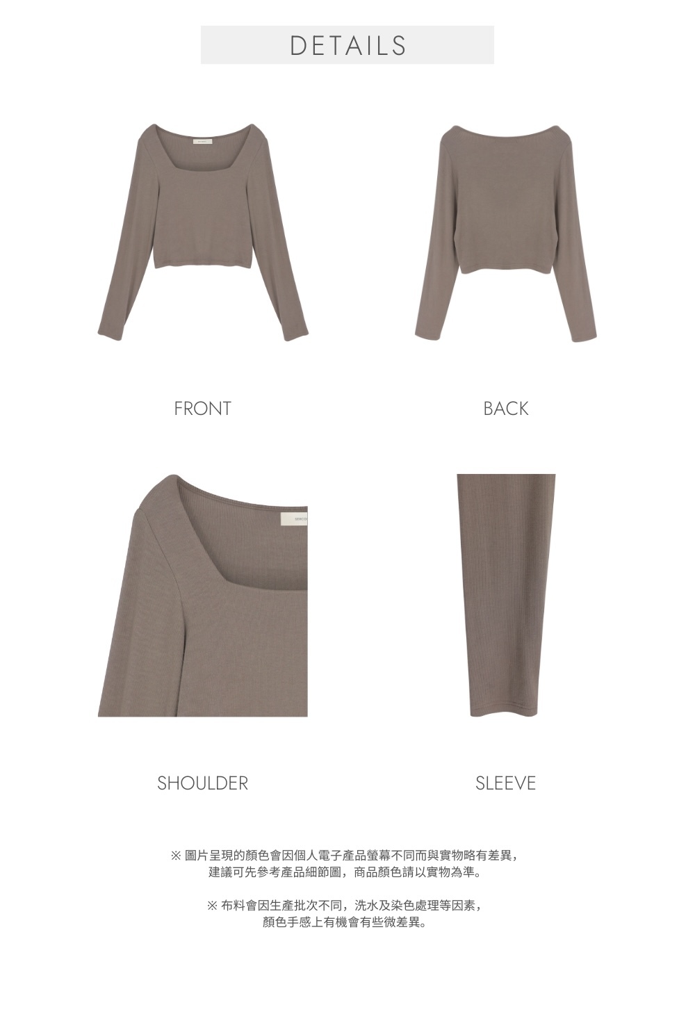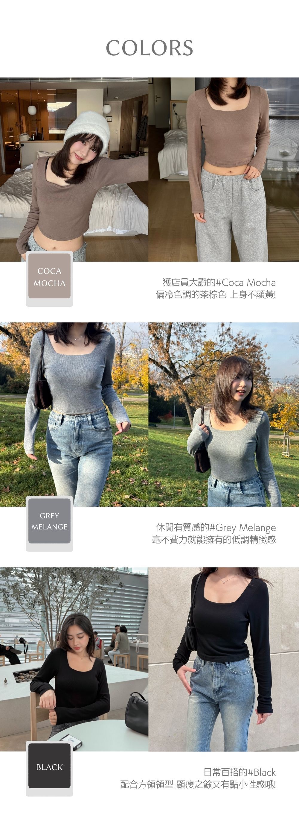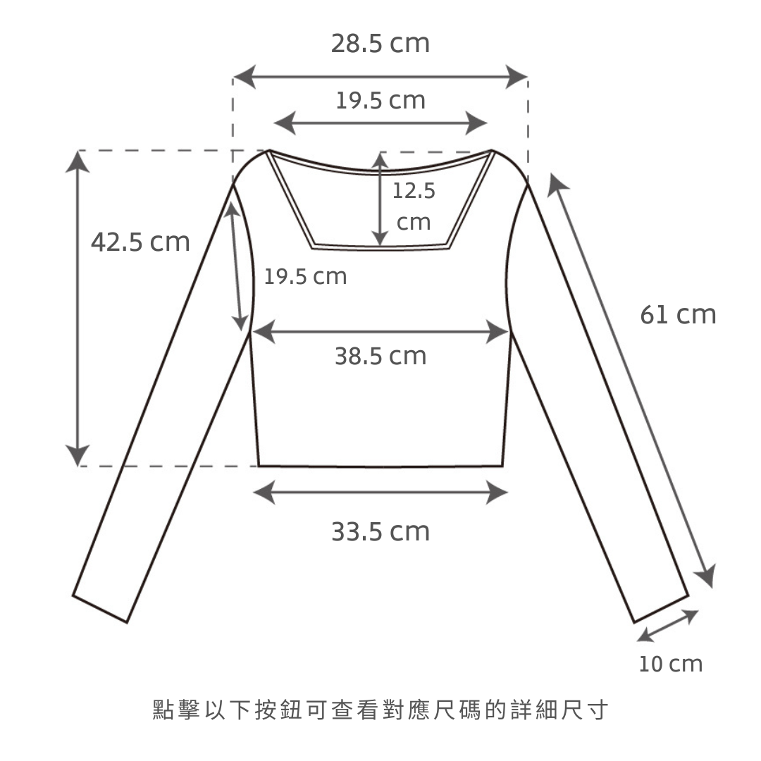 合身正肩版型 / 小方領設計 / 安全不走光的領型 / 衣長剛好觸碰褲頭 / 顯手臂幼