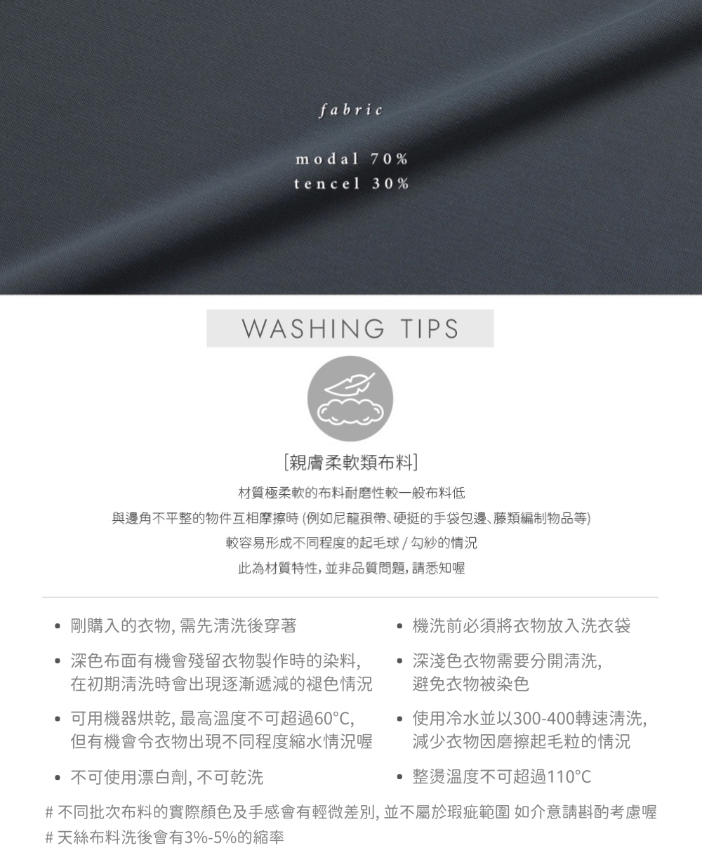 ※ 深色布料有機會殘留染制時的染料,會於初期清洗出現褪色情況並逐漸遞減喔
