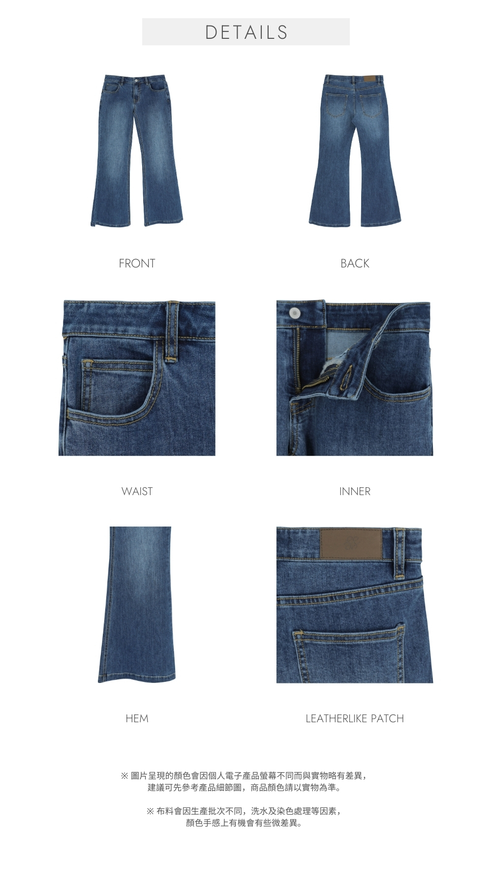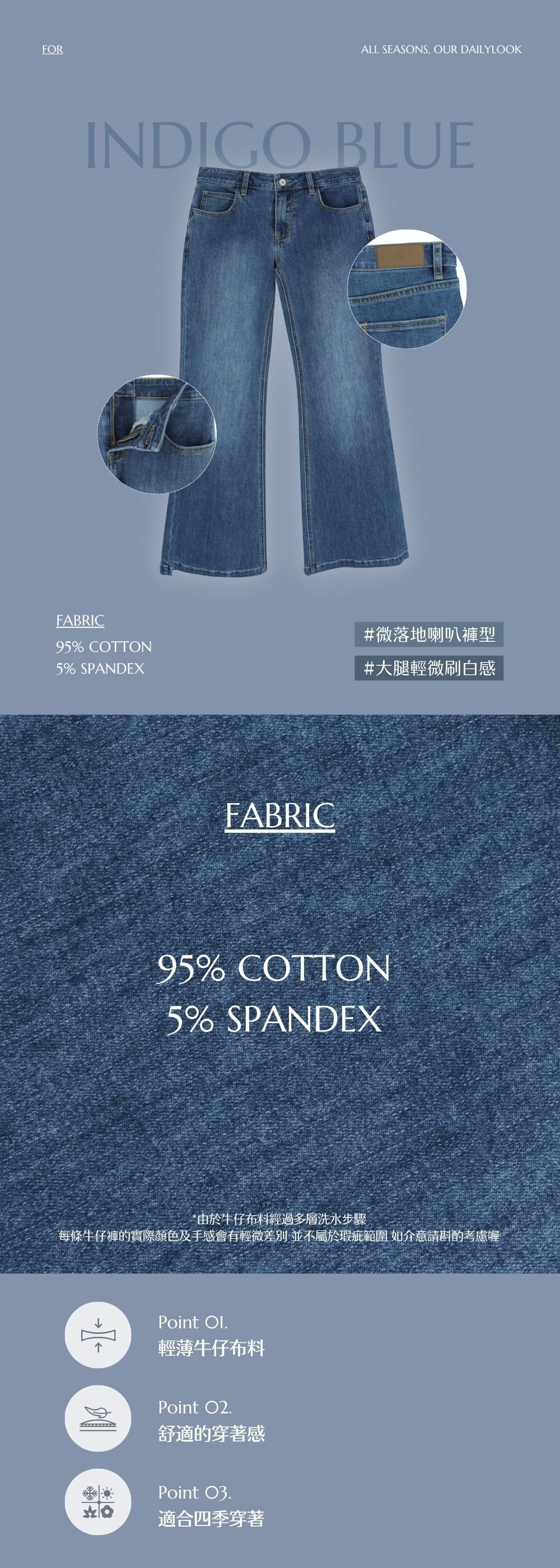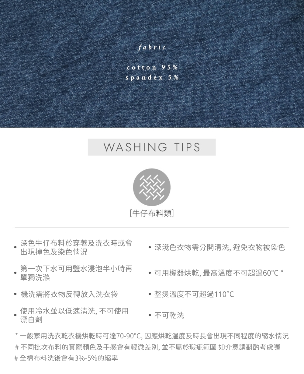 薄款 / 超親膚彈性牛仔布料 / 經典牛仔藍色 / 大腿輕微刷白感 / 撞色車線