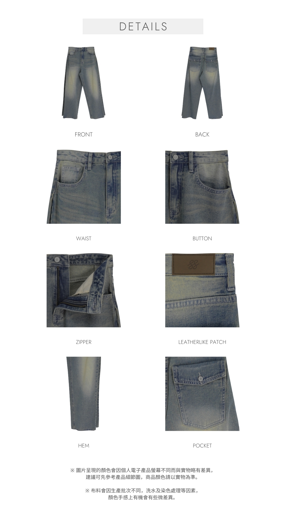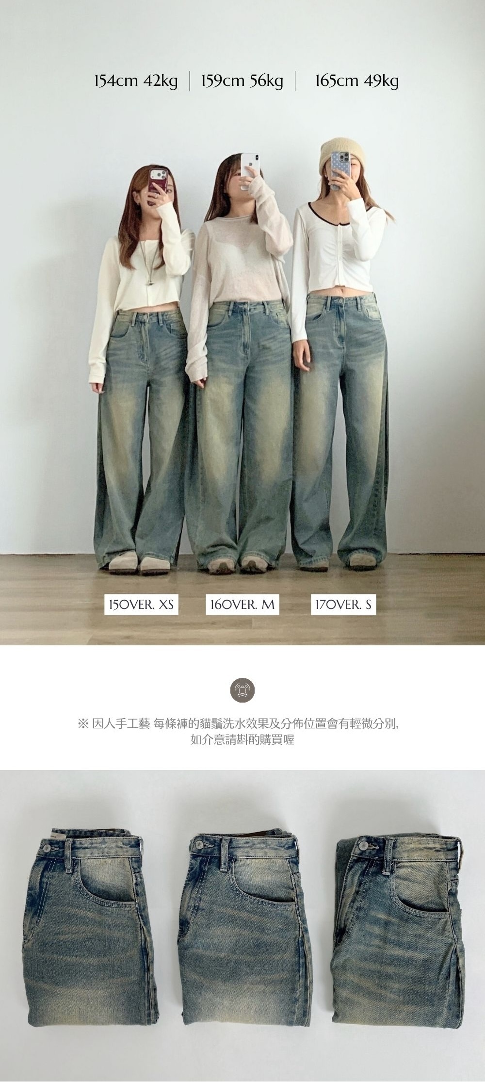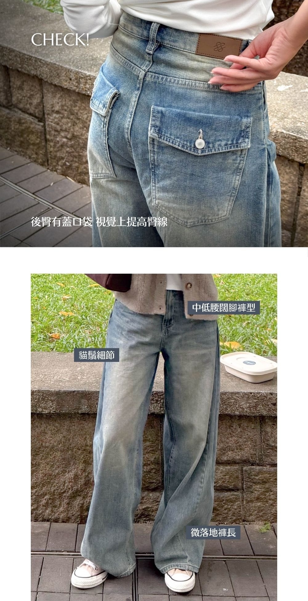 中等厚度 / 挺版牛仔布料 / 復古調洗水刷白 / 貓鬚細節 / 後有兩層式立體口袋