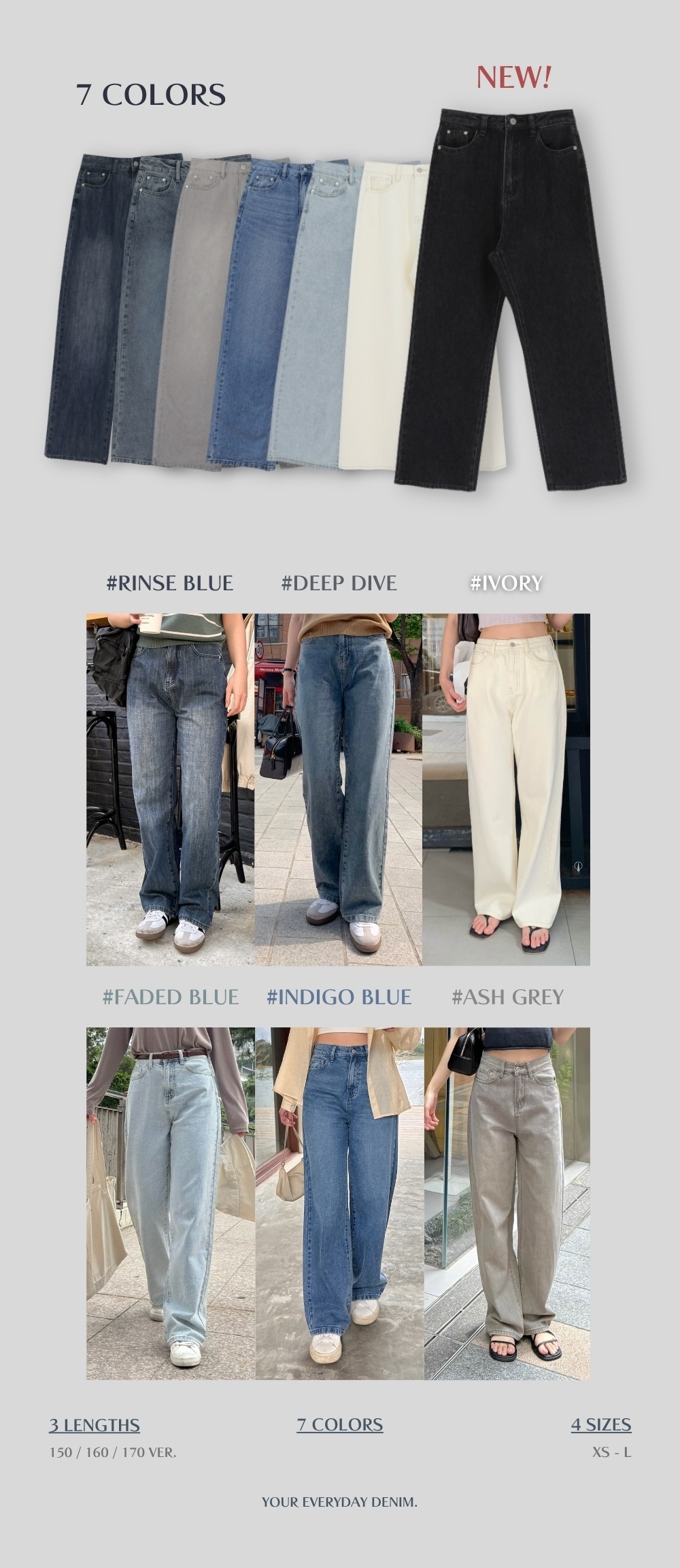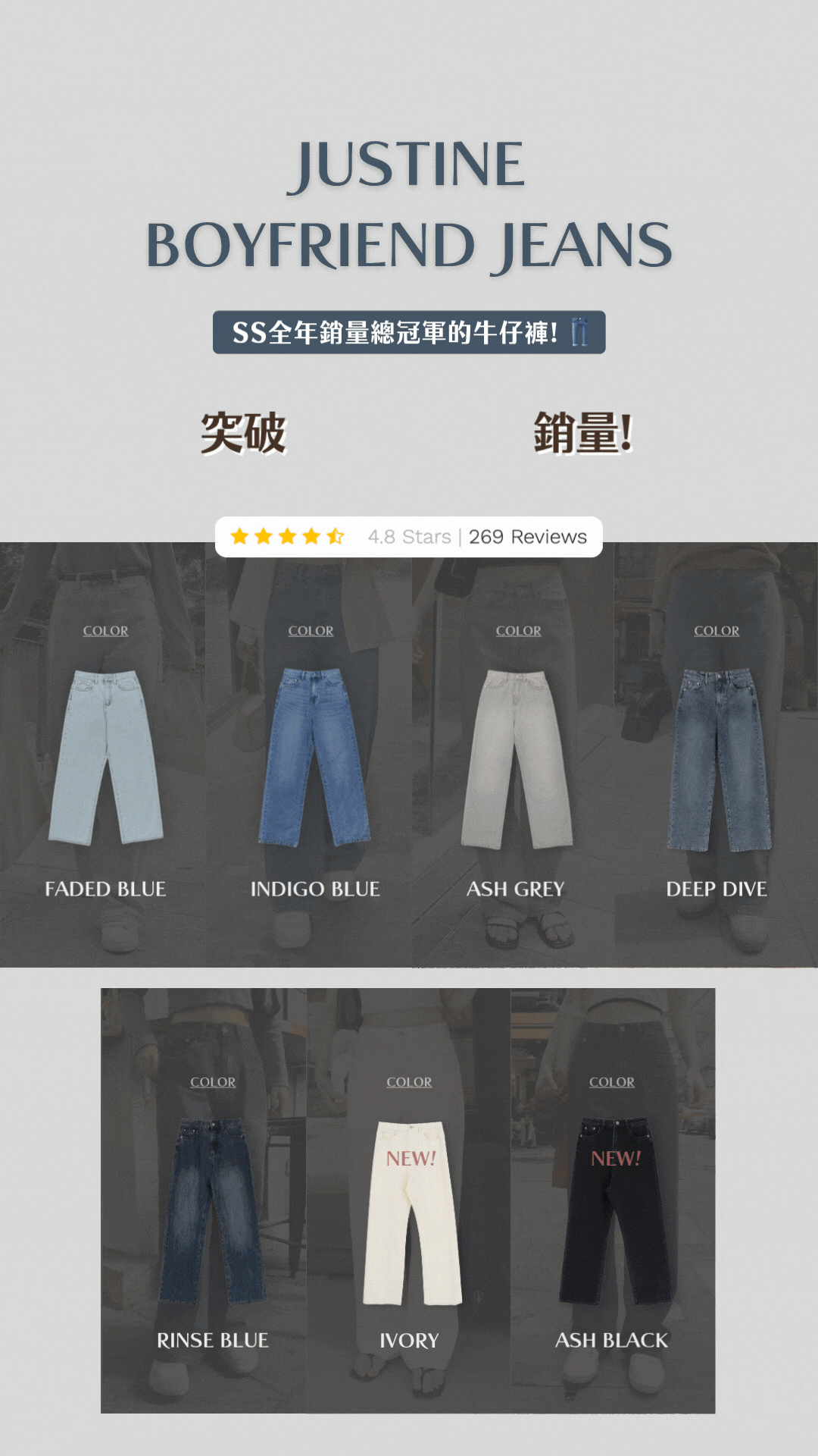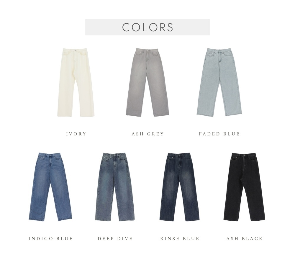 淺牛仔 > 洗水原色 = 牛仔藍 = 暗藍 > 霧黑 > 白 > 淺霧灰