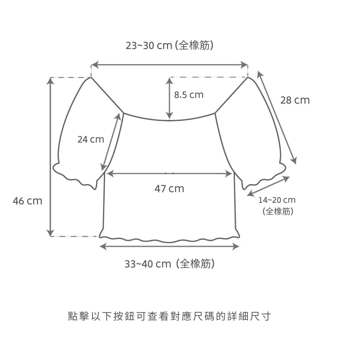 ⋄ 領口、袖口及衣尾為橡筋鬆緊