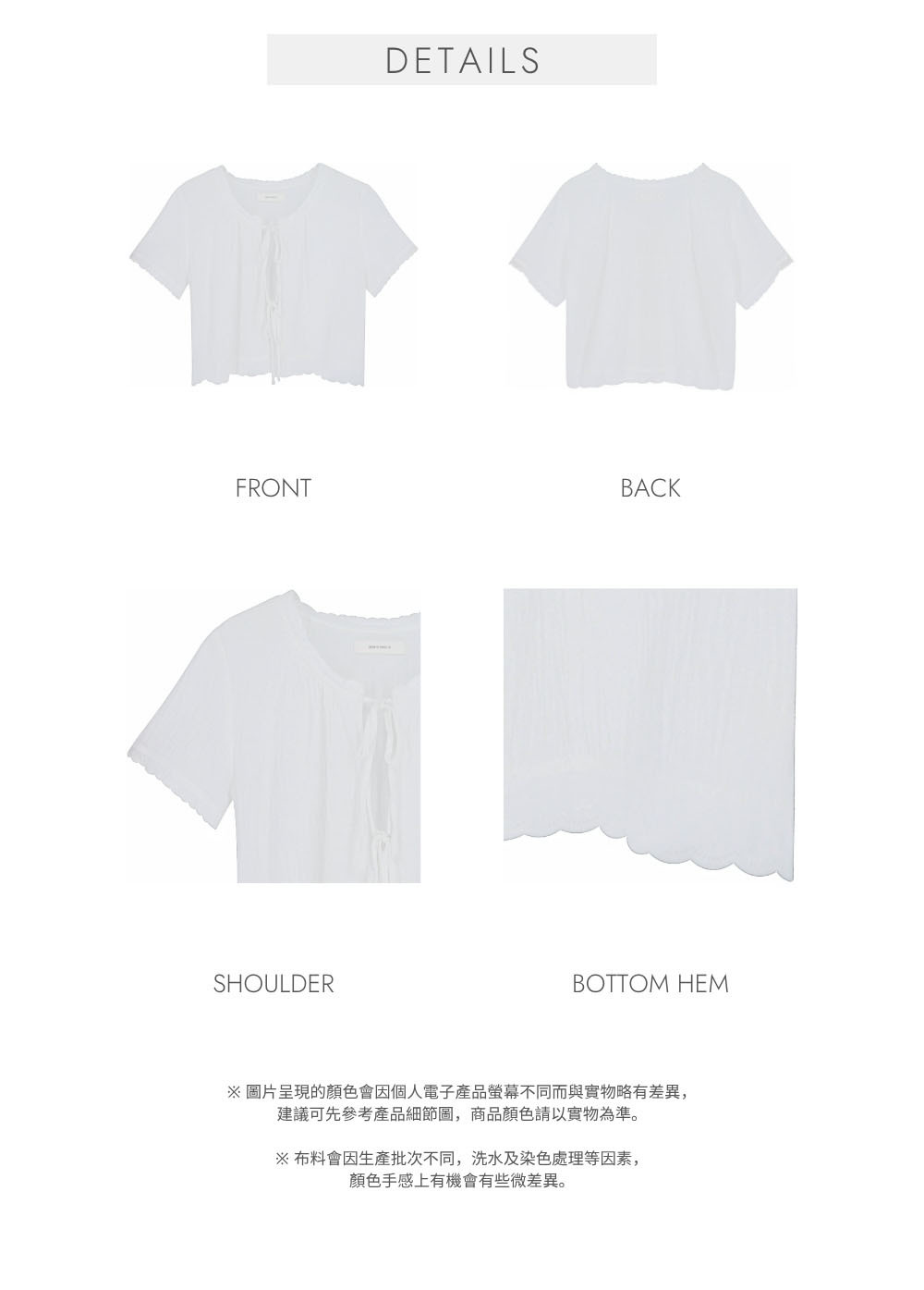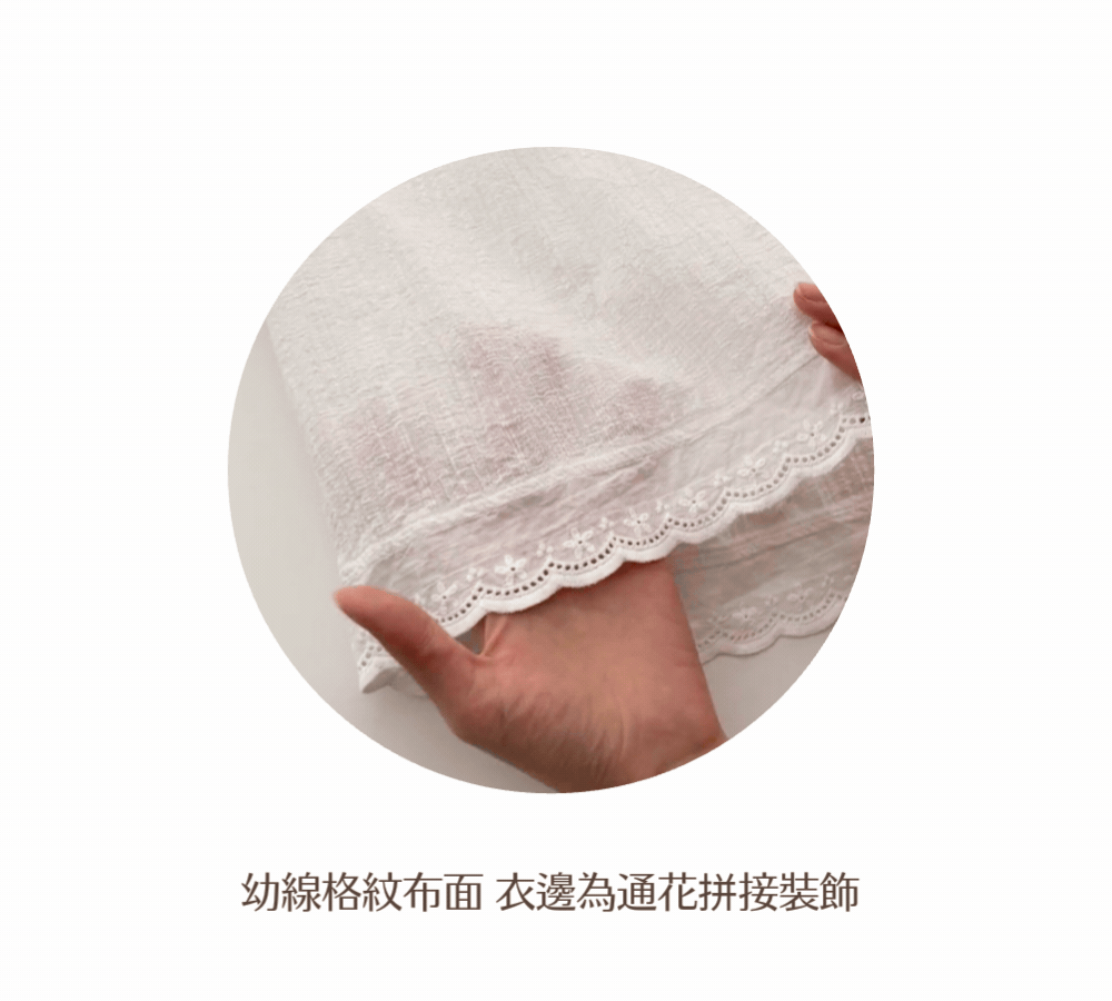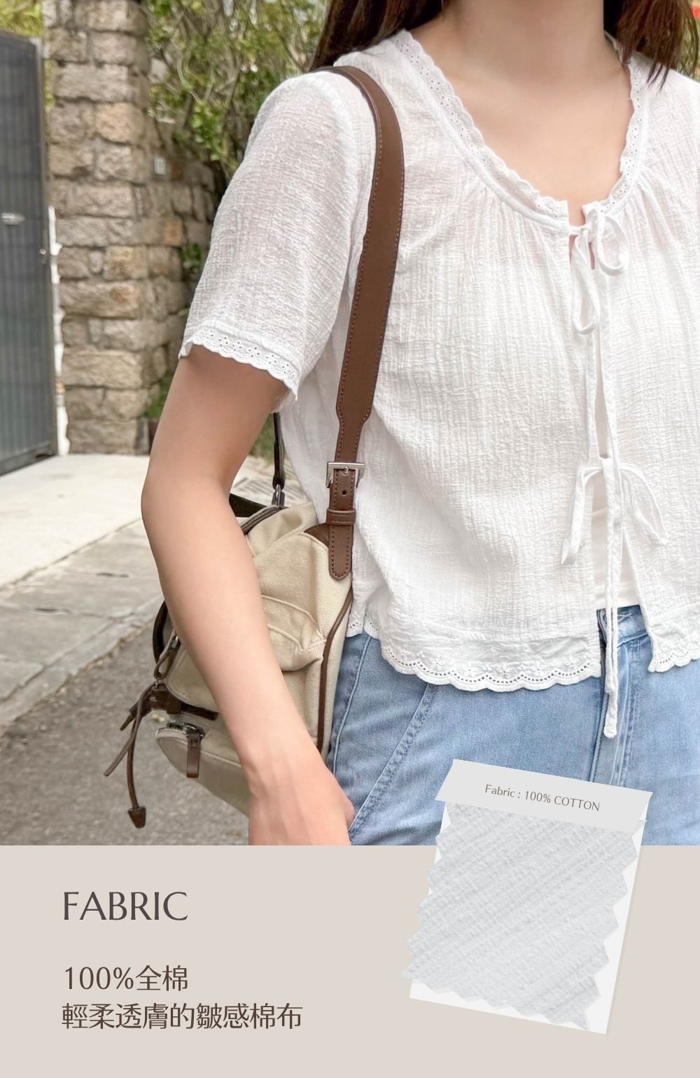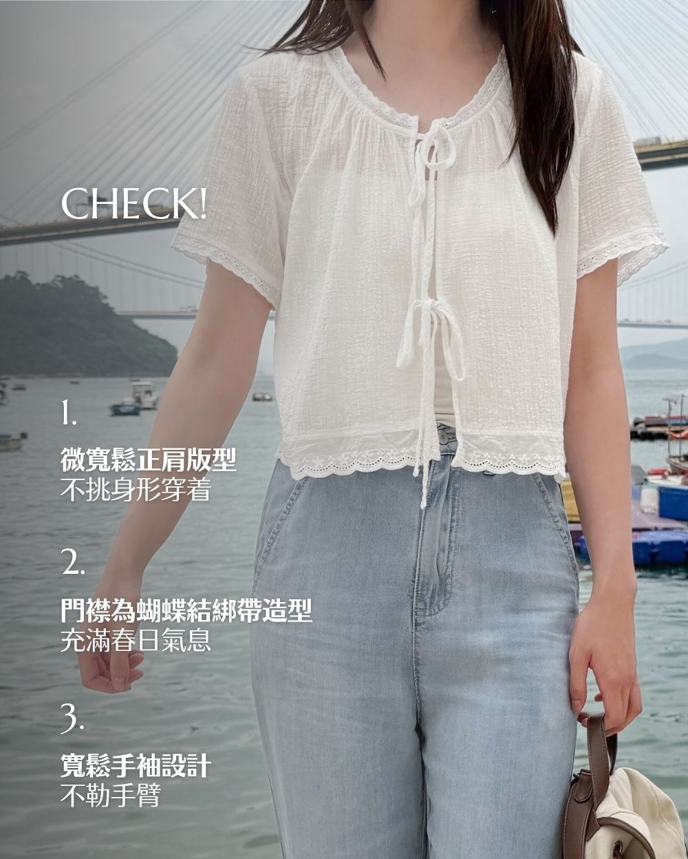 洗後免燙 / 通花拼接裝飾 / 門襟為蝴蝶結綁帶造型 / 需配搭bra top