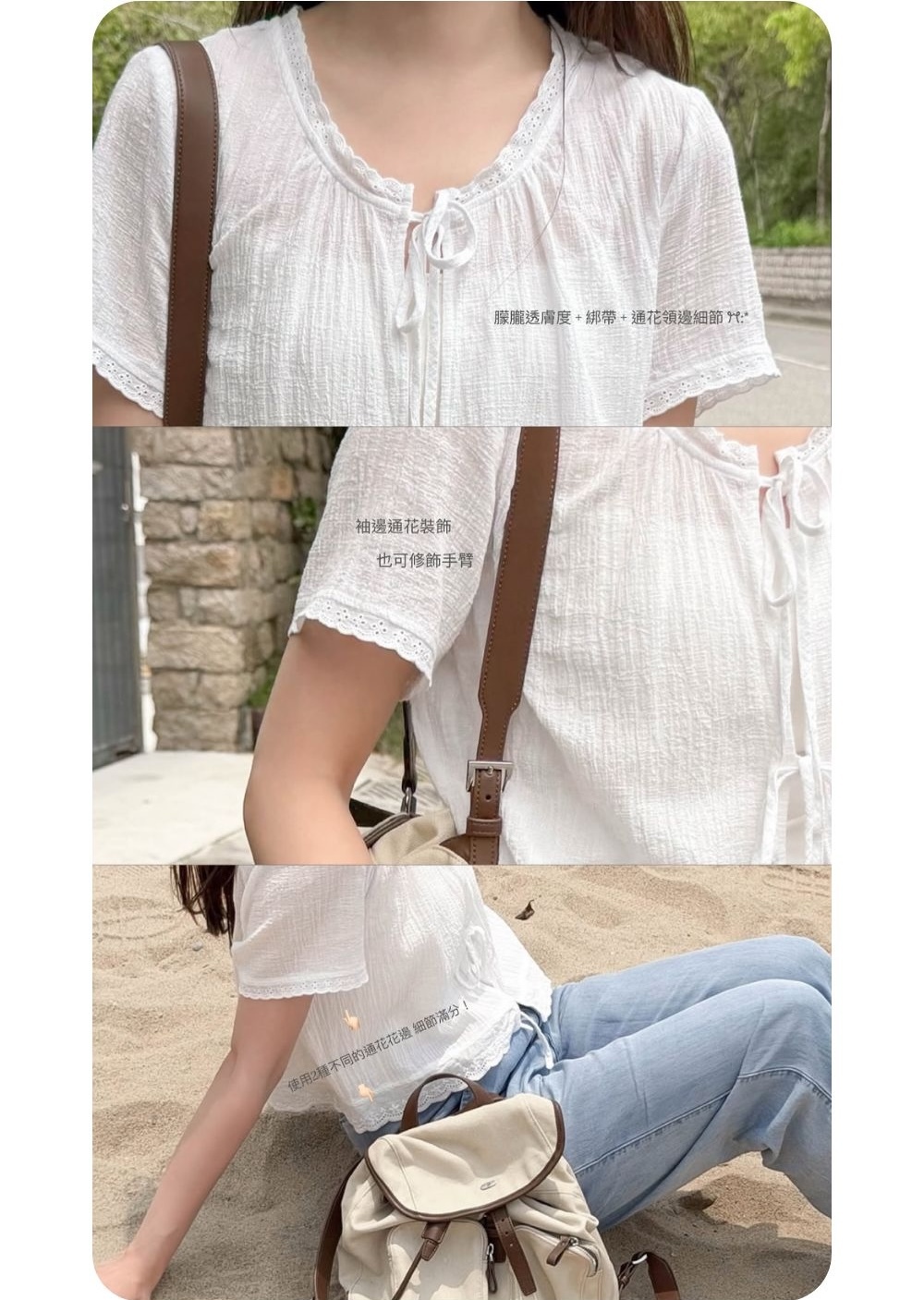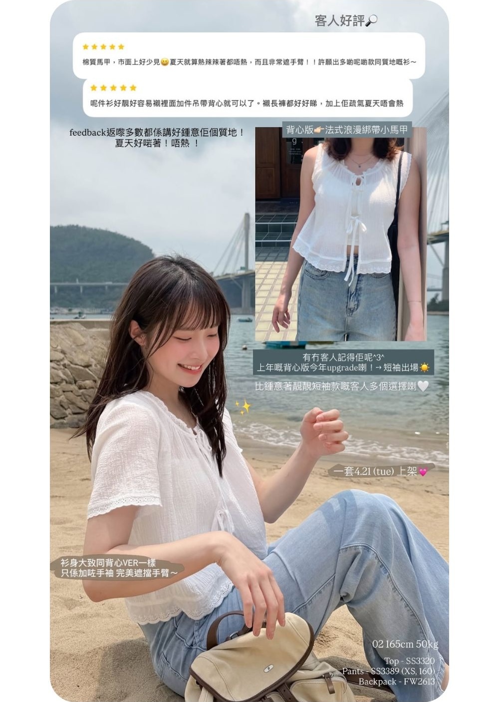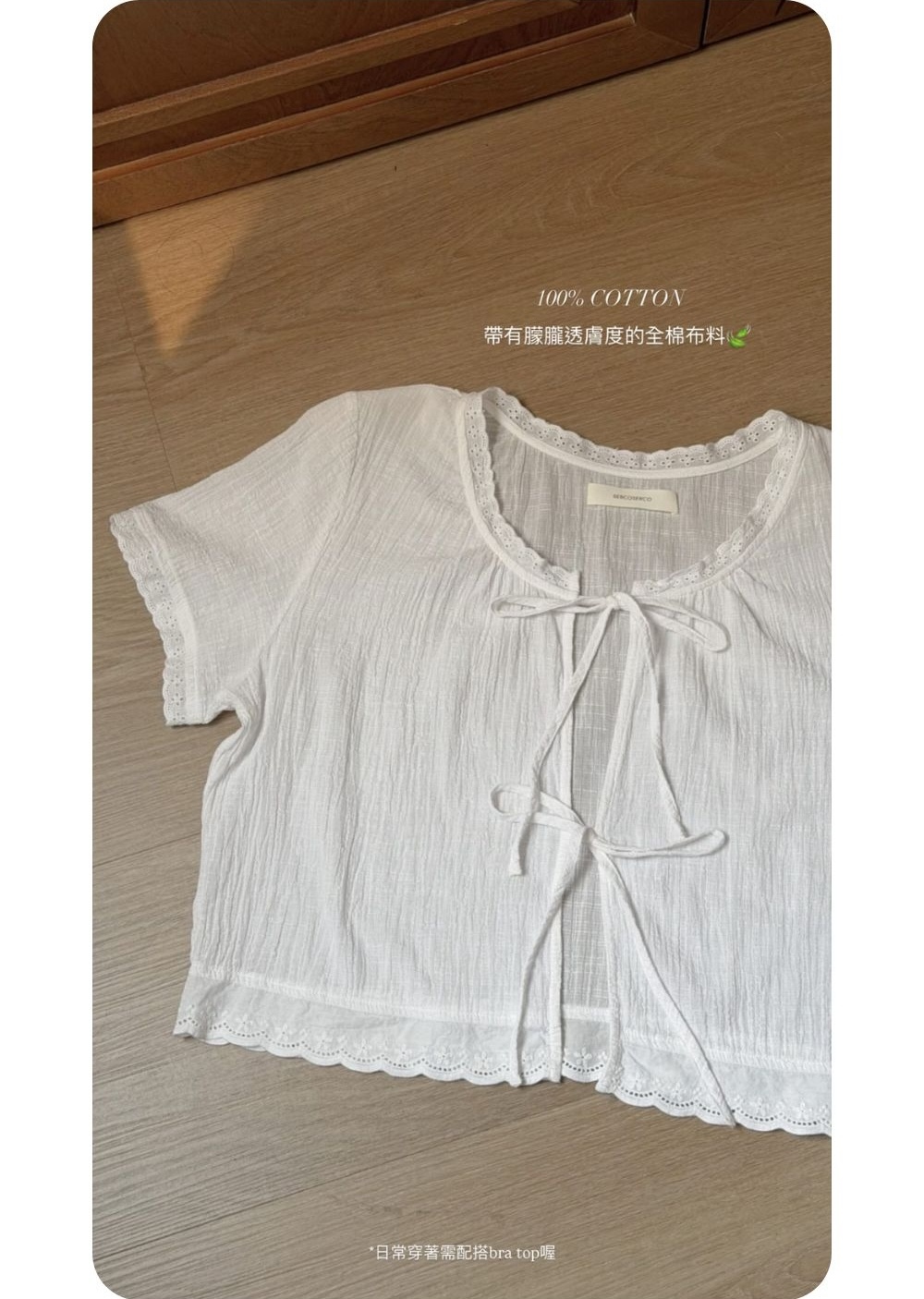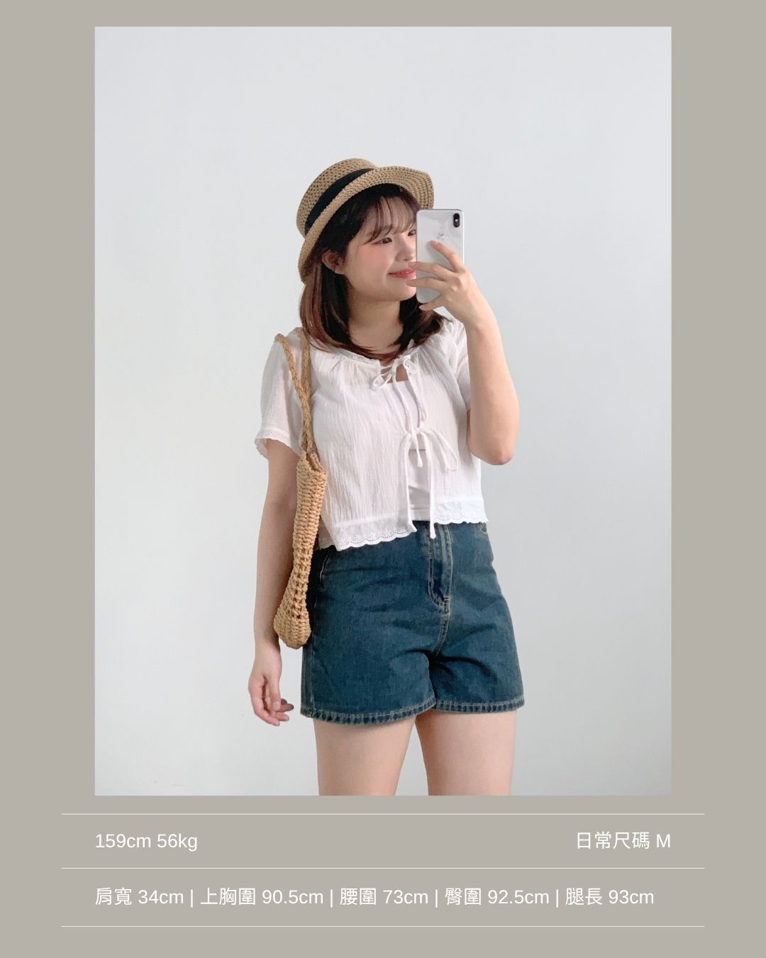 洗後免燙 / 通花拼接裝飾 / 門襟為蝴蝶結綁帶造型 / 需配搭bra top