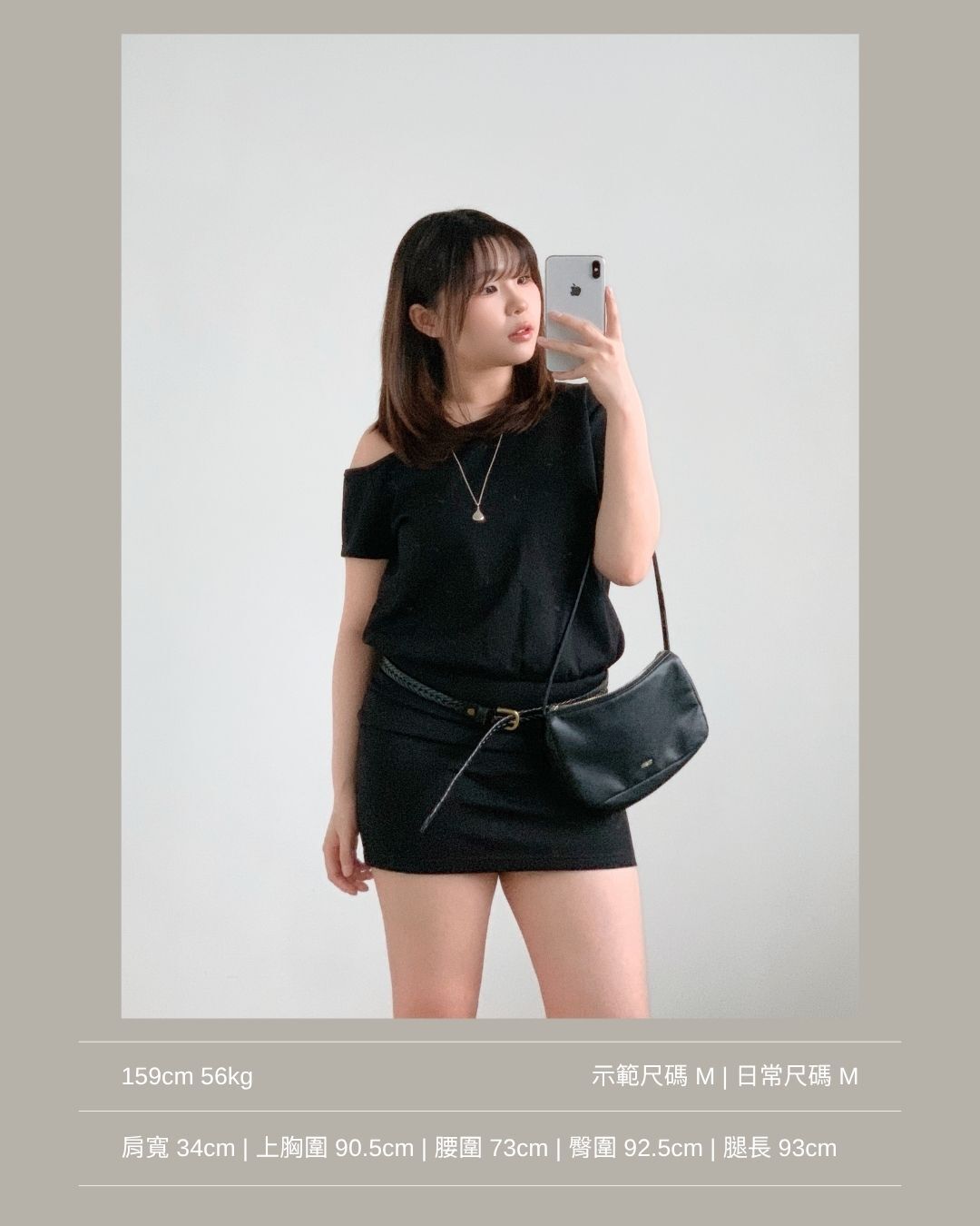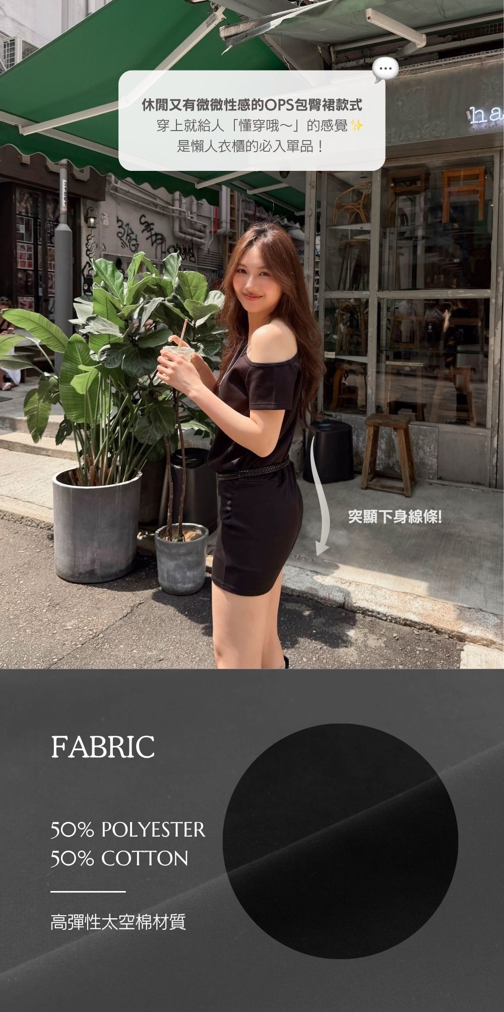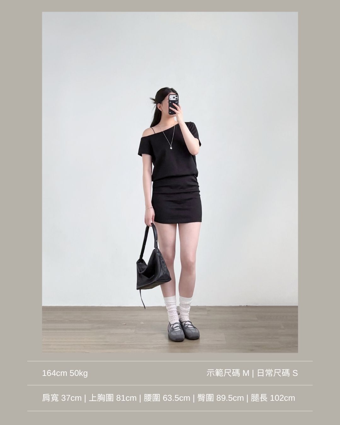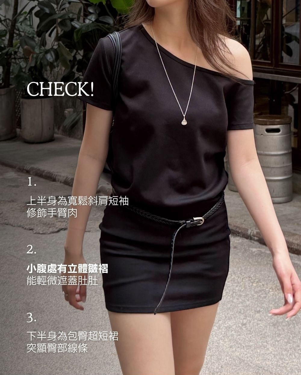 上半身為寬鬆斜肩短袖 / 修飾手臂byebye肉 / 下身為包臀超短裙 /