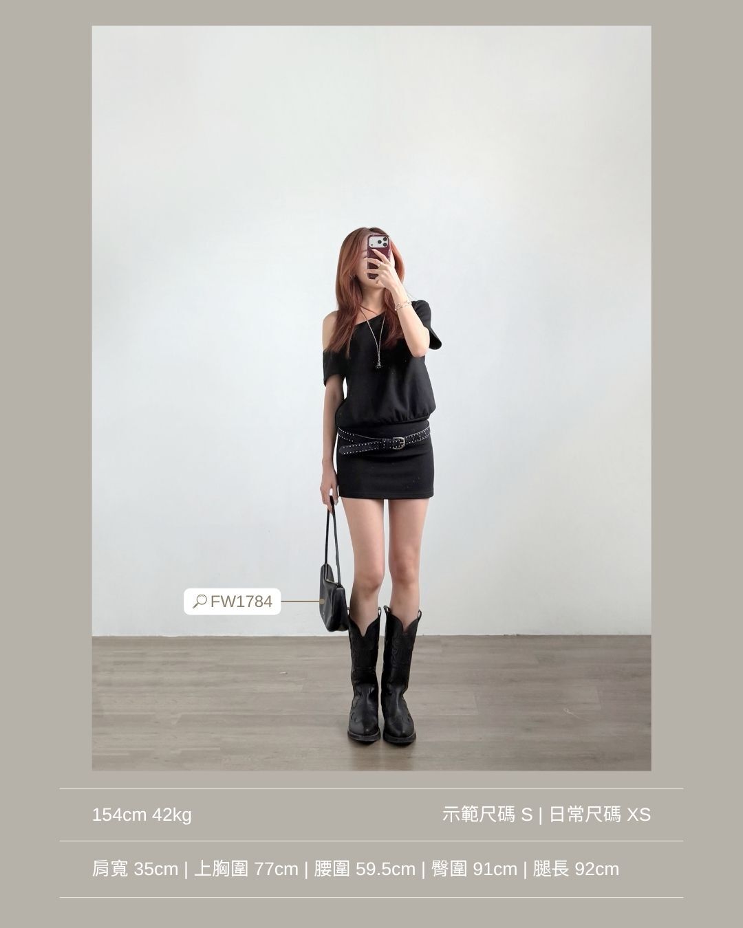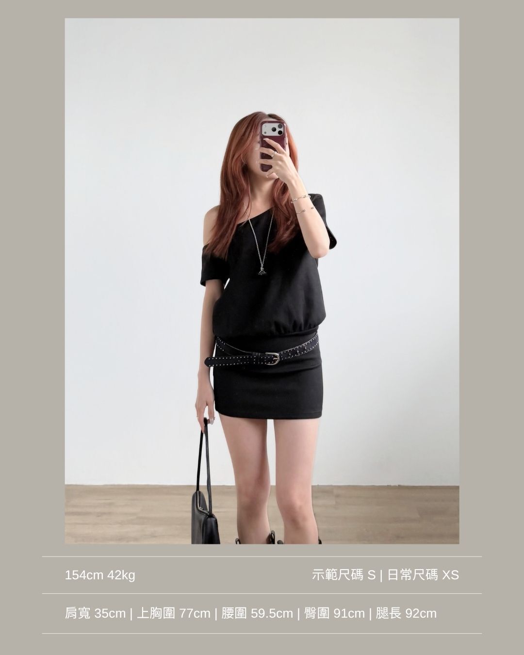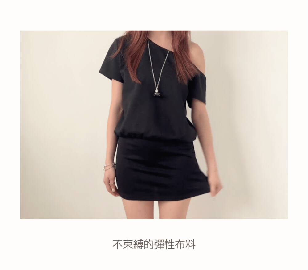 上半身為寬鬆斜肩短袖 / 修飾手臂byebye肉 / 下身為包臀超短裙 /