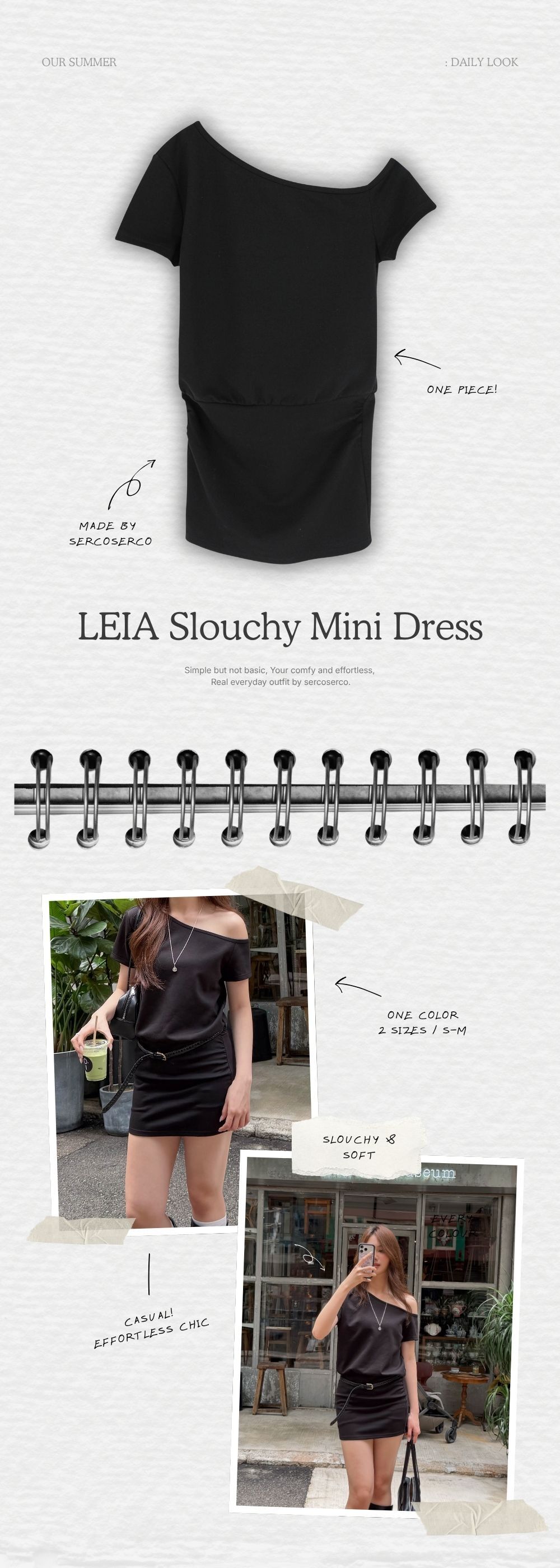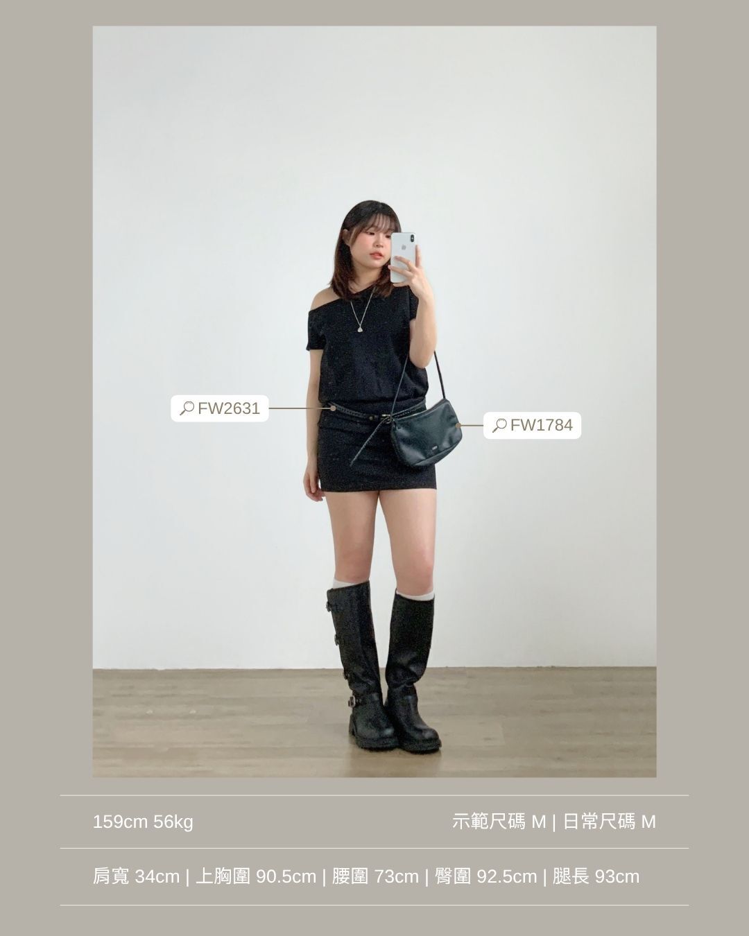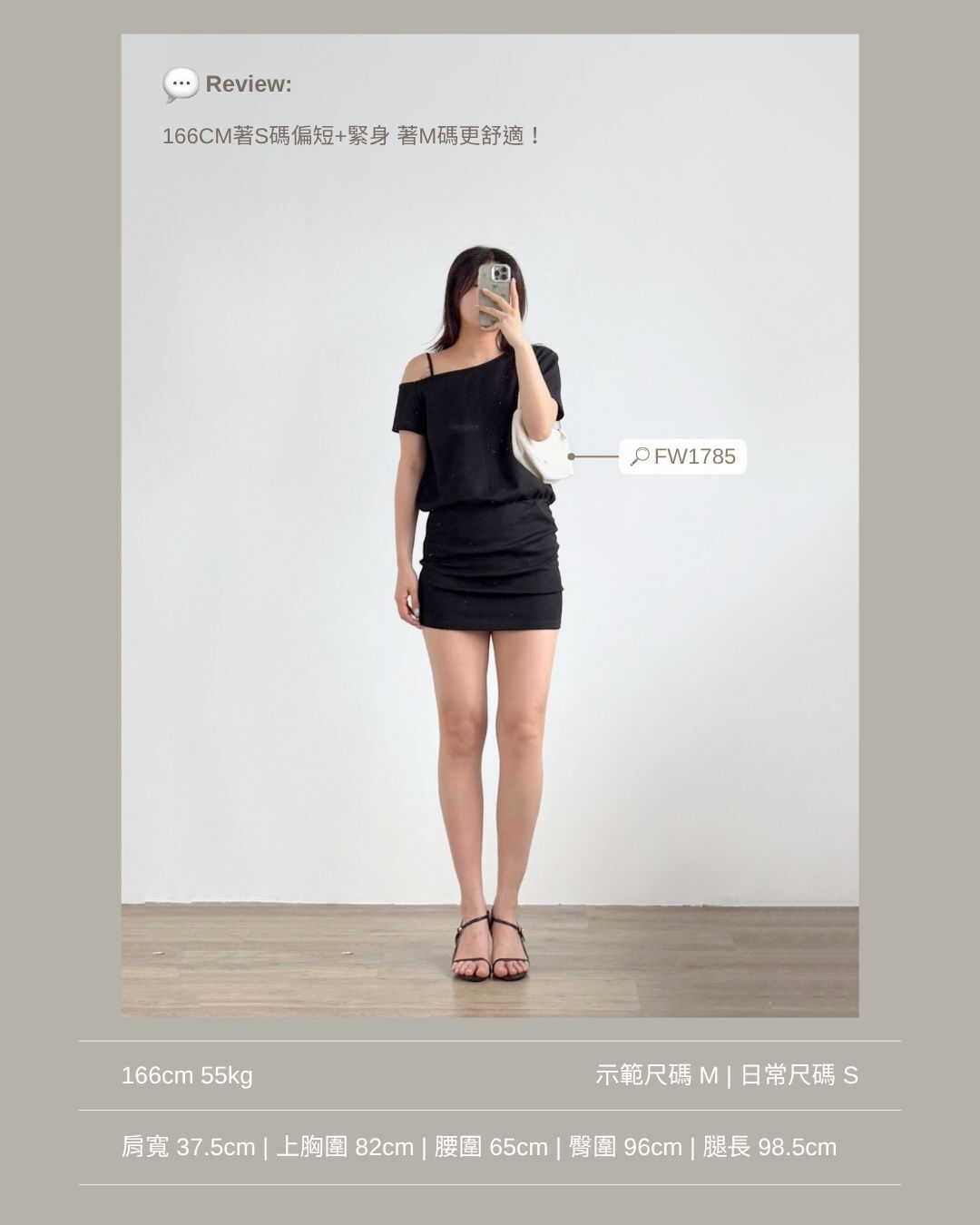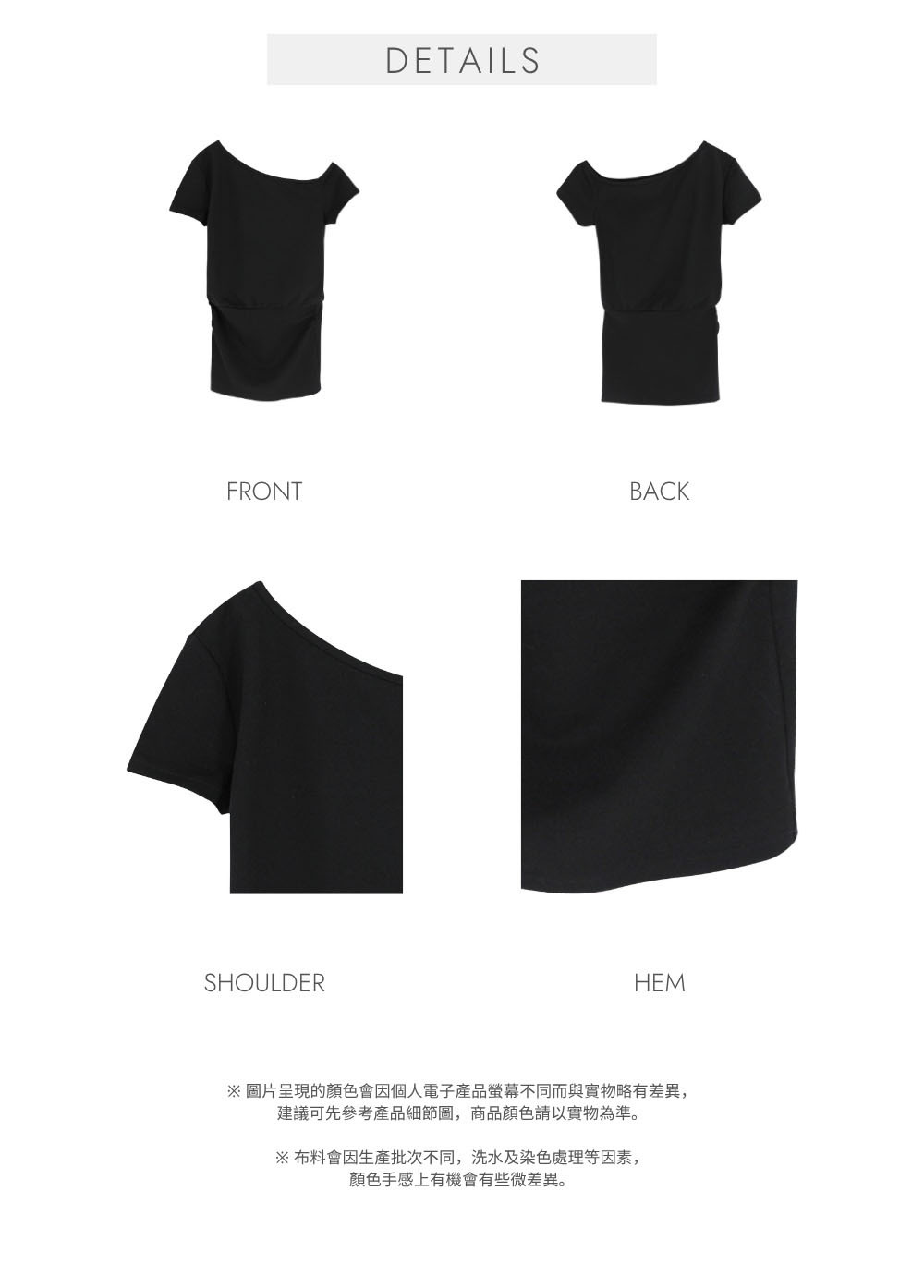 上半身為寬鬆斜肩短袖 / 修飾手臂byebye肉 / 下身為包臀超短裙 /