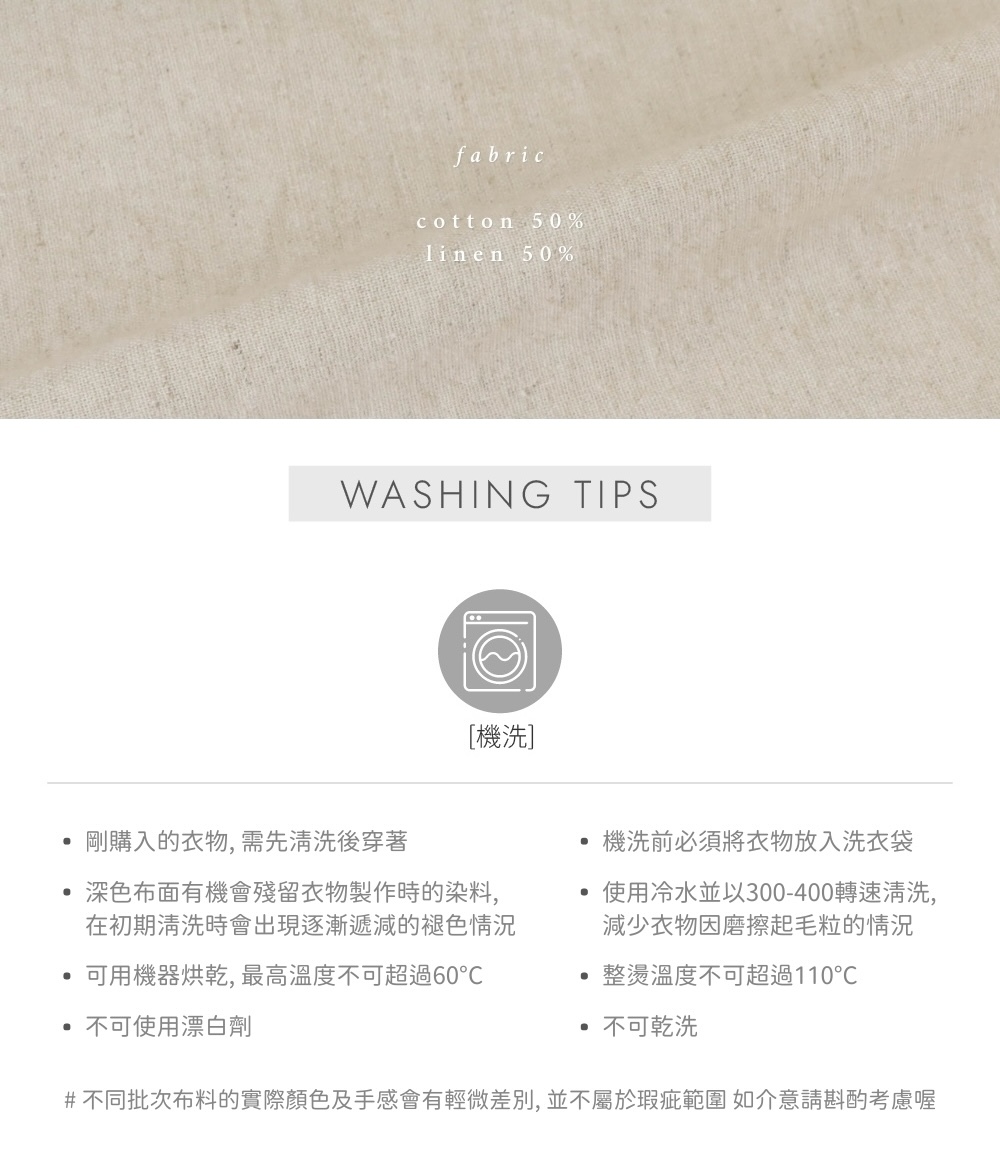 ※ 天然布料表面會有大小不一的原生亞麻顆粒,或會有些微拮肉感,請因應個人的接受程度購入喔♡