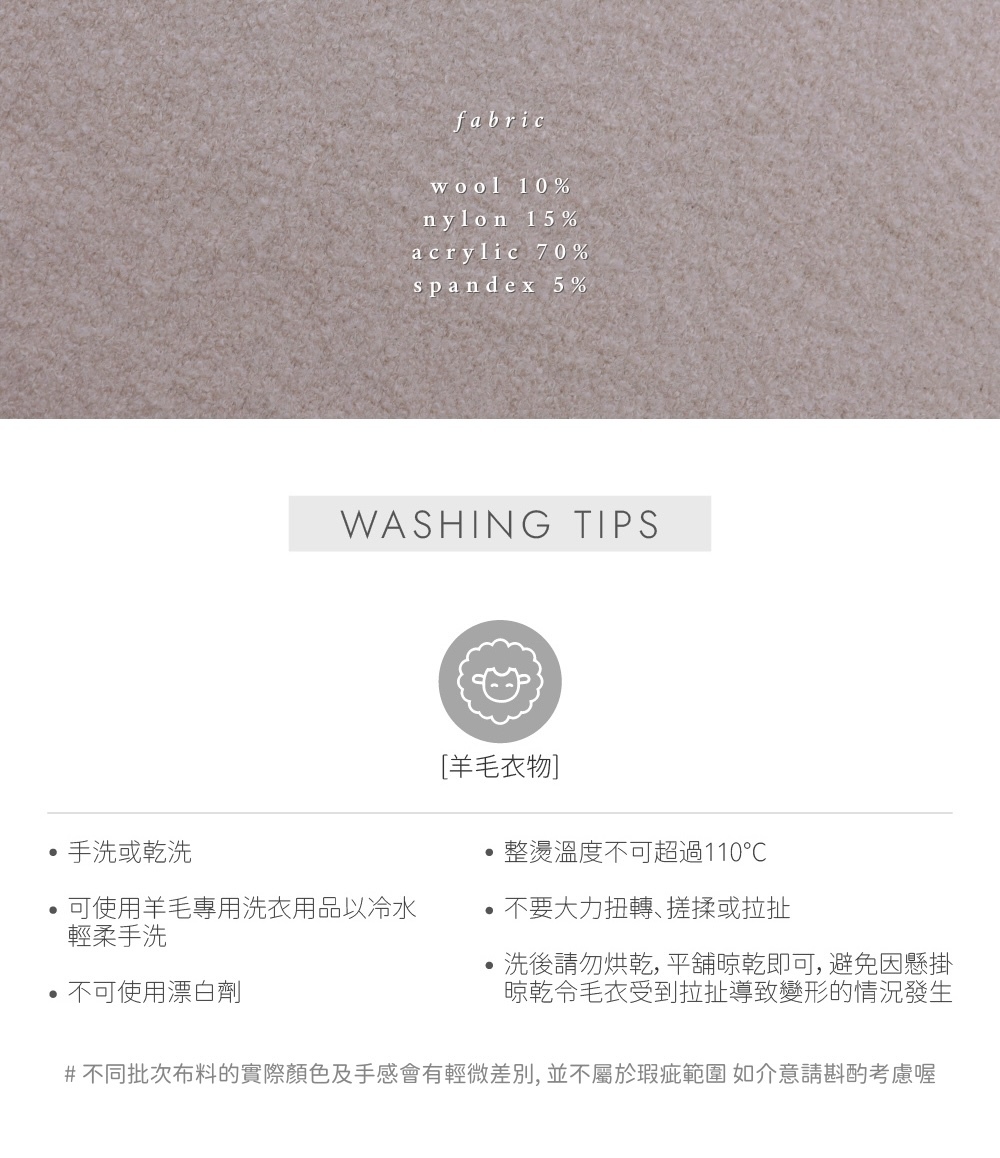 ※ 羊毛衣物建議手洗 / 乾洗,可於清洗前查閱下方洗滌資訊