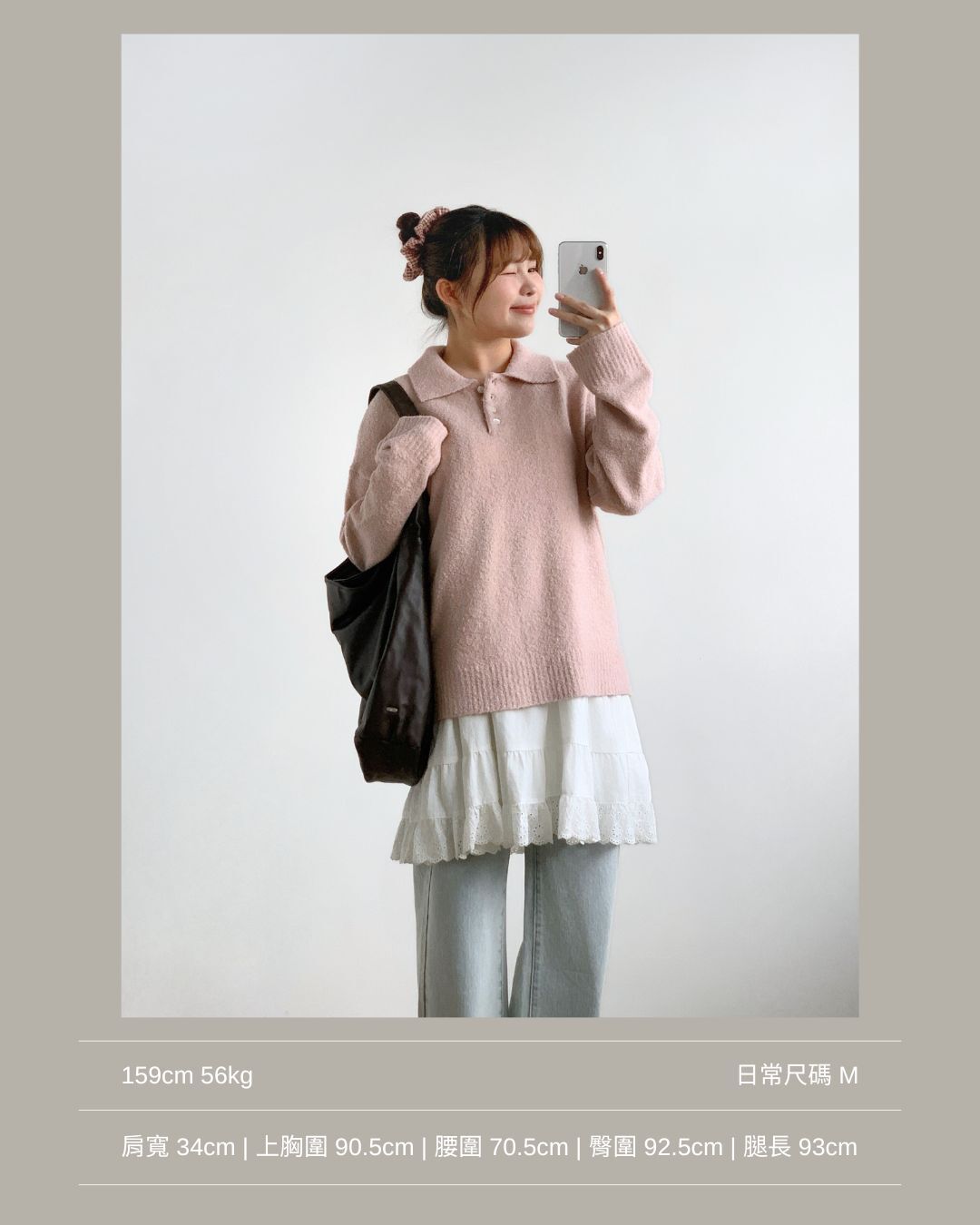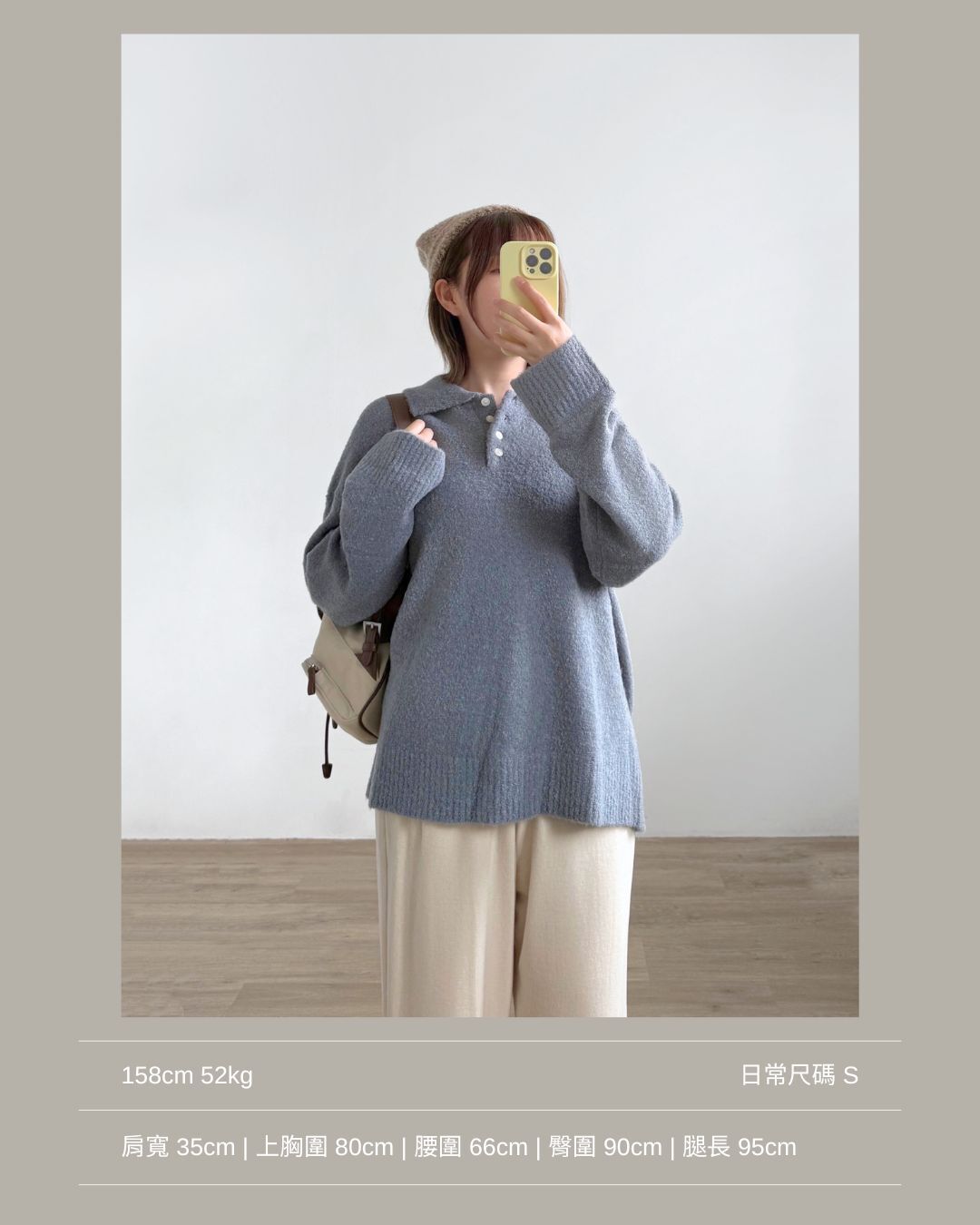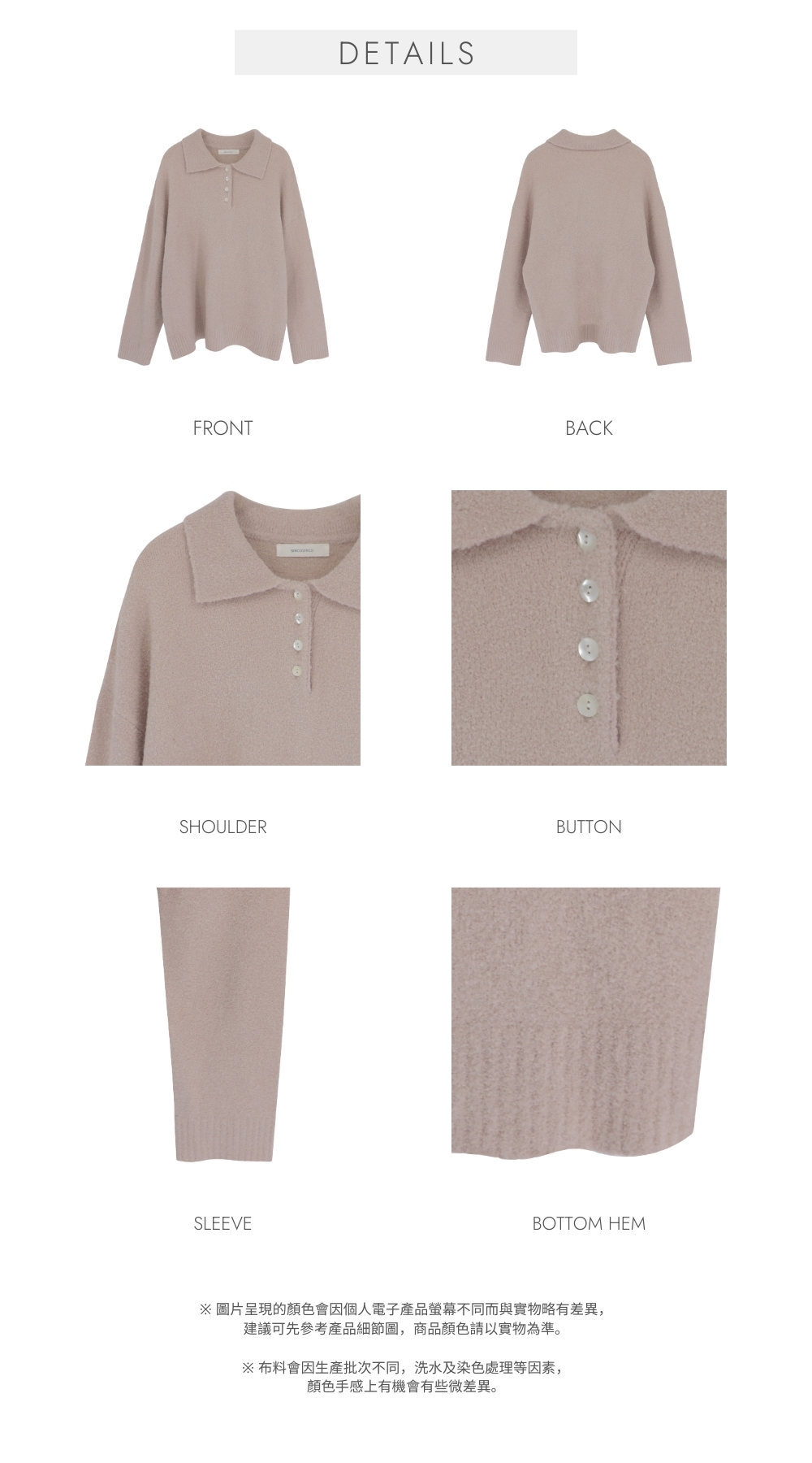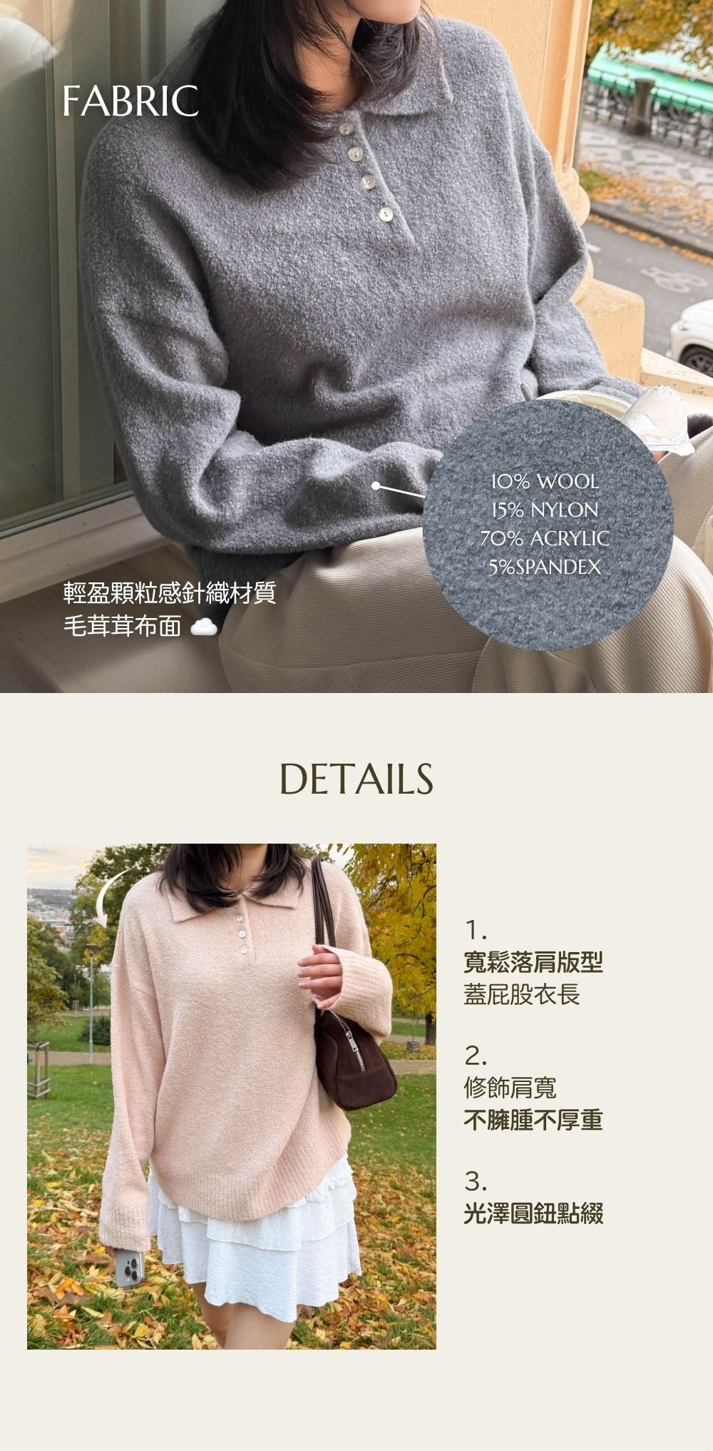 中等厚度 / 輕盈顆粒感針織材質 / 10%WOOL / 幻彩光澤圓鈕點綴
