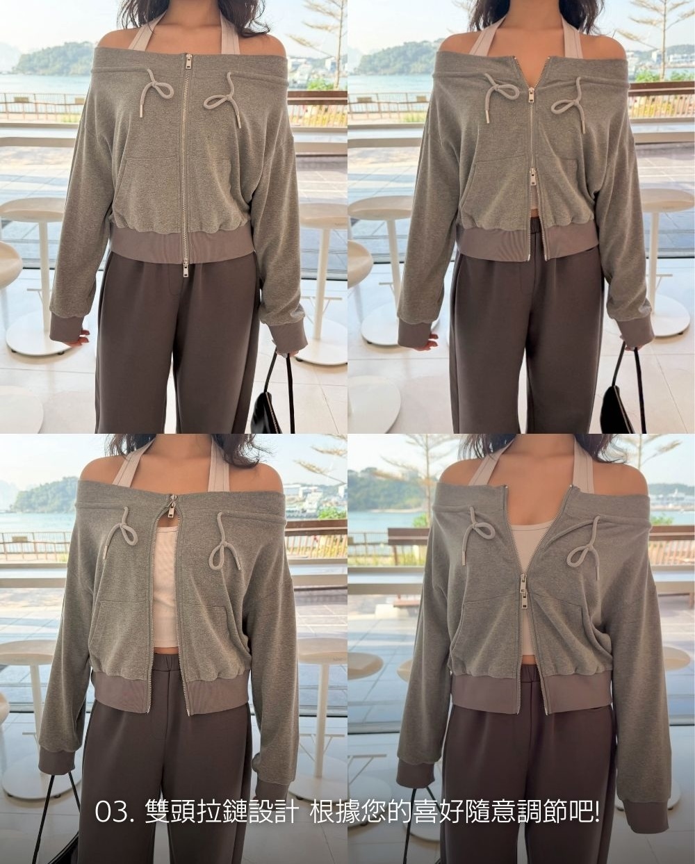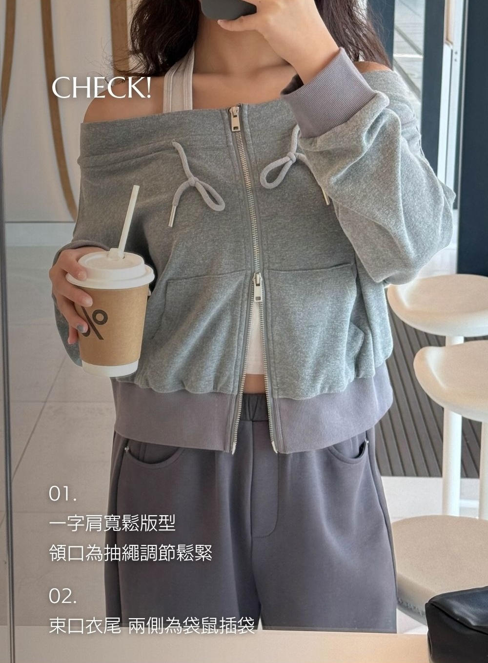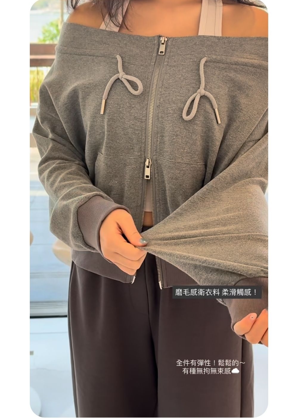 結合了一字肩上衣 + 拉鏈衛衣外套