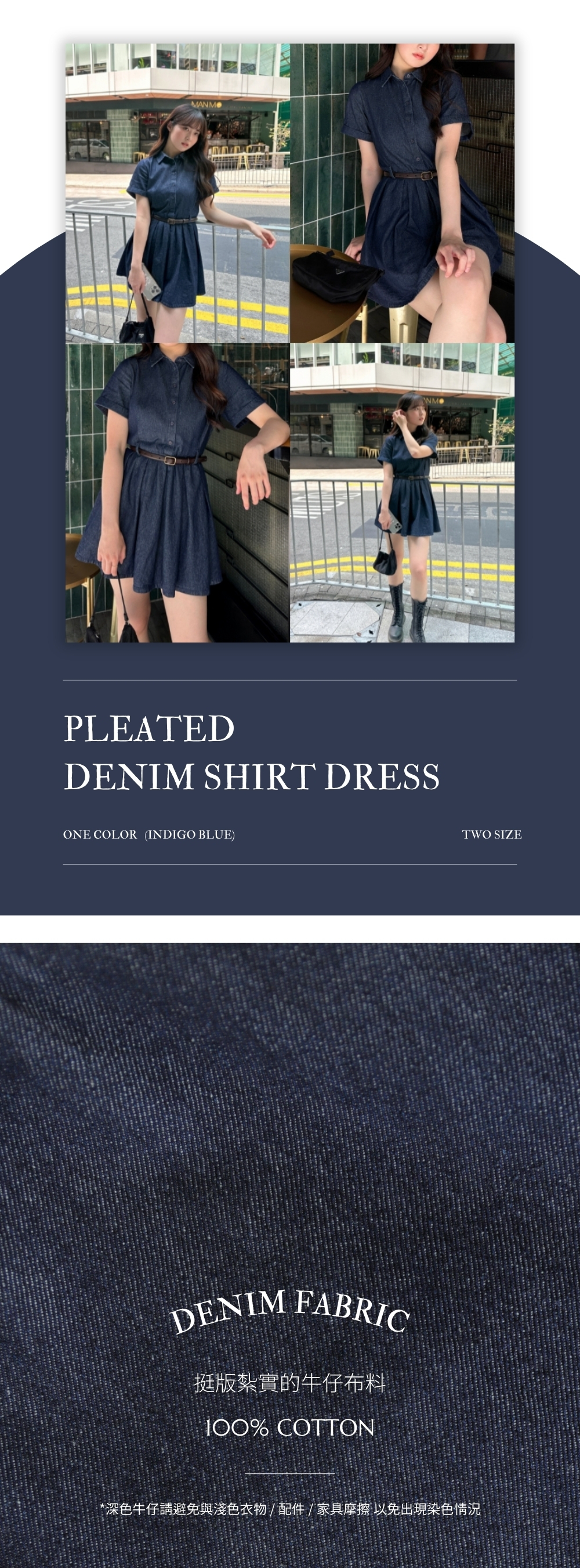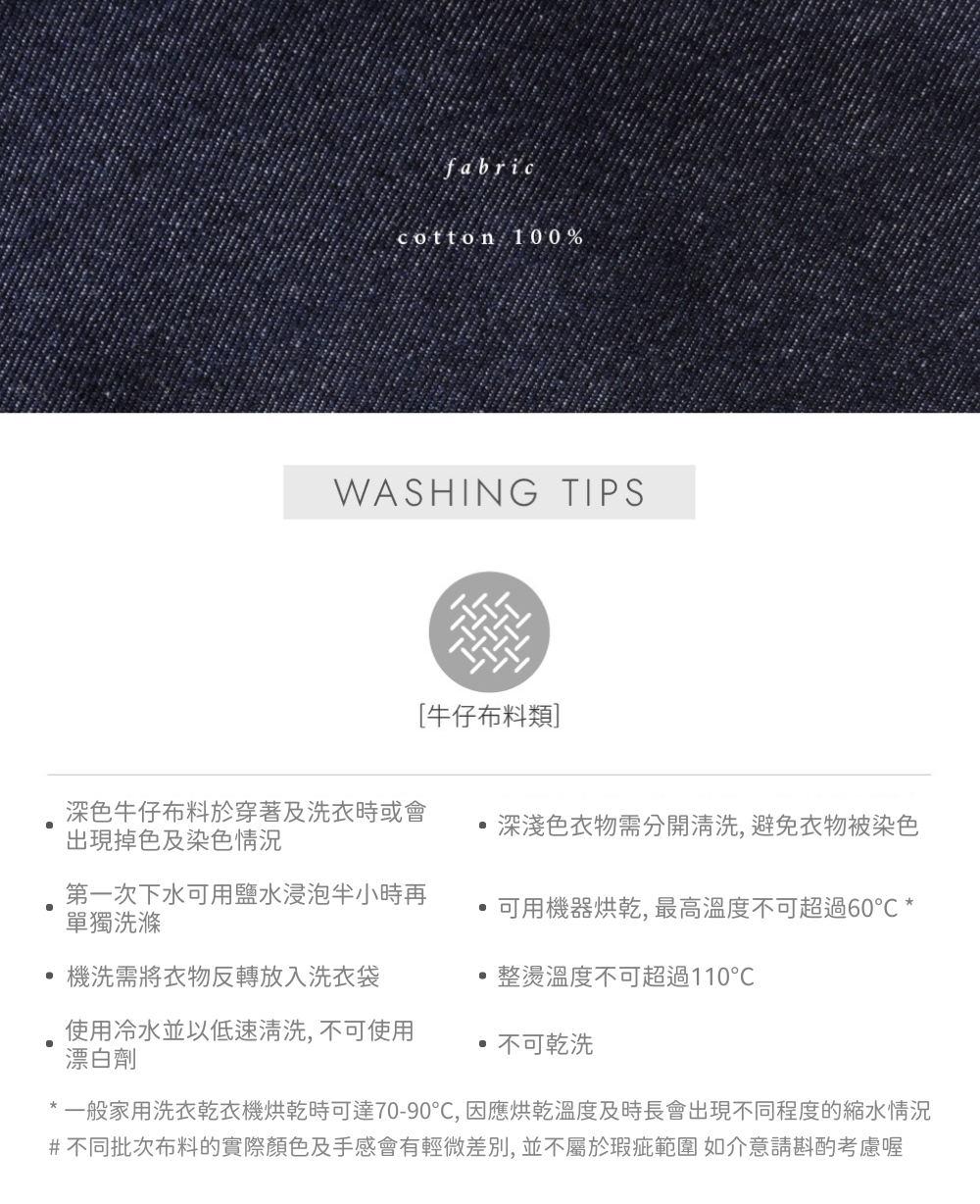 ※ 深色牛仔請避免與淺色衣物 / 配件 / 家具摩擦,以免出現染色情況