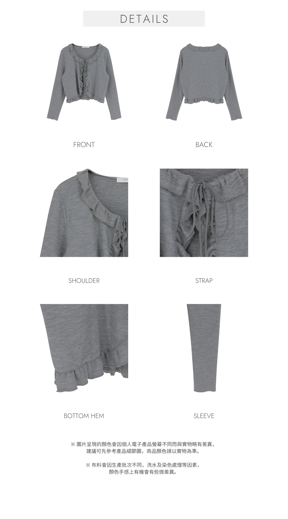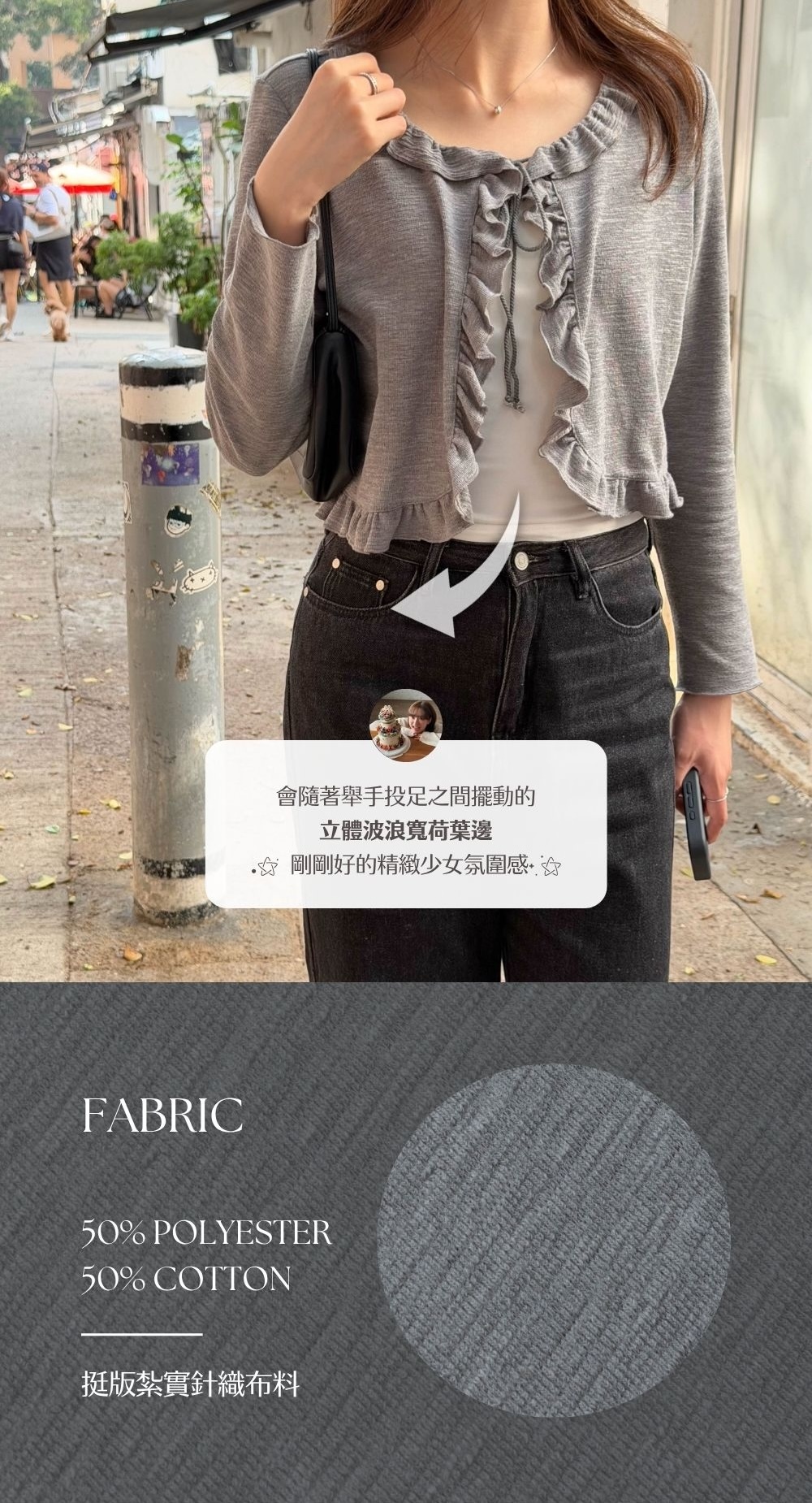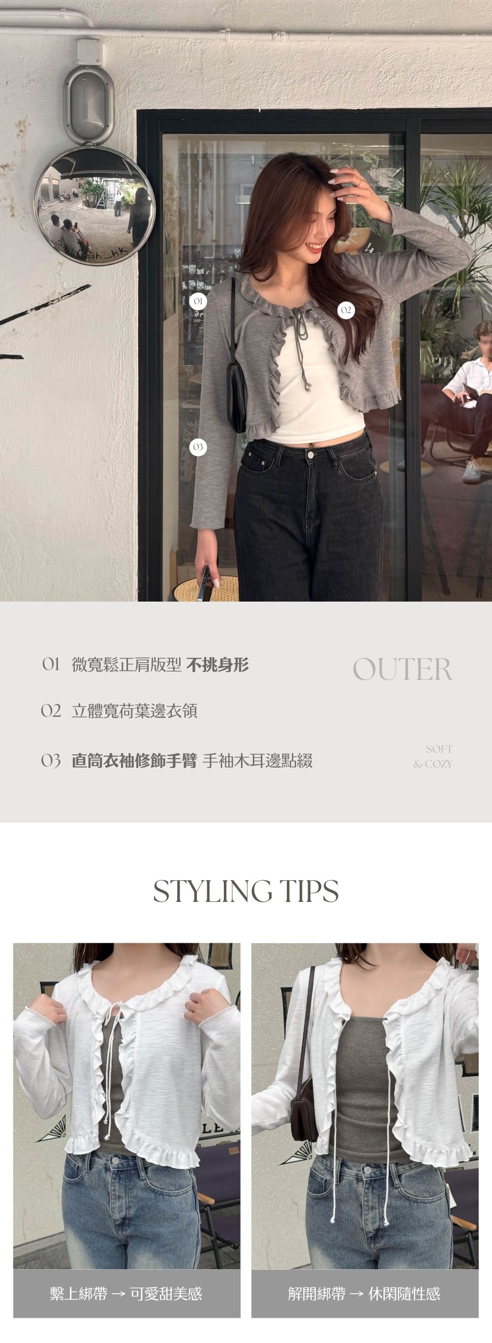 微寬鬆正肩版型 / 適合任何身形 / 立體寬荷葉邊衣領 / 手袖木耳邊點綴 / 顯瘦效果max