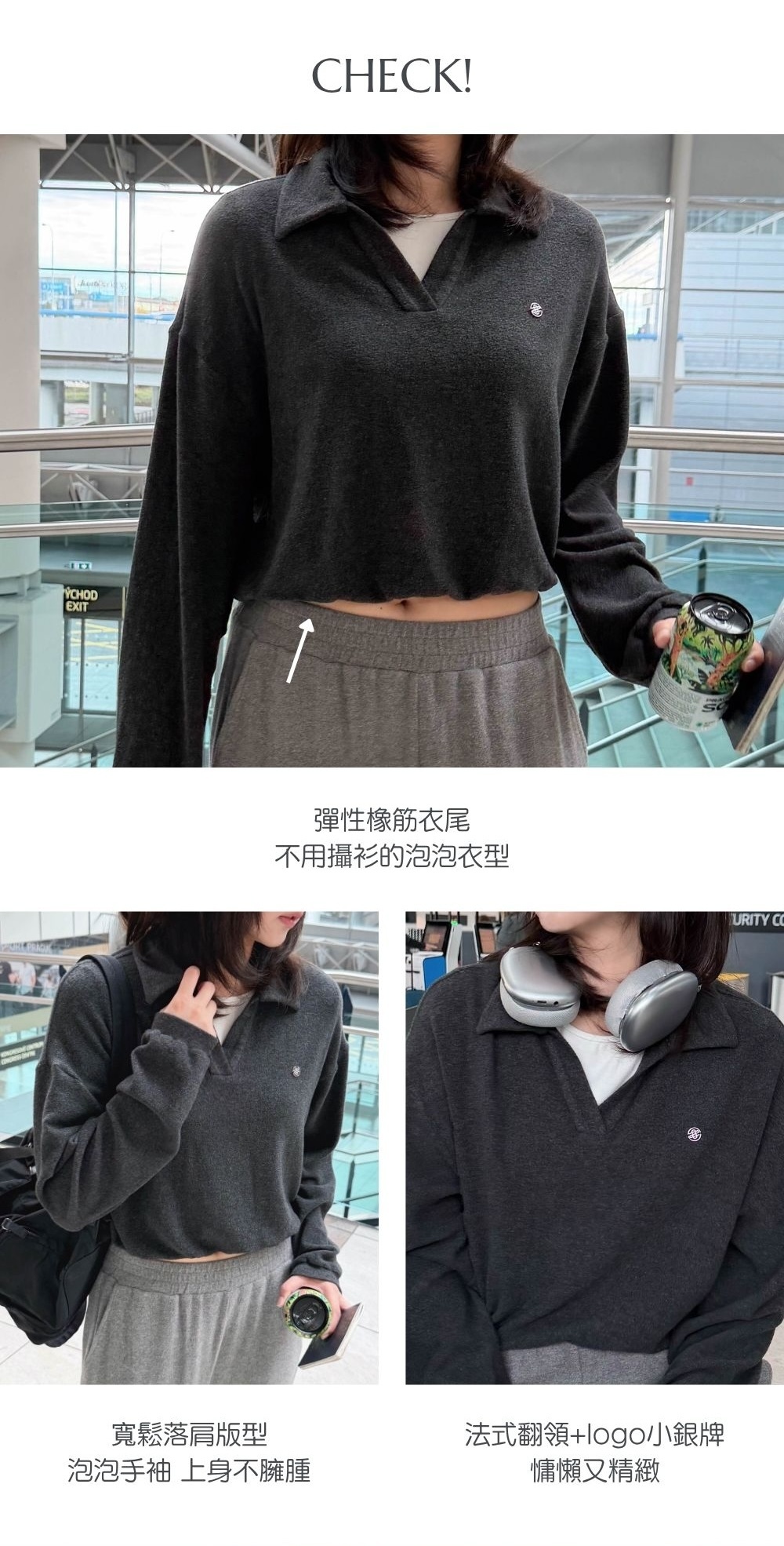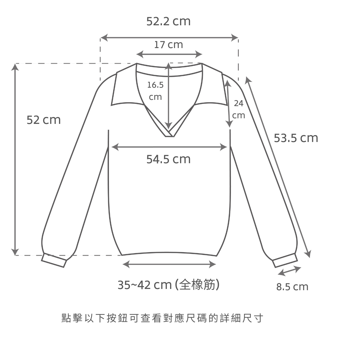 寬鬆落肩版型 / 法式翻領 / 寬鬆直筒衣袖 / 彈性橡筋衣尾 / 不用攝衫的泡泡衣型