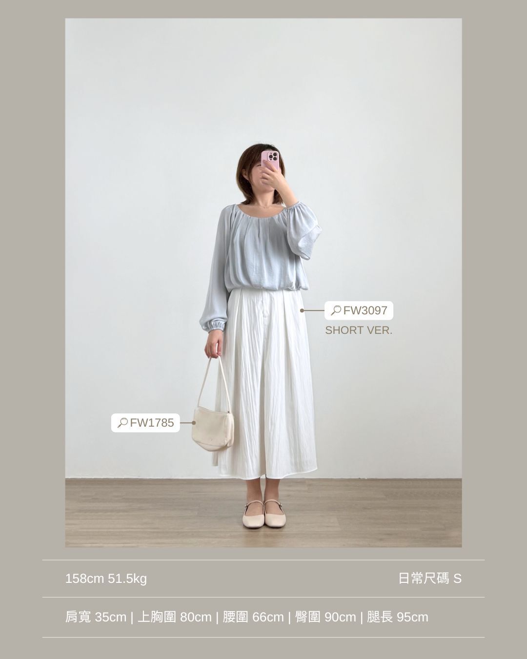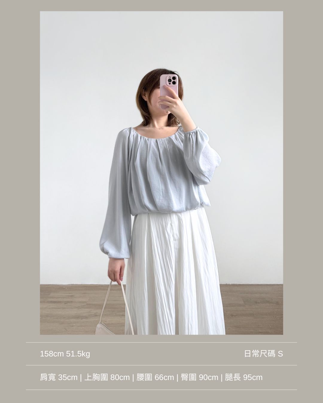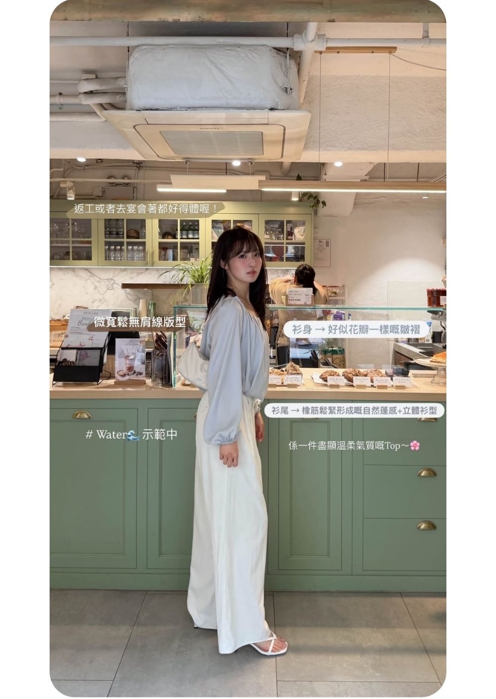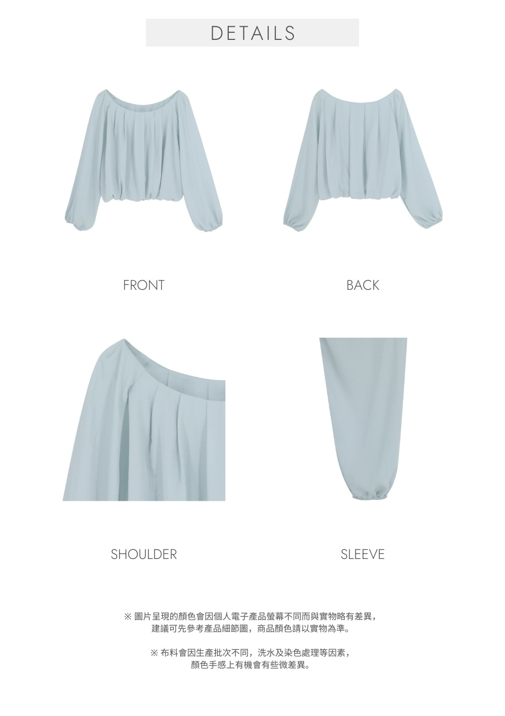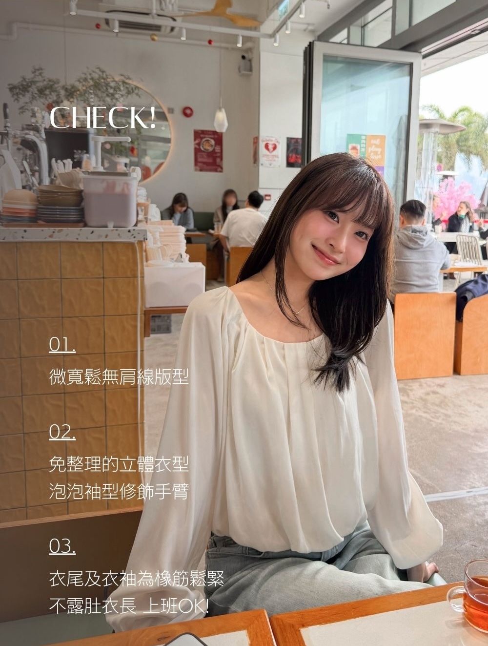 微寬鬆無肩線版型 / 突顯鎖骨 / 泡泡袖型 / 修飾手臂