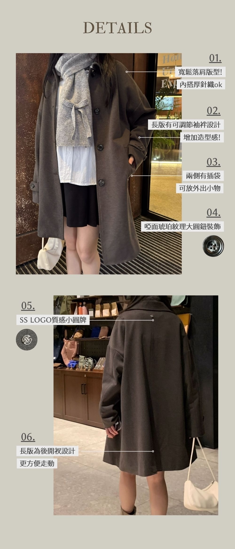 ⋄ 長版為後開衩設計 方便走動