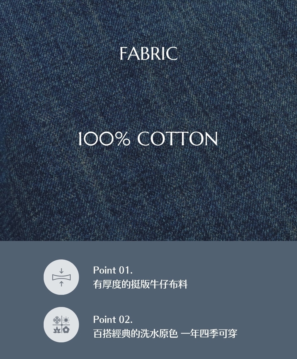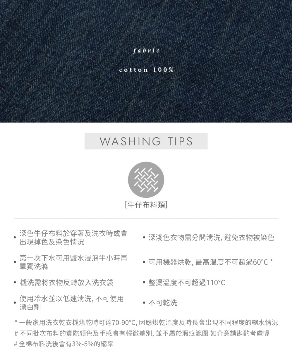 ※ 深色牛仔布料於穿著及洗衣時均會出現掉色情況,屬正常現象