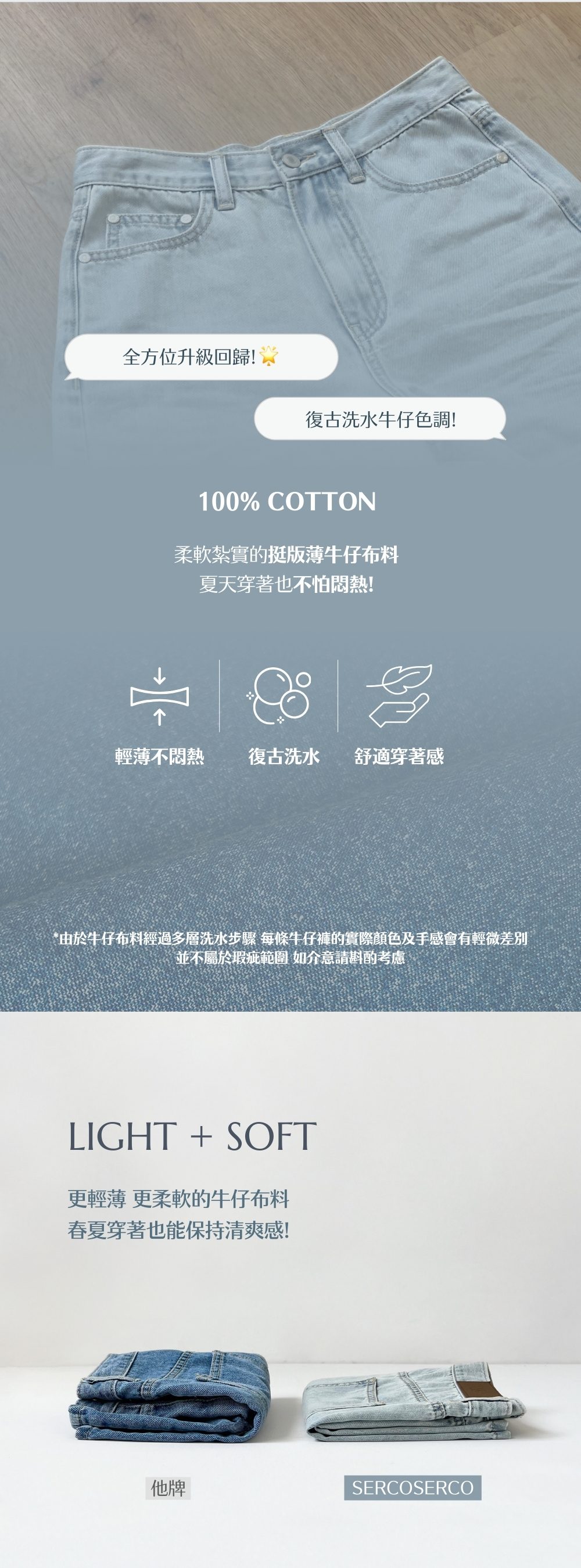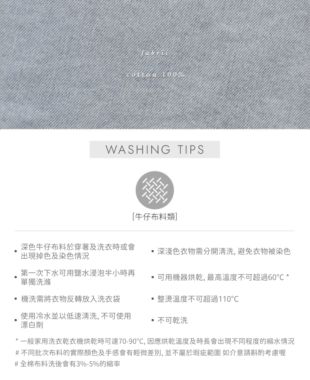 ※ 深色牛仔布料於穿著及洗衣時均會出現掉色情況,屬正常現象