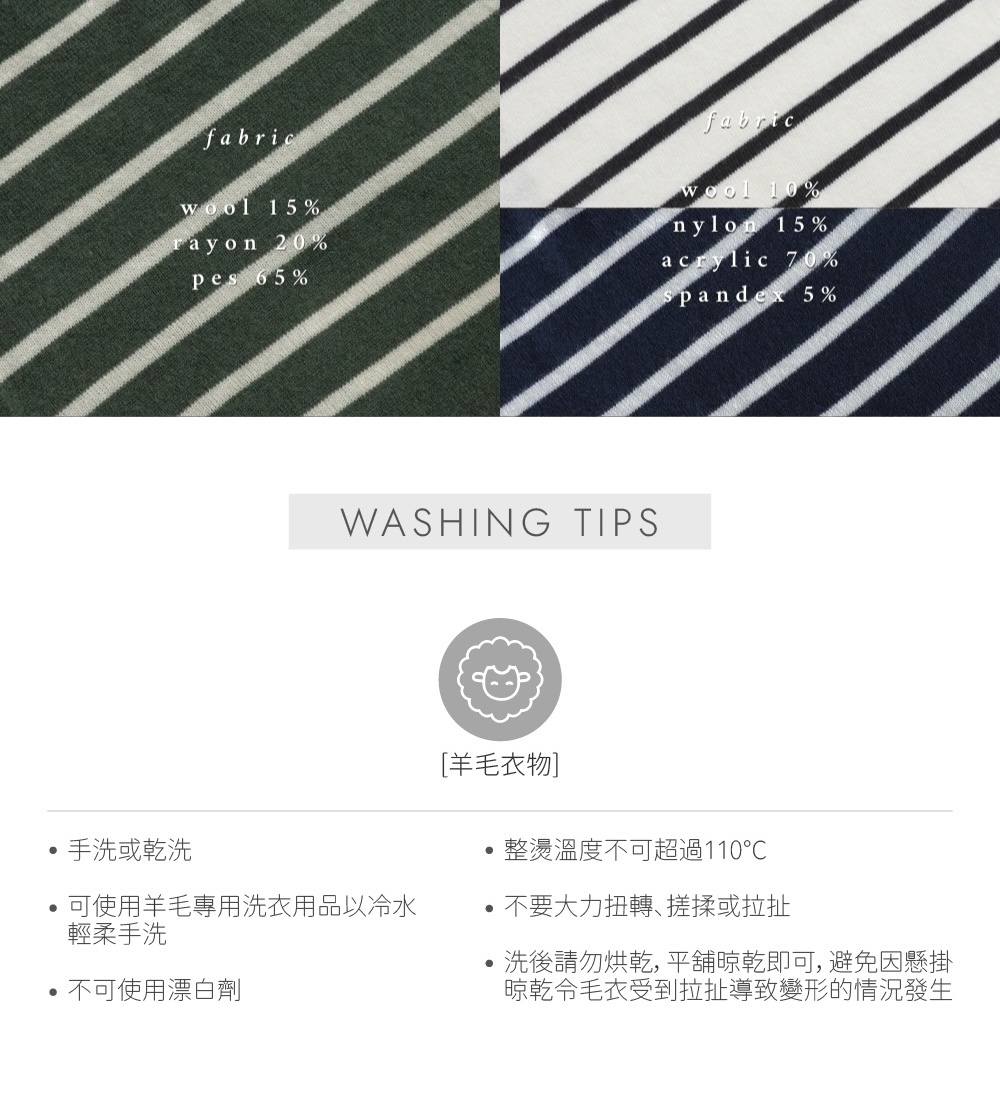 ※ 羊毛衣物建議手洗 / 乾洗,可於清洗前查閱下方洗滌資訊