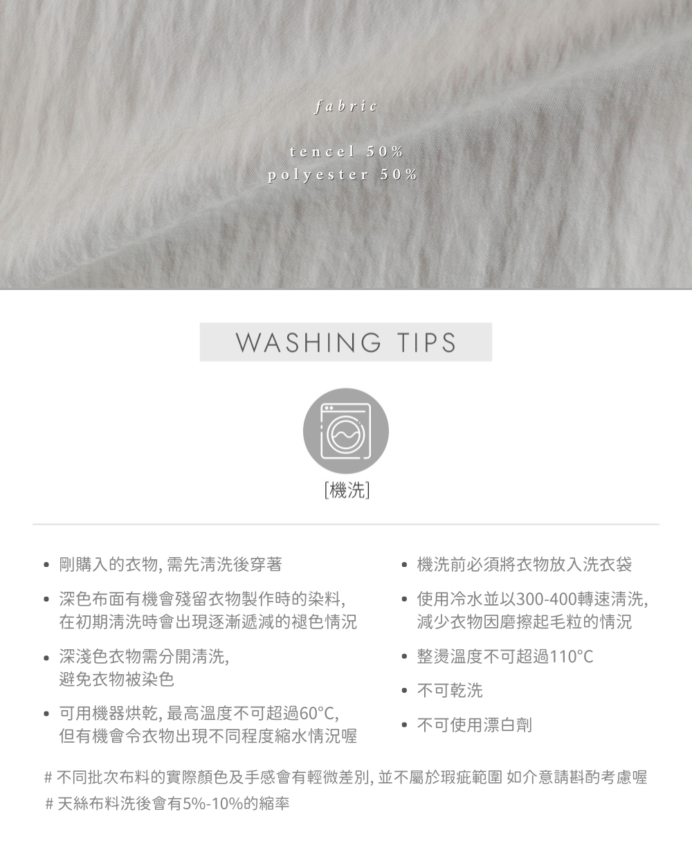※ 布料在初期清洗是會褪去表層顏色,形成深淺不一的洗水效果,此為設計特點喔