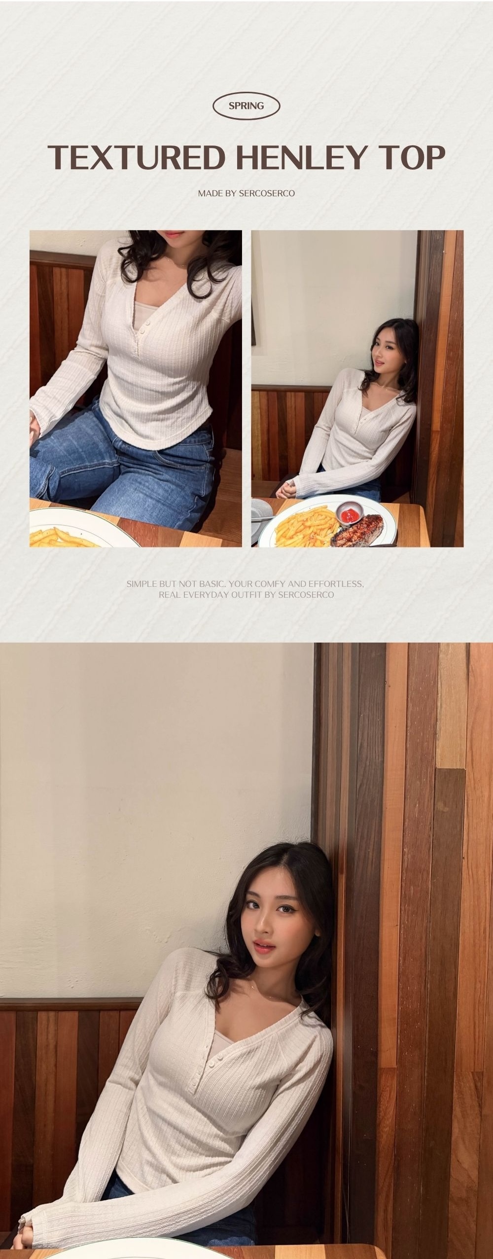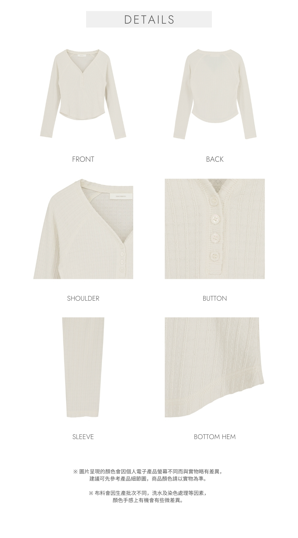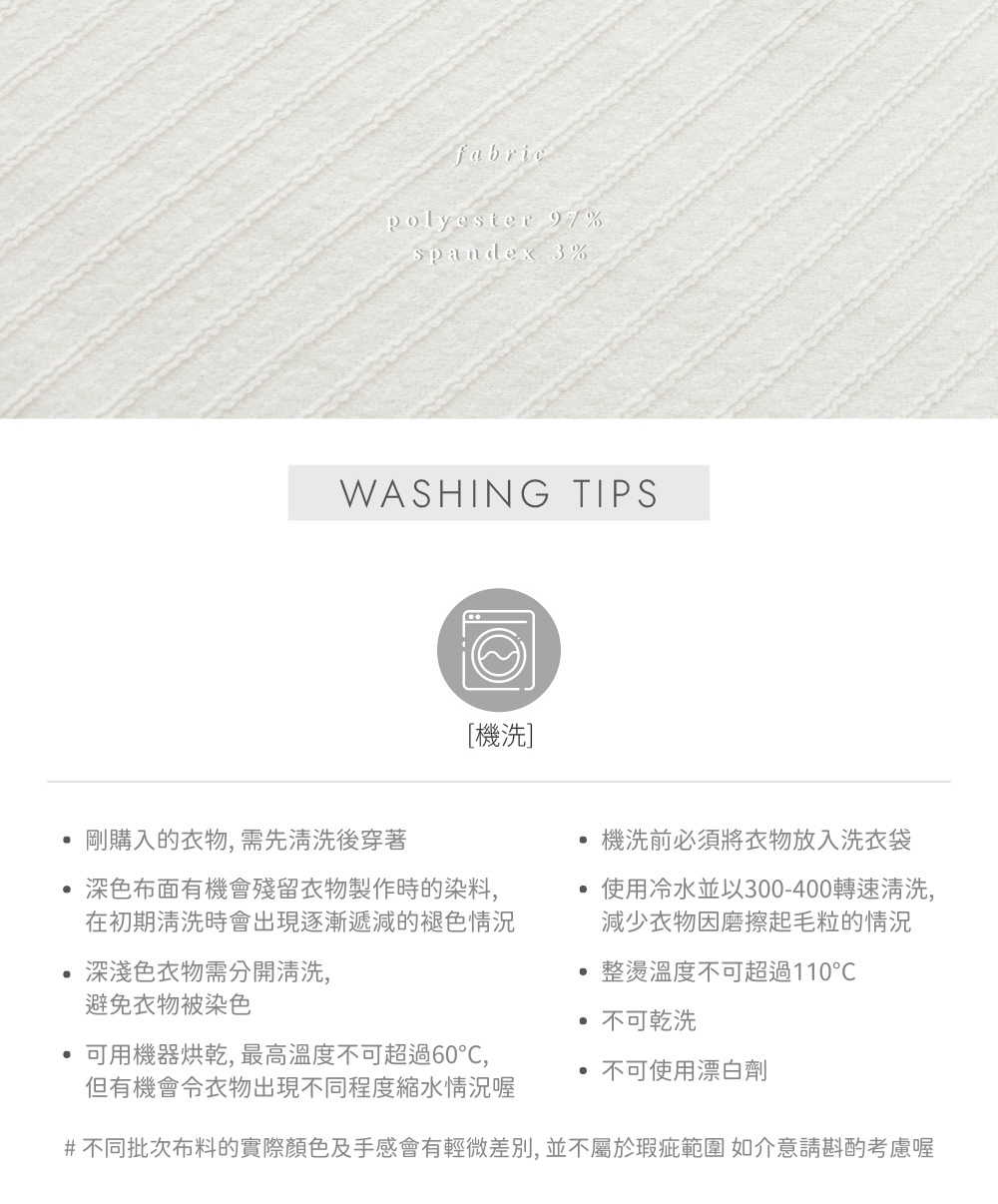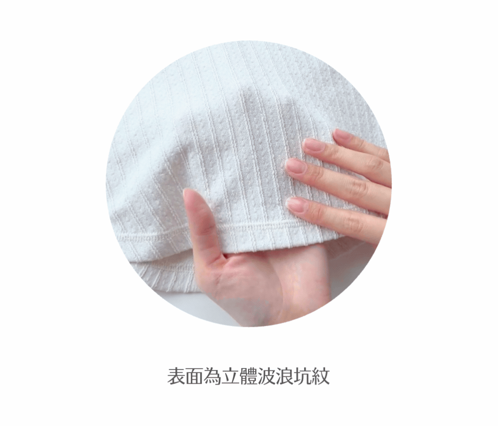 中等偏薄 / 親膚質地 / 立體波浪坑紋 / 同色系小圓鈕 /