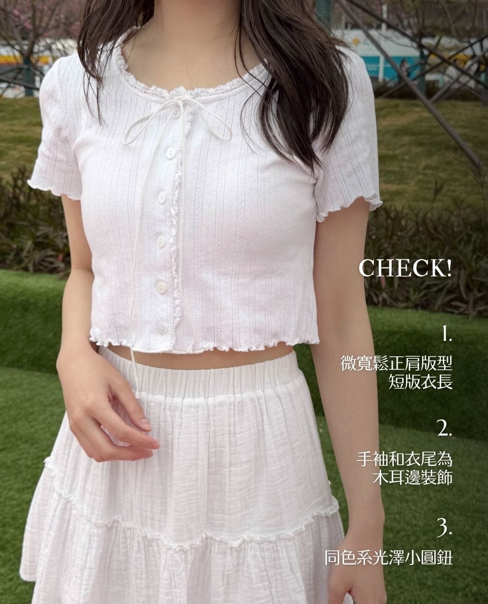 微寬鬆正肩版型 / 短版衣長 / 手袖和衣尾為木耳邊裝飾 / 顯直角肩 / 修飾手臂