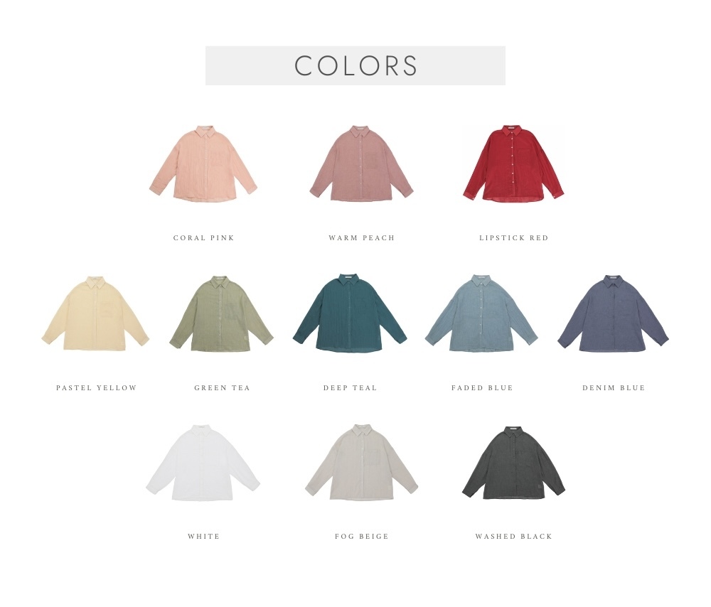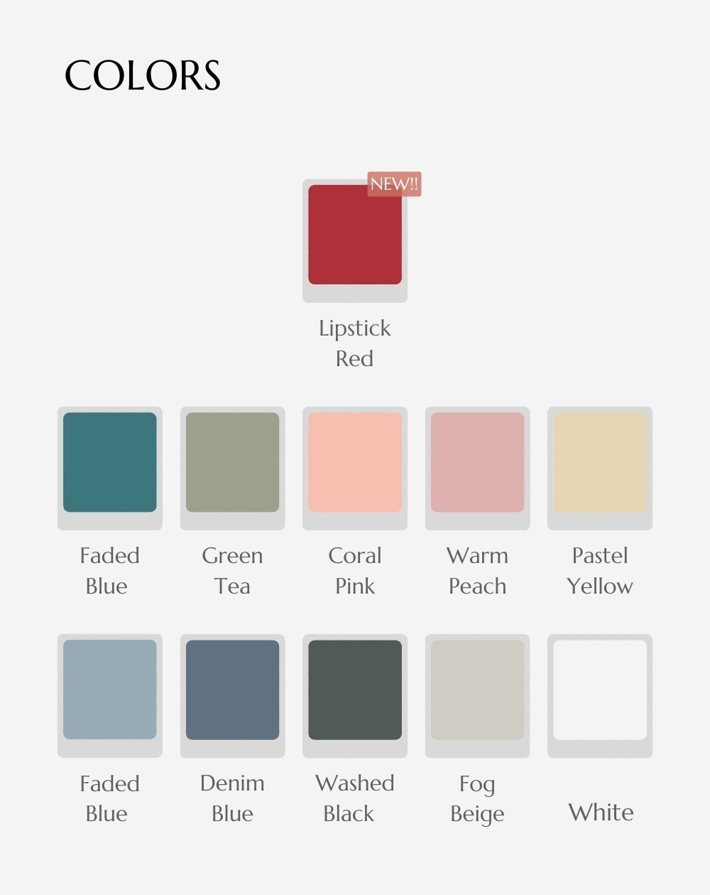 白 > 杏黃 = 綠茶 > 夏日紅 > 淺牛仔藍 > 珊瑚粉 > 米灰 > 深牛仔藍 > 孔雀綠 > 煙霧黑 = 蜜桃粉
