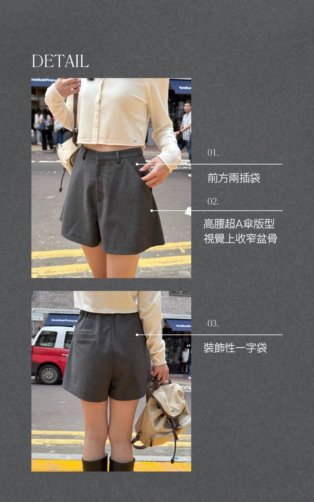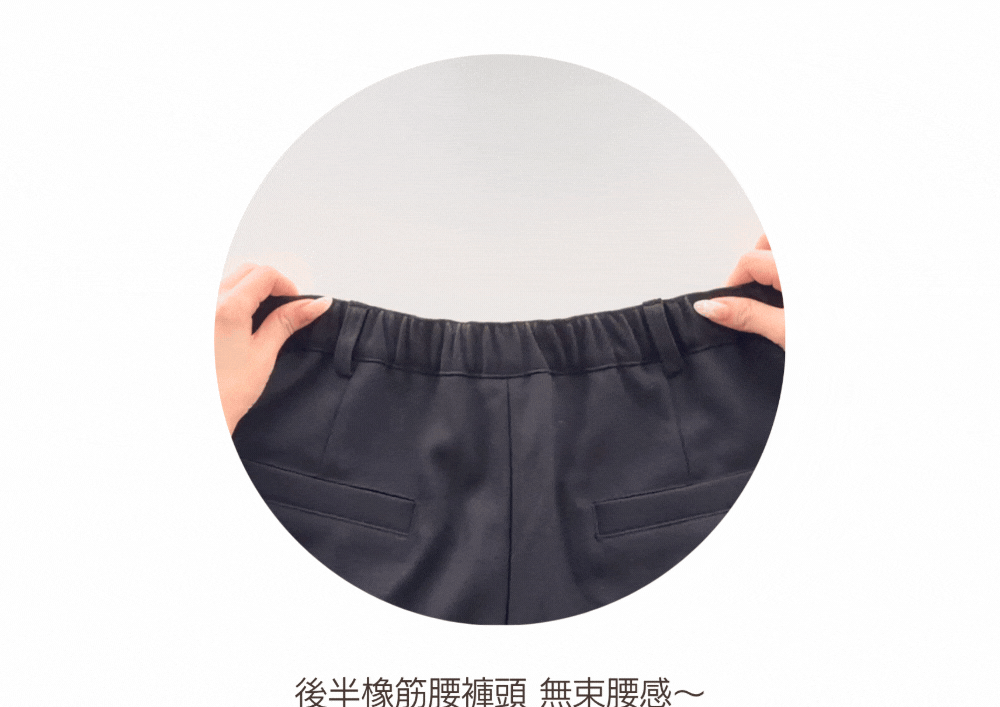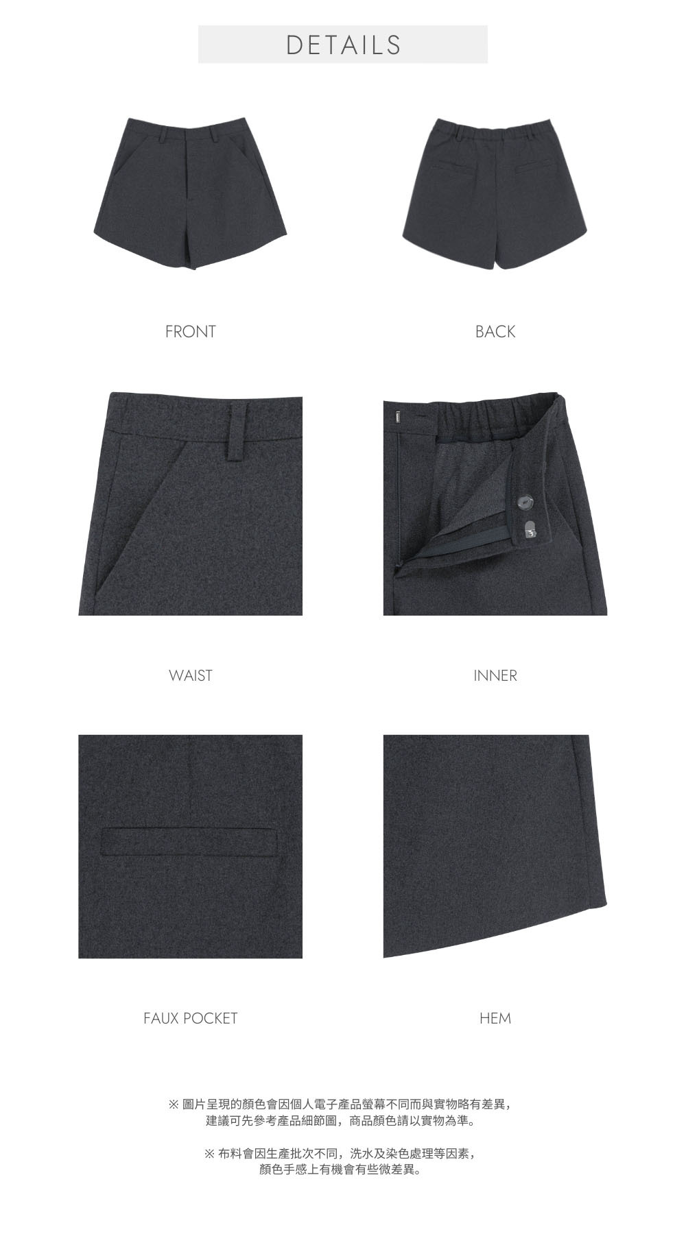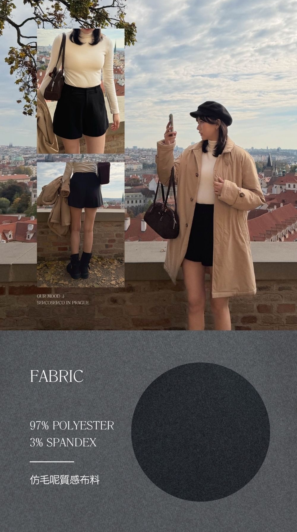 中等厚度 / 仿毛呢質感布料 / 前方兩插袋 / 後半橡筋腰褲頭 / 裝飾性一字袋 / 扣環+隱形鈕釦開合