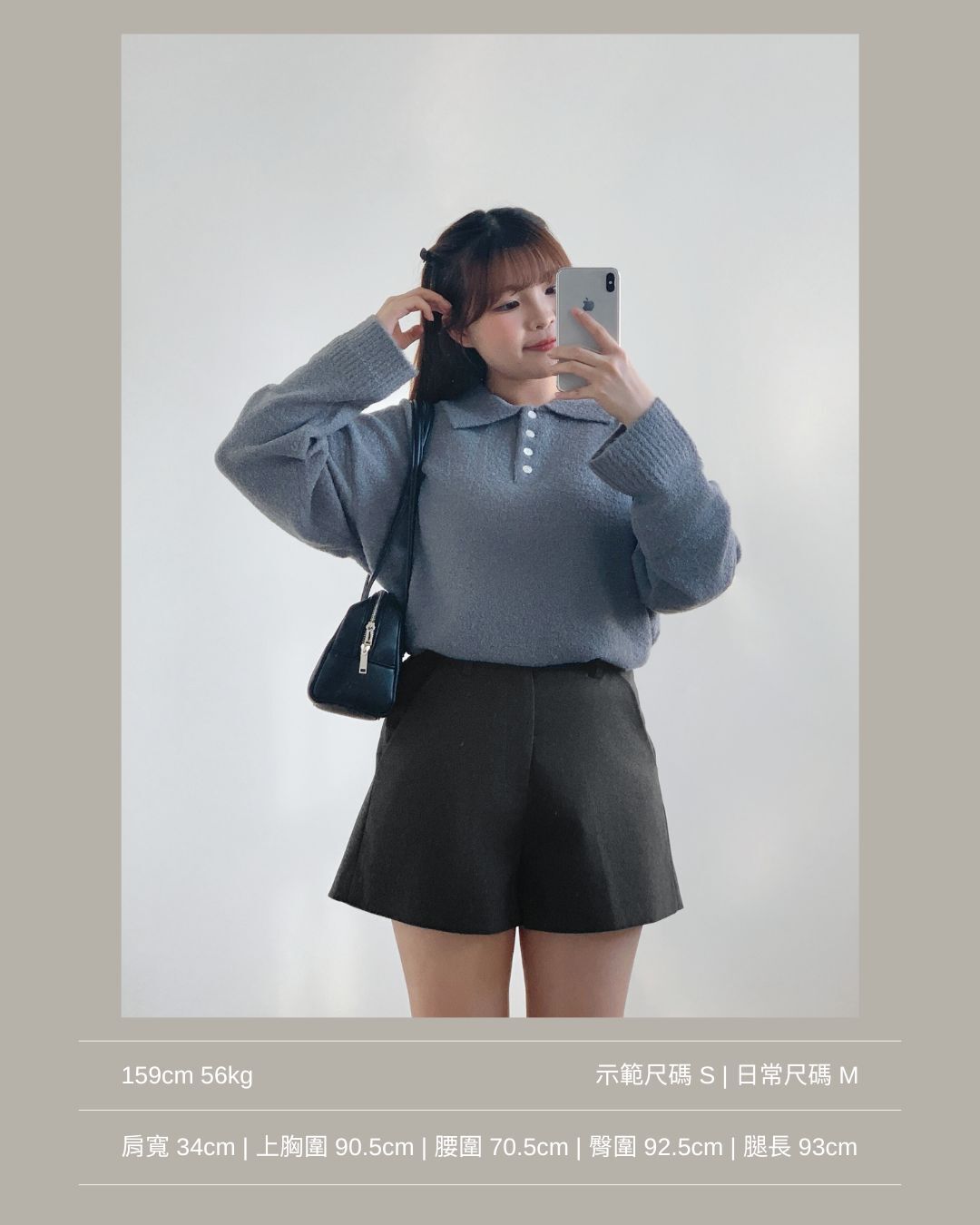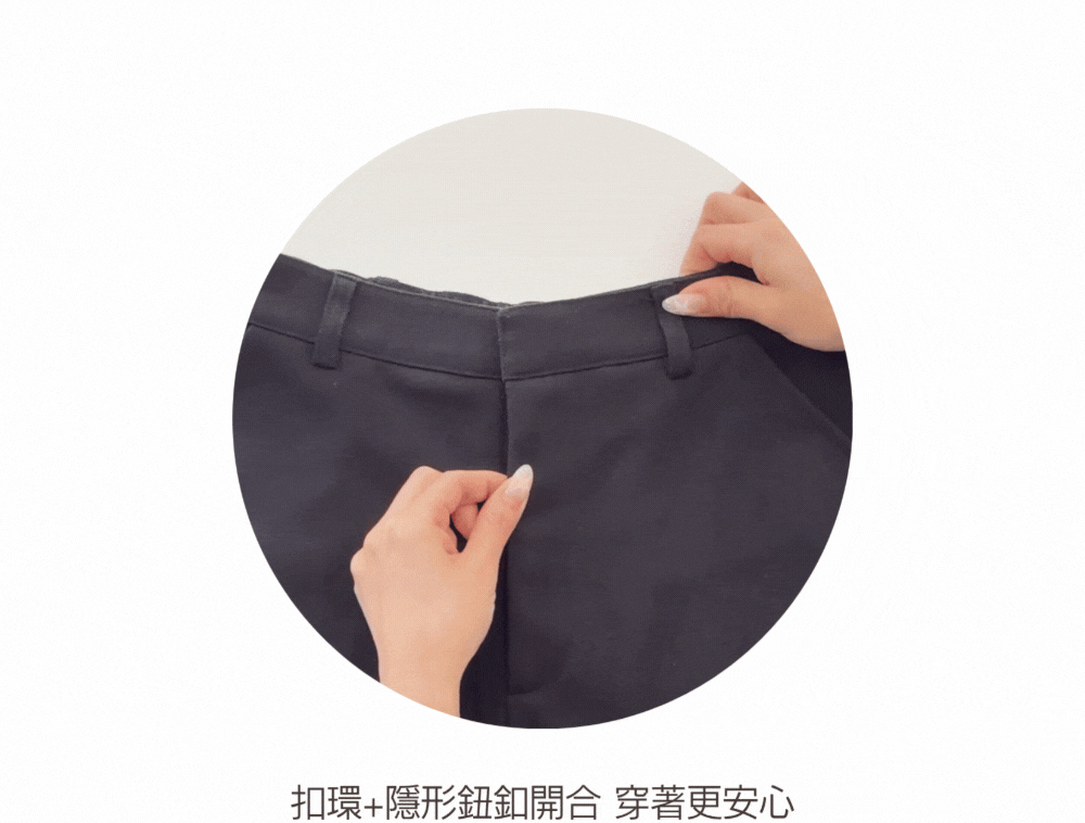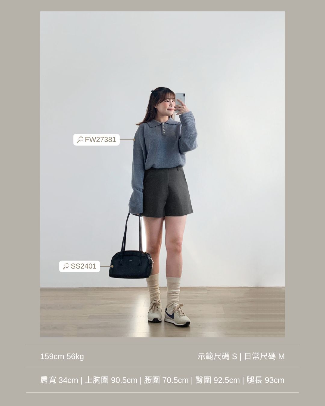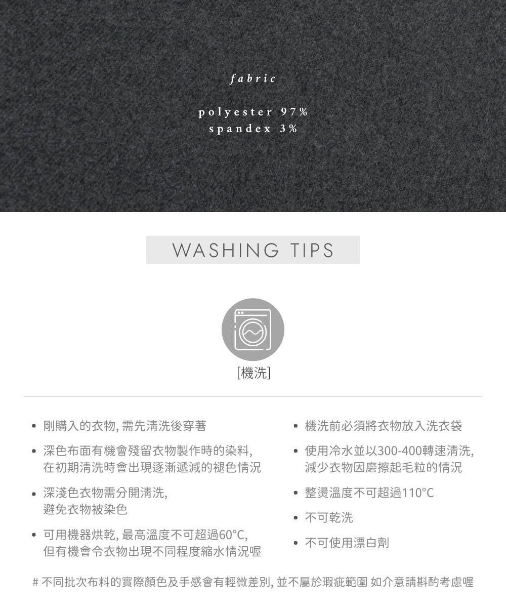 中等厚度 / 仿毛呢質感布料 / 前方兩插袋 / 後半橡筋腰褲頭 / 裝飾性一字袋 / 扣環+隱形鈕釦開合
